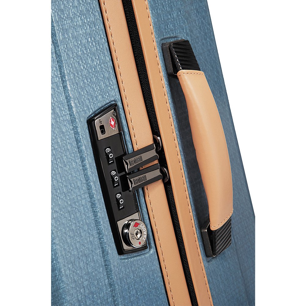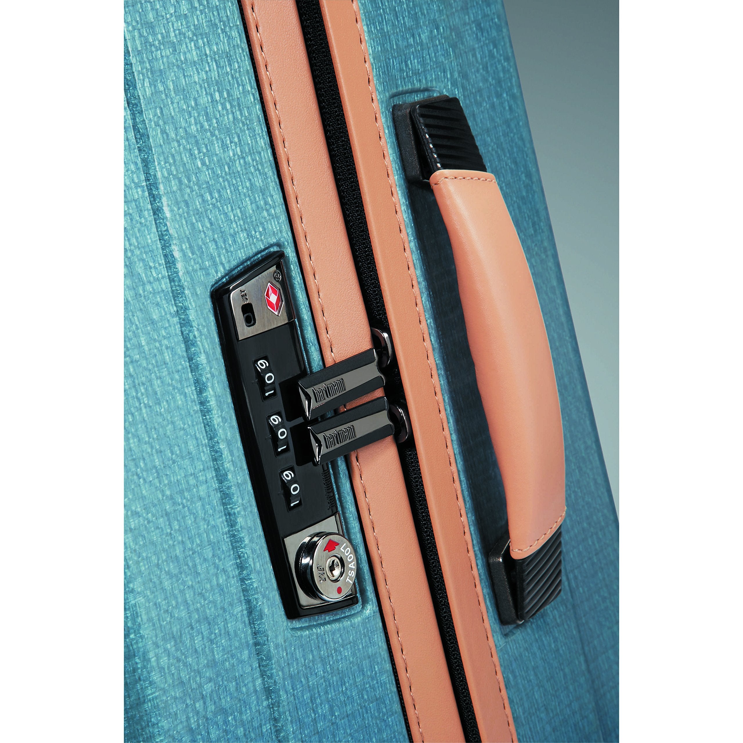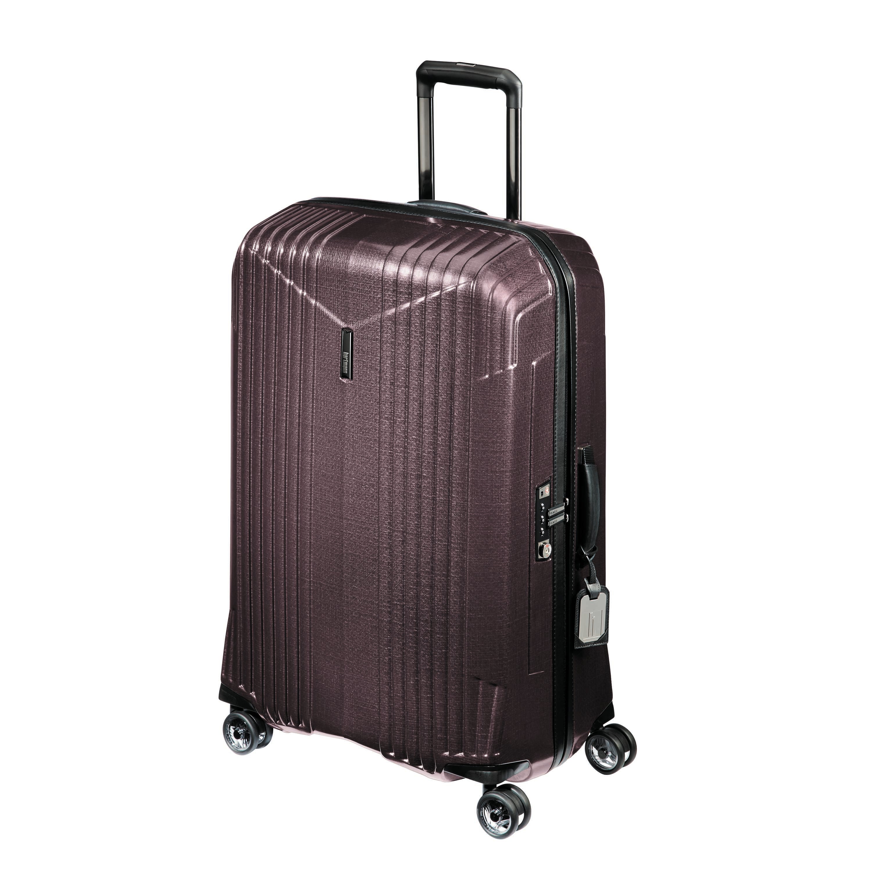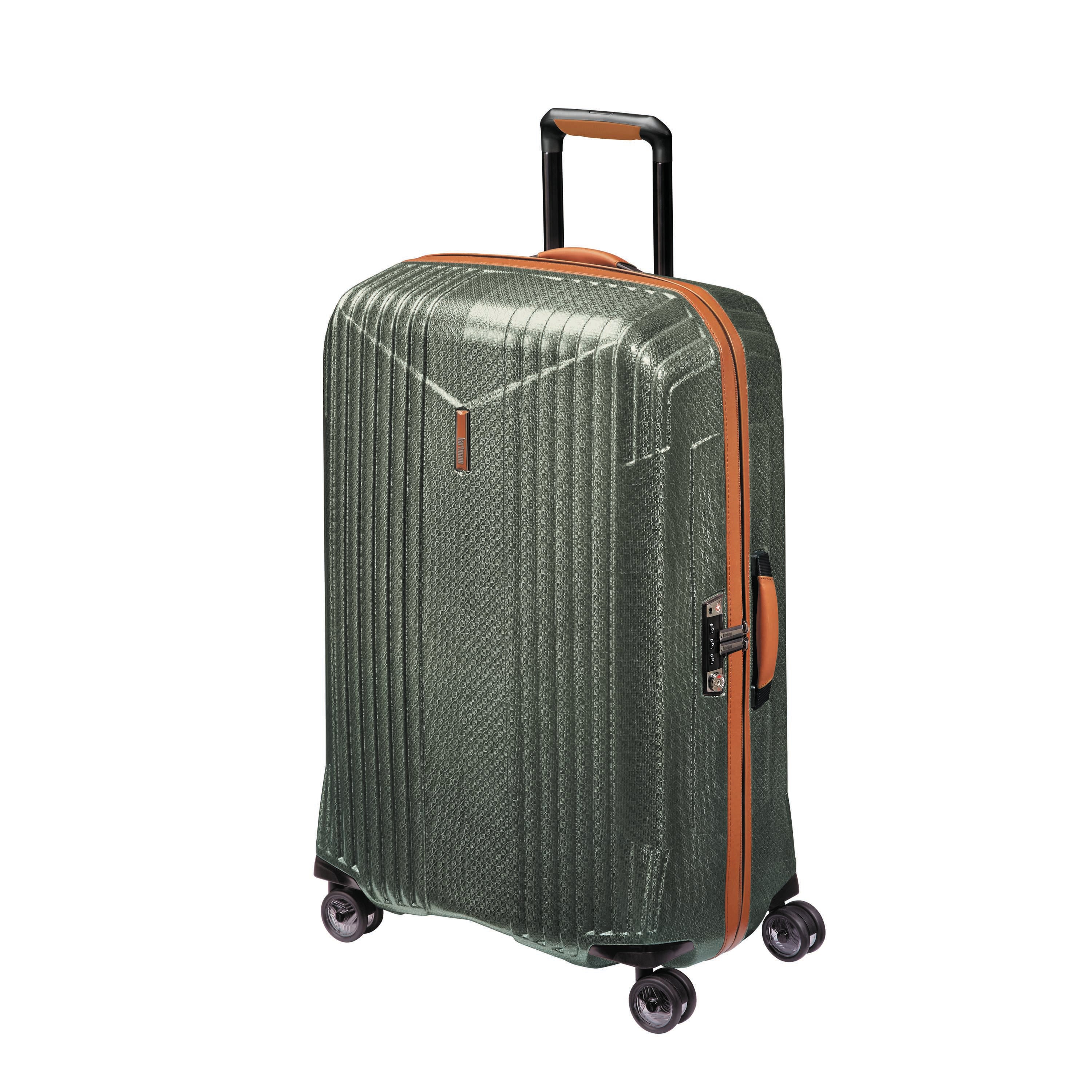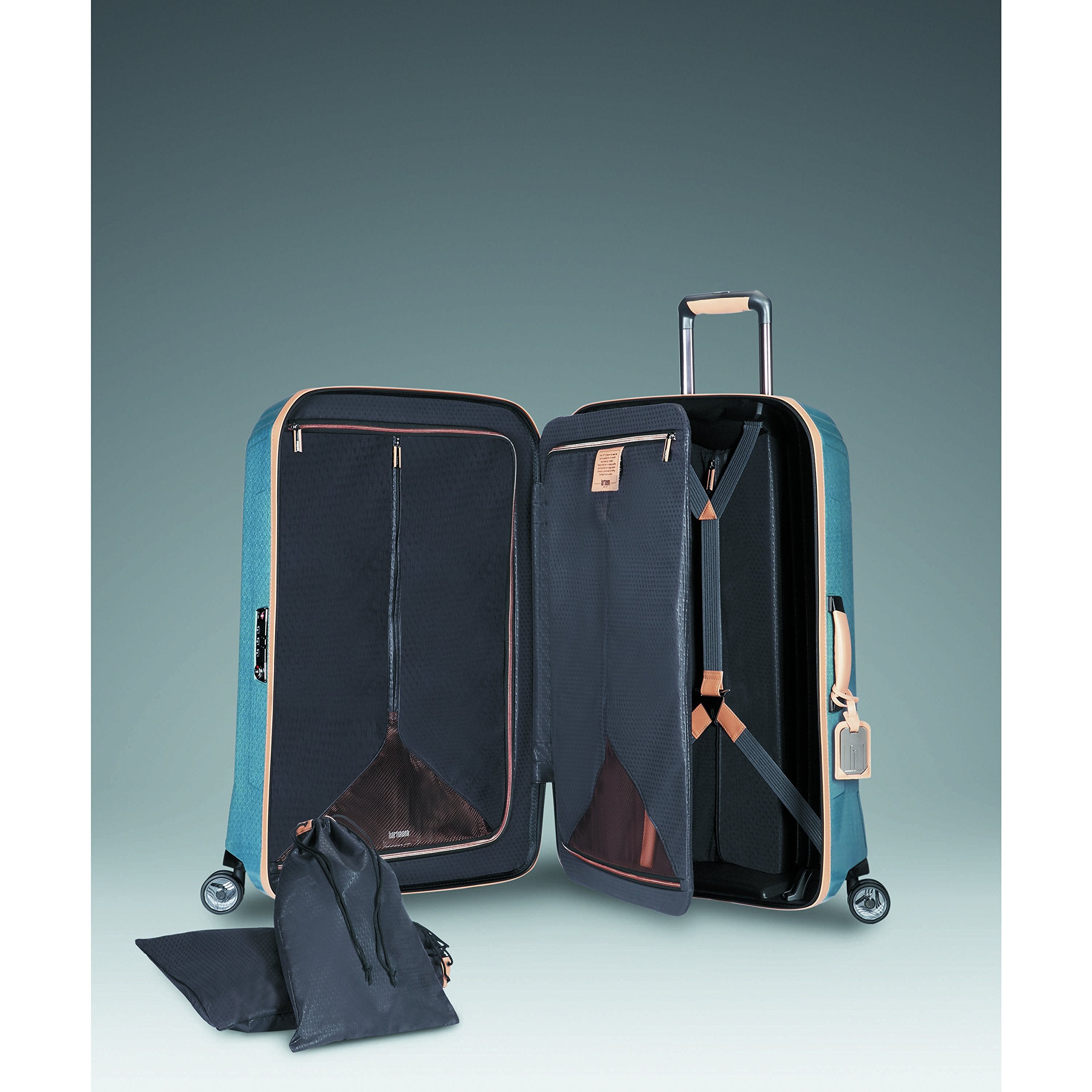 • Lightweight, scratch and impact-resistant, metalized Curv material. Exceptionally resilient, dual tube aluminum pull handle with leather grip.