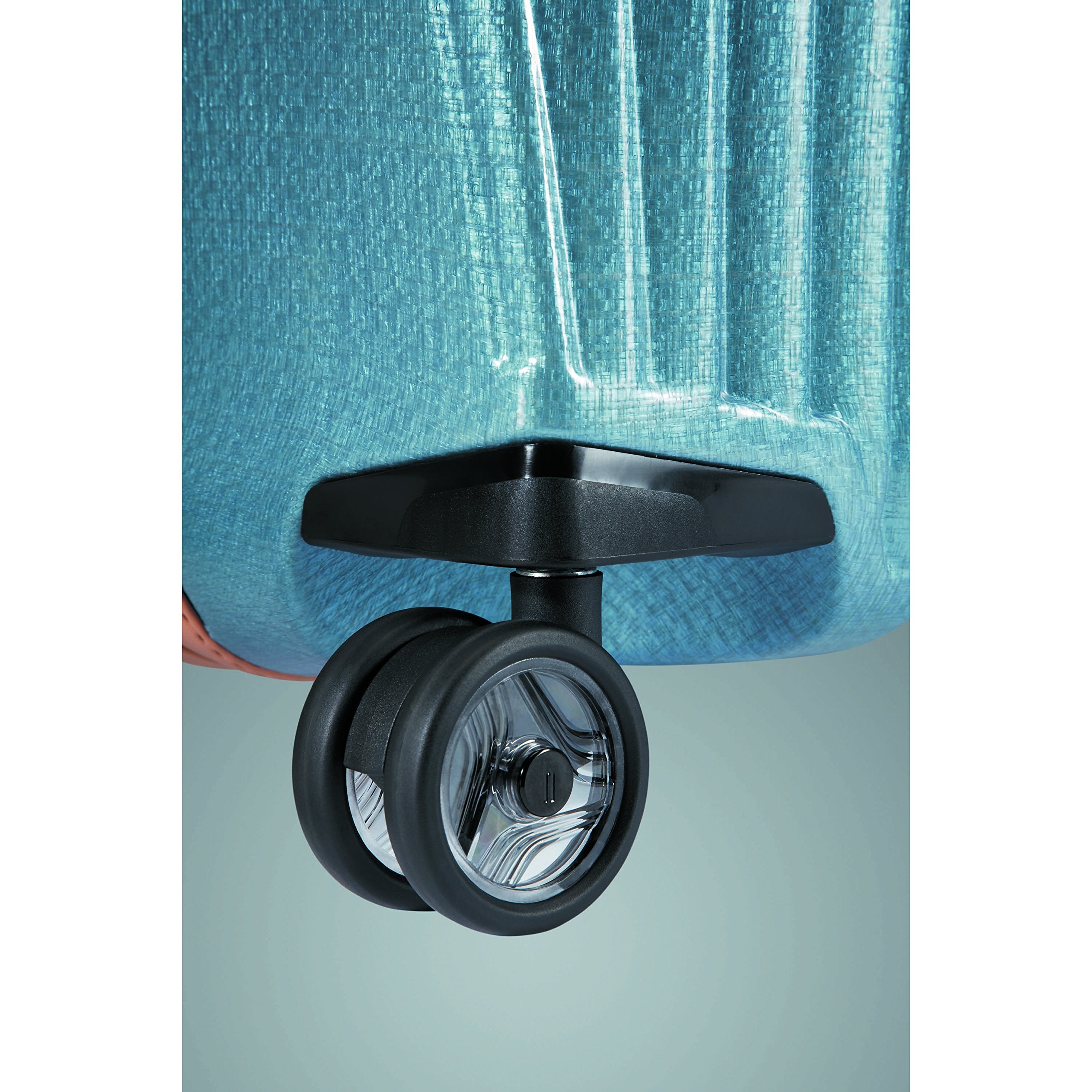 • Premium leather carry handles. Smooth rolling double wheels with translucent polycarbonate core.