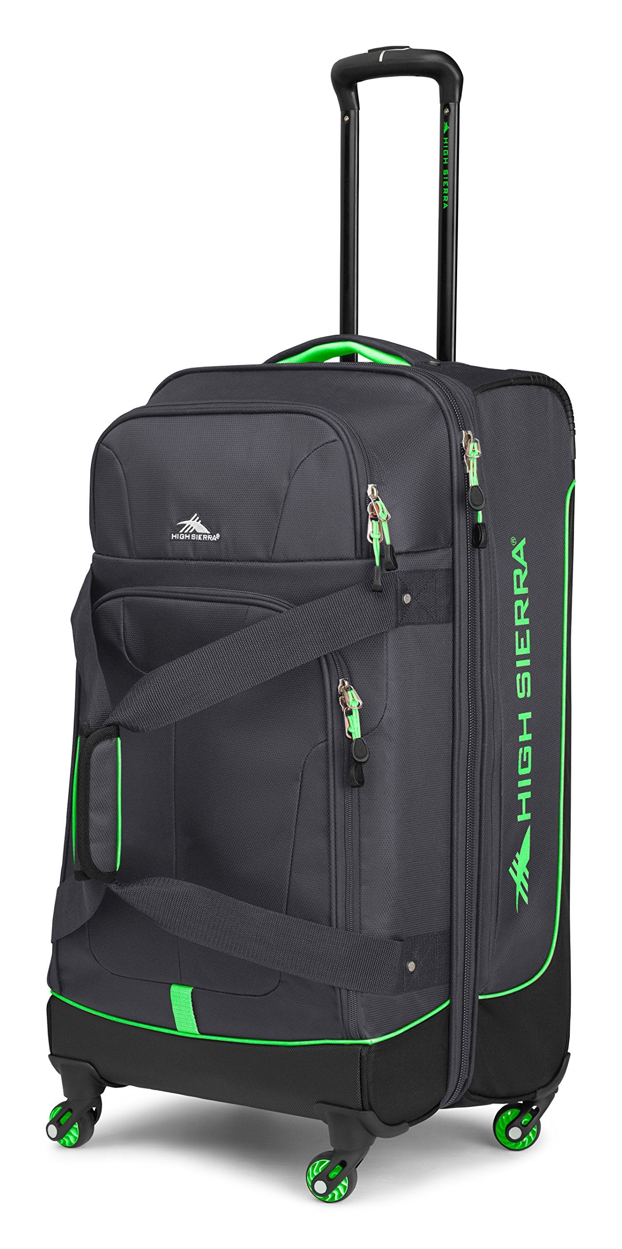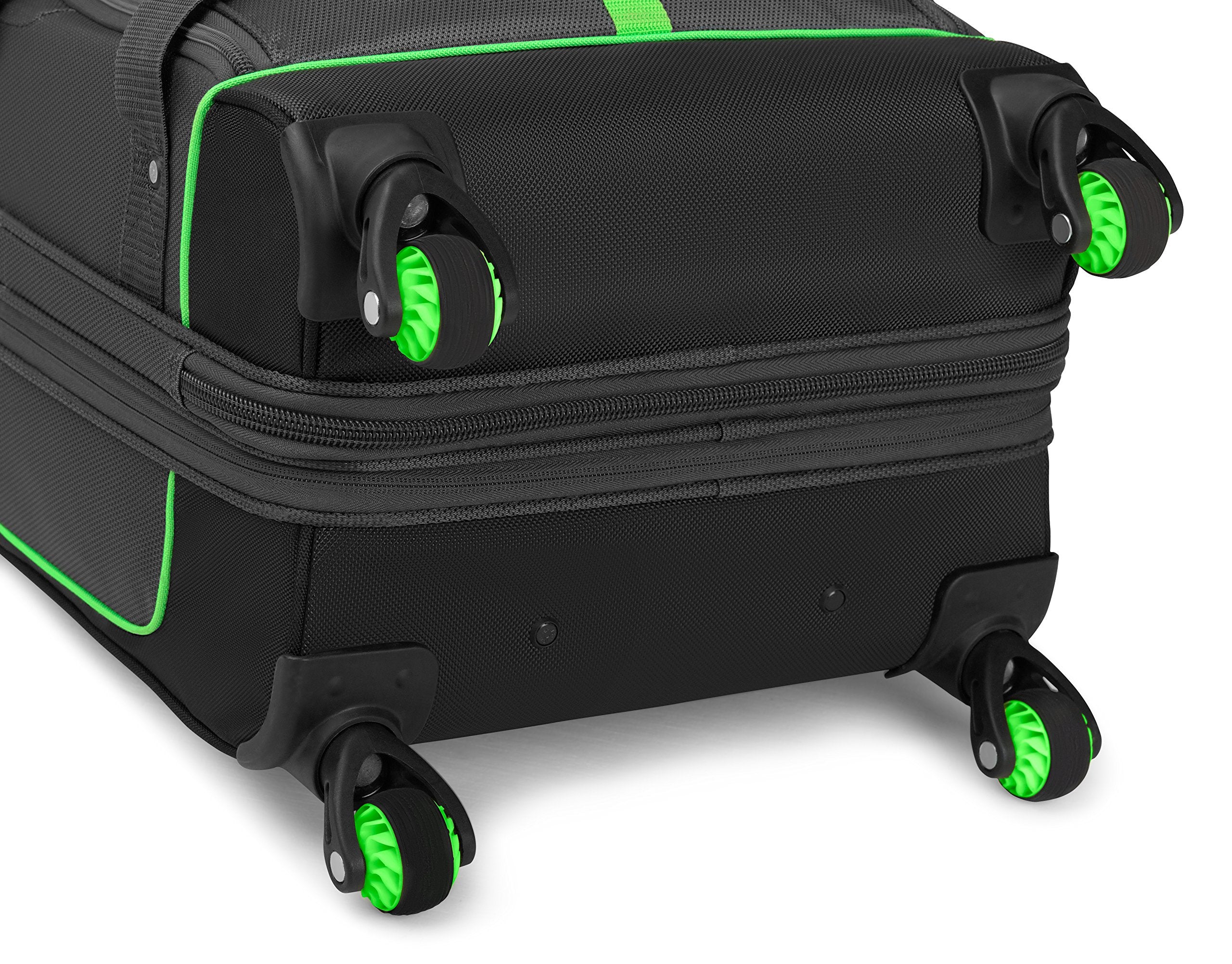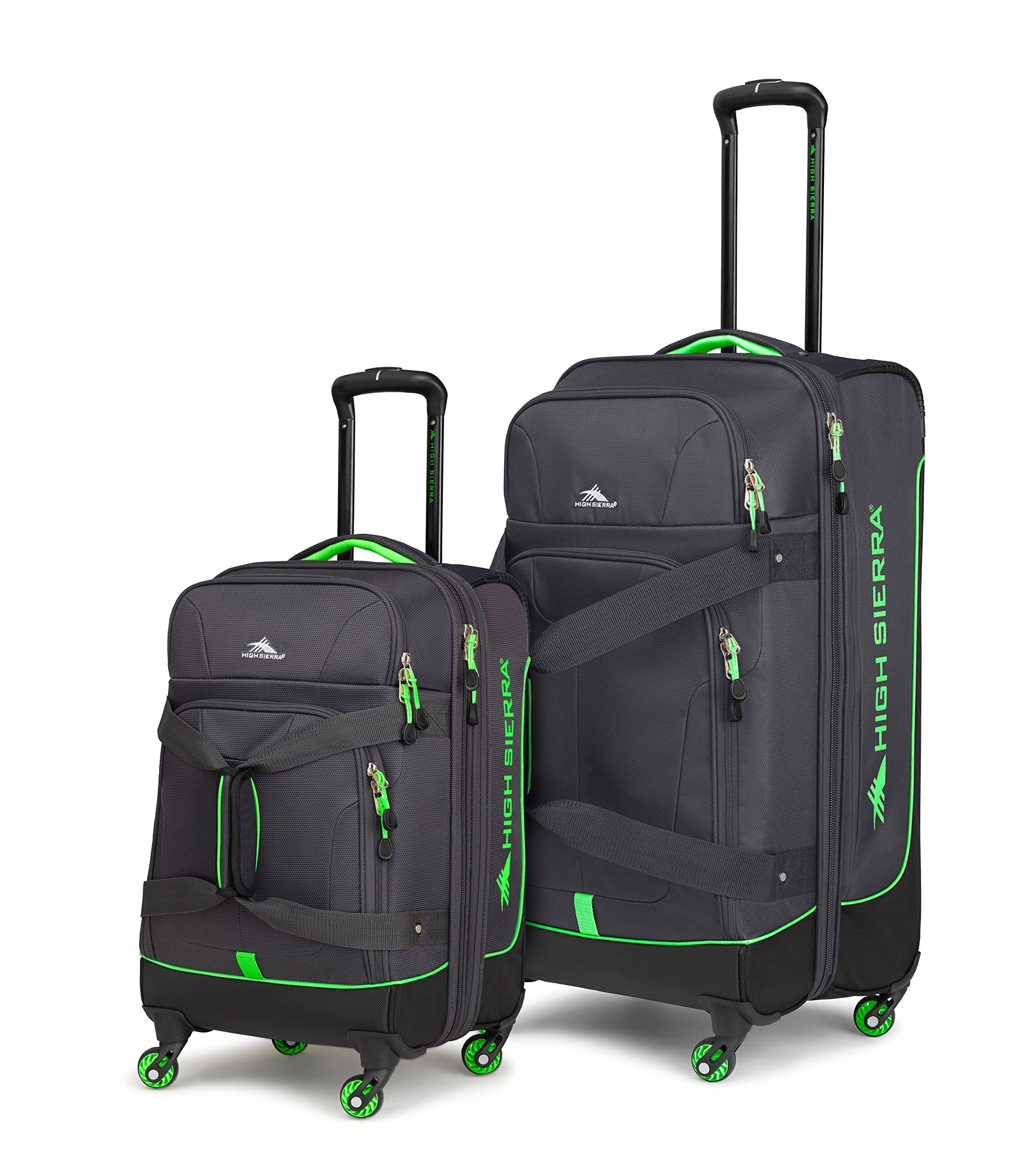 This set features a recessed, telescoping handle and convenient grab handle on top and front. Zippered mesh divider between the front and back drop-bottom compartments. Comes with a large front accessory pocket and custom ID card holder. Smooth rolling spherical spinner wheels. Zippered expansion gusset for additional capacity. Carry-on: 19.8 x 14 x 9 in. Checked roller: 26.2 x 15.5 x 12.5 in.