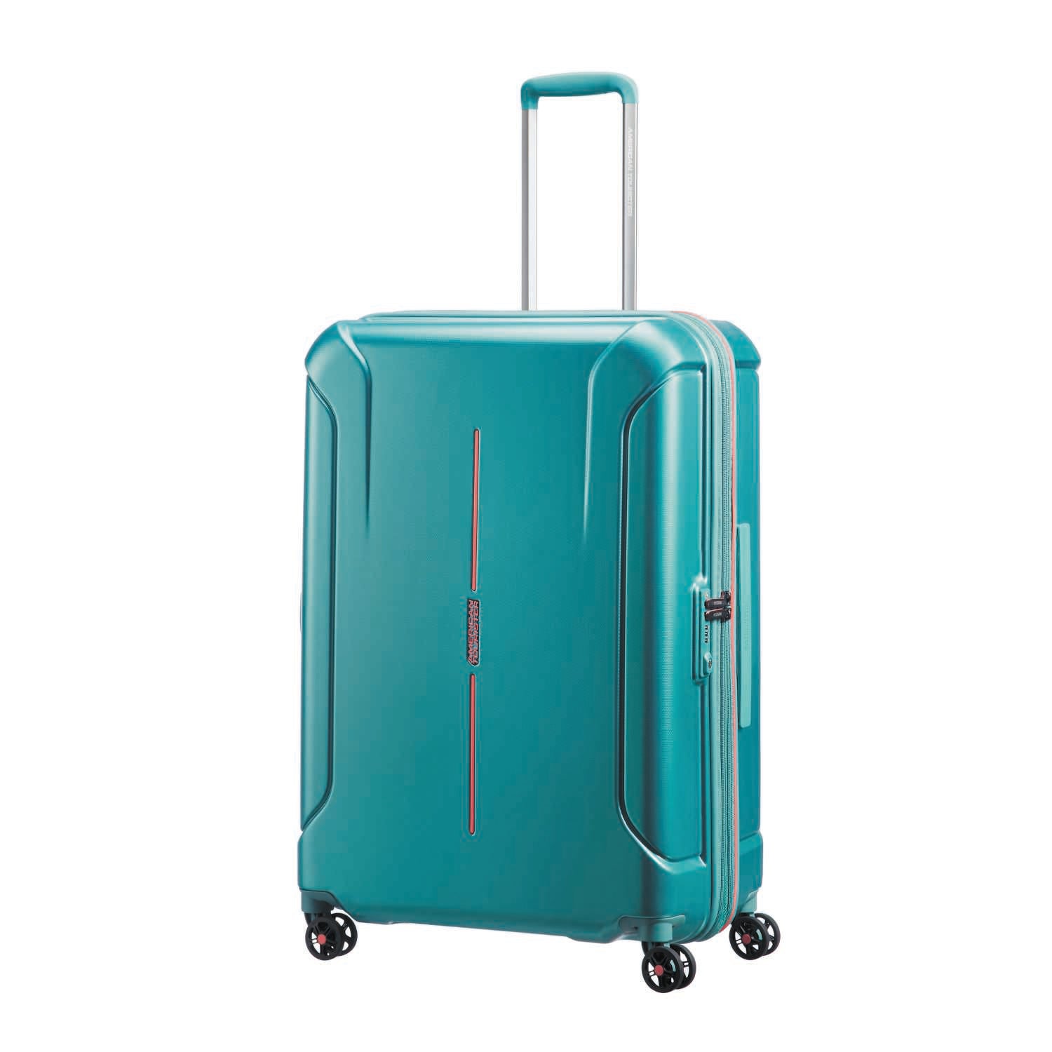 Lightweight textured polycarbonate case with American Tourister stacked logo.. Dual spinner wheels with color pop button offer both a smooth and stylish ride.. Book opening case with lining divider panel with additional packing compartments and cross straps in main compartment with a zipped modesty pocket.. Integrated TSA 3-dial lock on all cases and 1.5" expansion on all cases.. Textured carbon inspired push button locking system.
