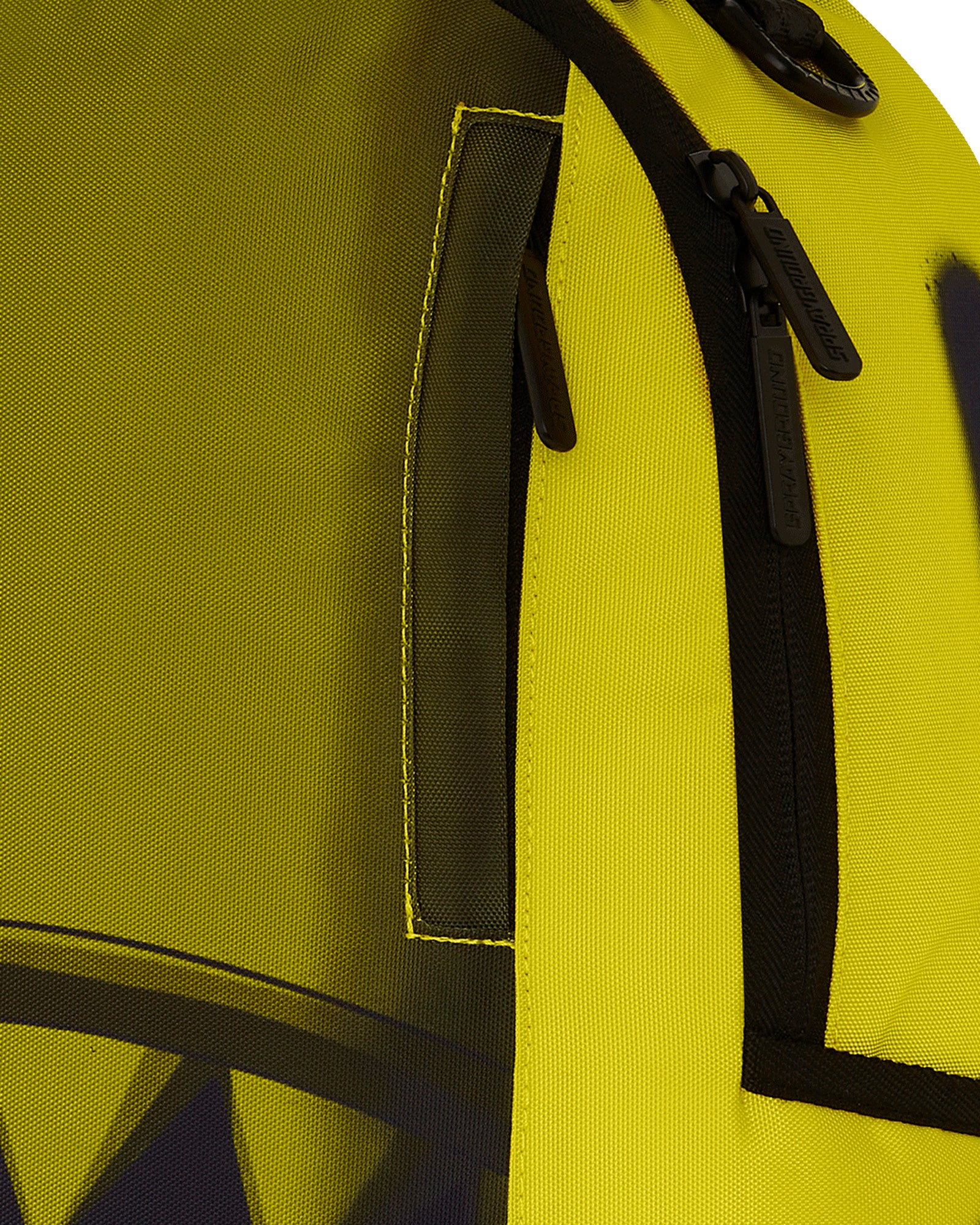 • Gold zippers with metal hardware. Metal "Sprayground Authentic" badge.