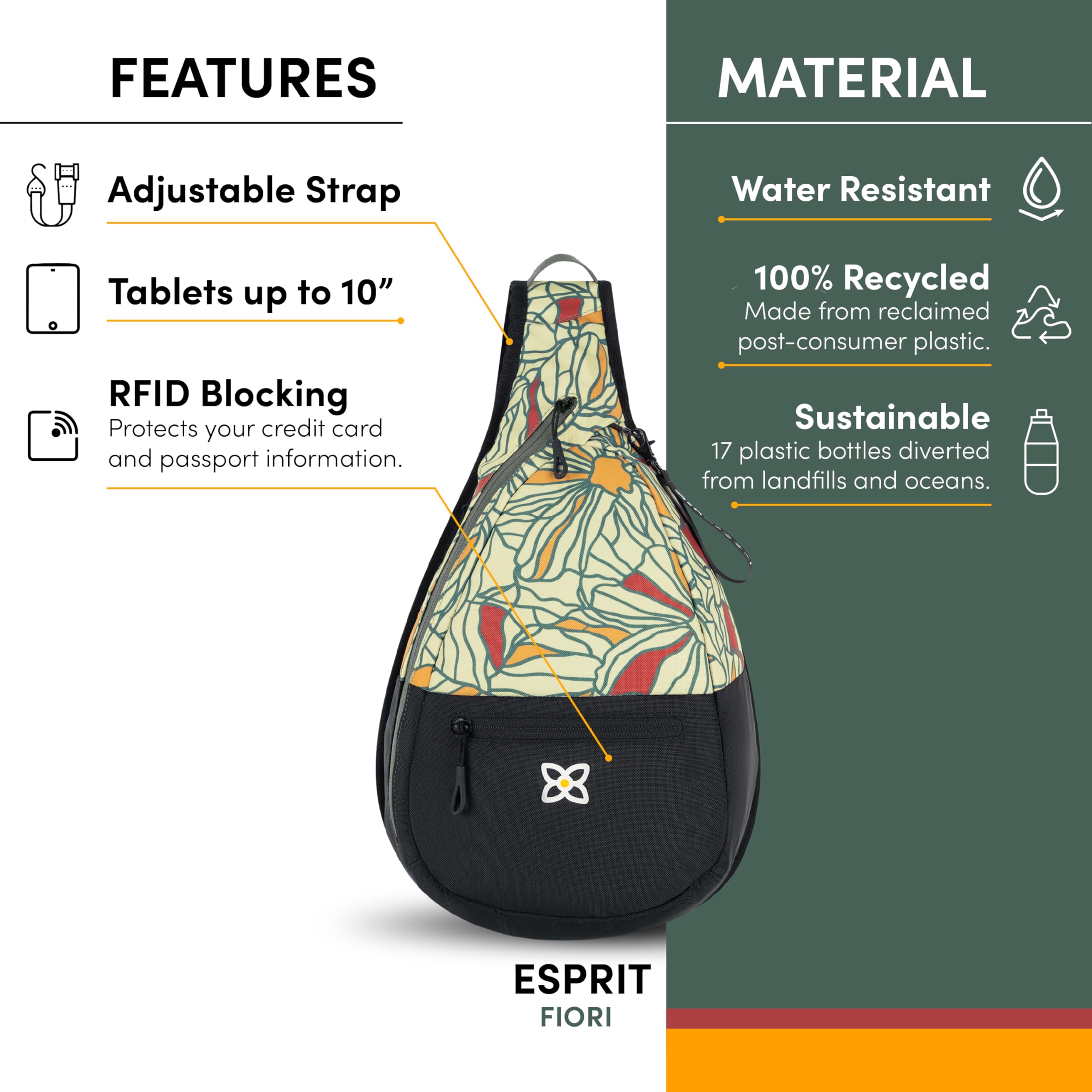 The Esprit is a modern, sling-style backpack designed to give you the freedom to multitask and stay hands-free throughout your day. Look and feel your best while hiking up the local trails or running around town in our made-for-comfort Esprit sling.