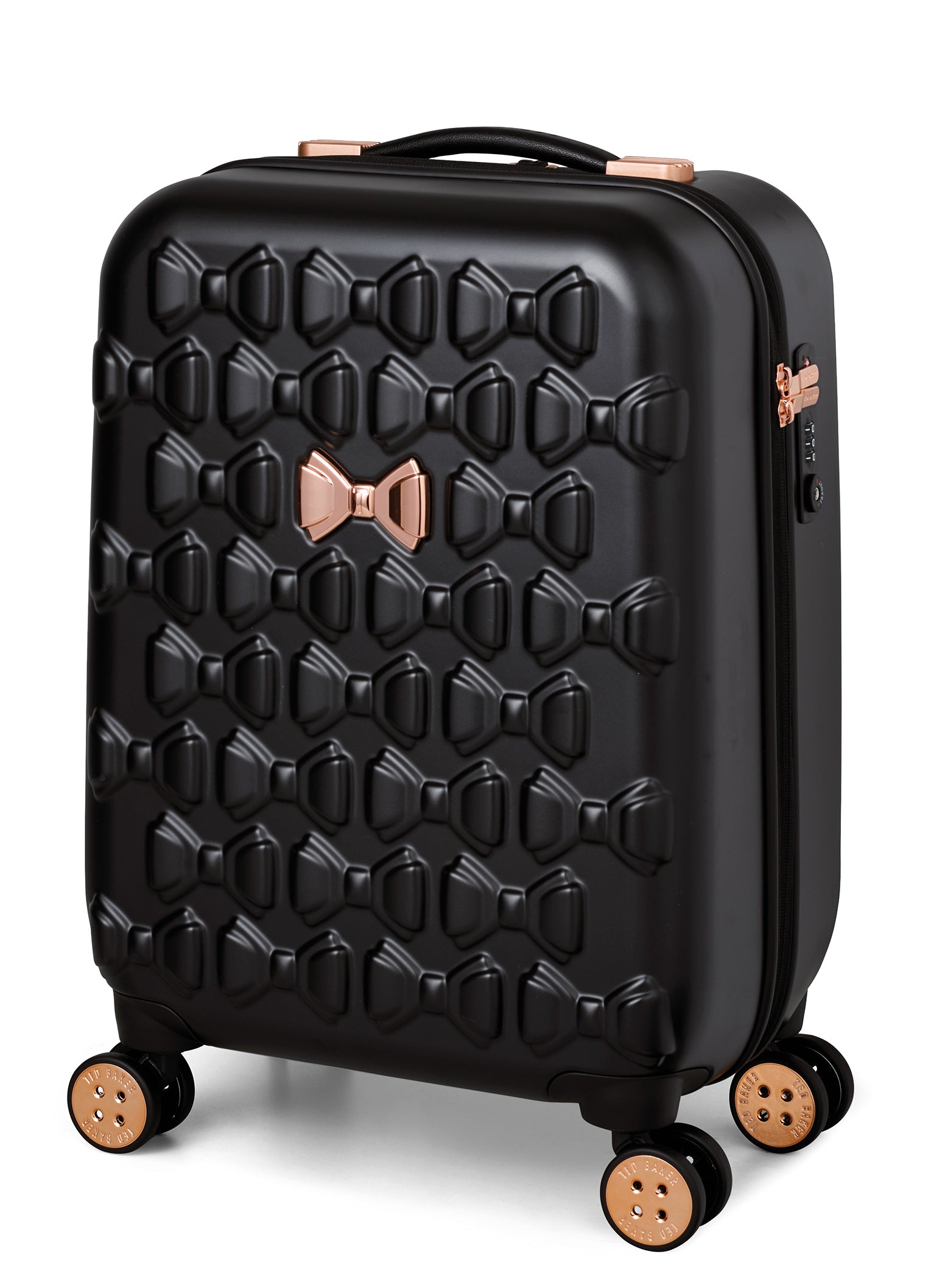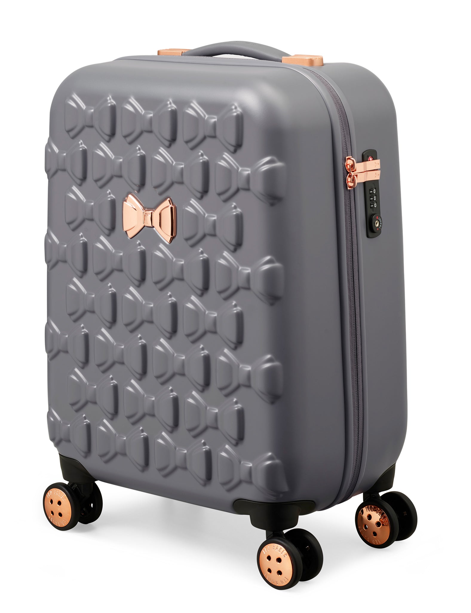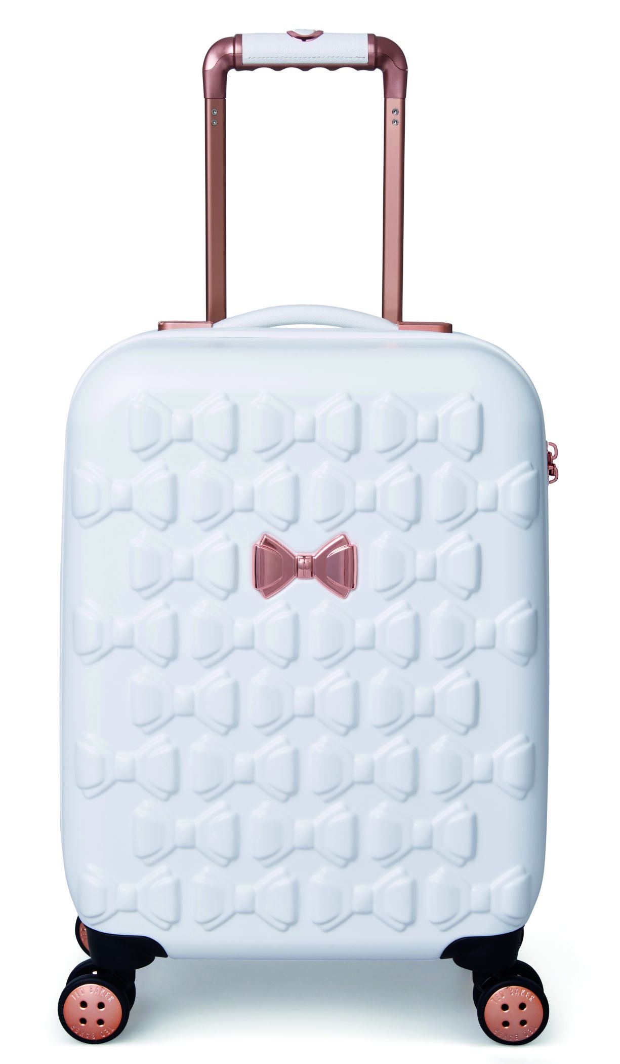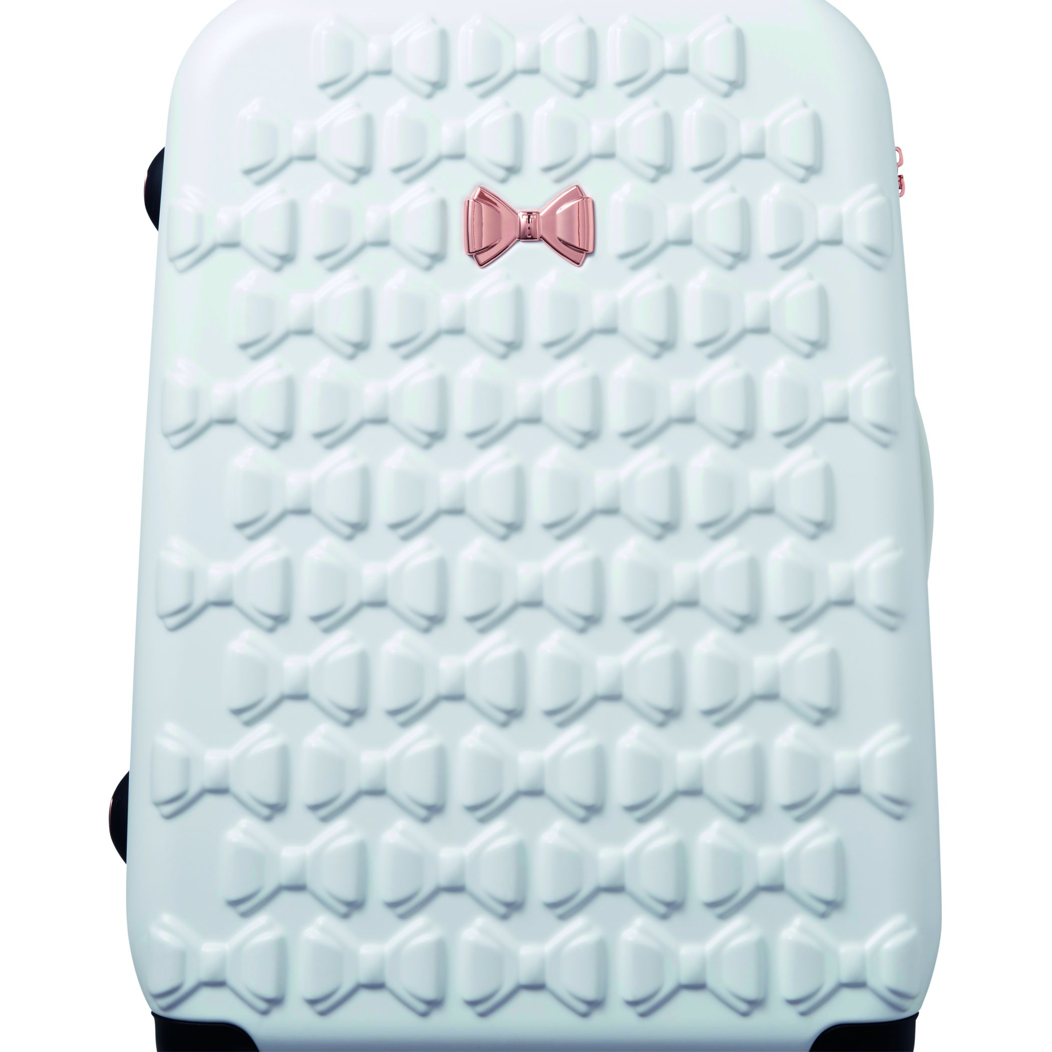 Inspired by Teds love of the bow, Beaus unique and distinctive moulded shell is made from lightweight and shock resistant polycarbonate. The satin texture finish reduces signs of scuffs and scratches to keep Beau looking timeless and elegant. The single Ted Baker branded rose gold bow takes centre stage and is complimented by signature rose gold hard wear, aircraft grade aluminium trolley system and iconic logo button hubcaps. The four smooth rolling double wheels make for ultimate and stable 360 degree manoeuvrability. All wheeled pieces come with integrated TSA combination lock.