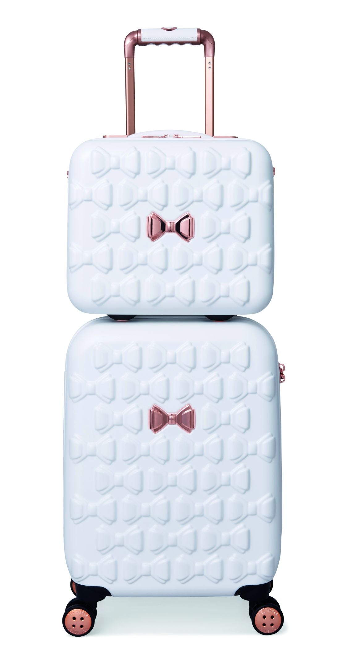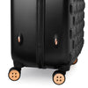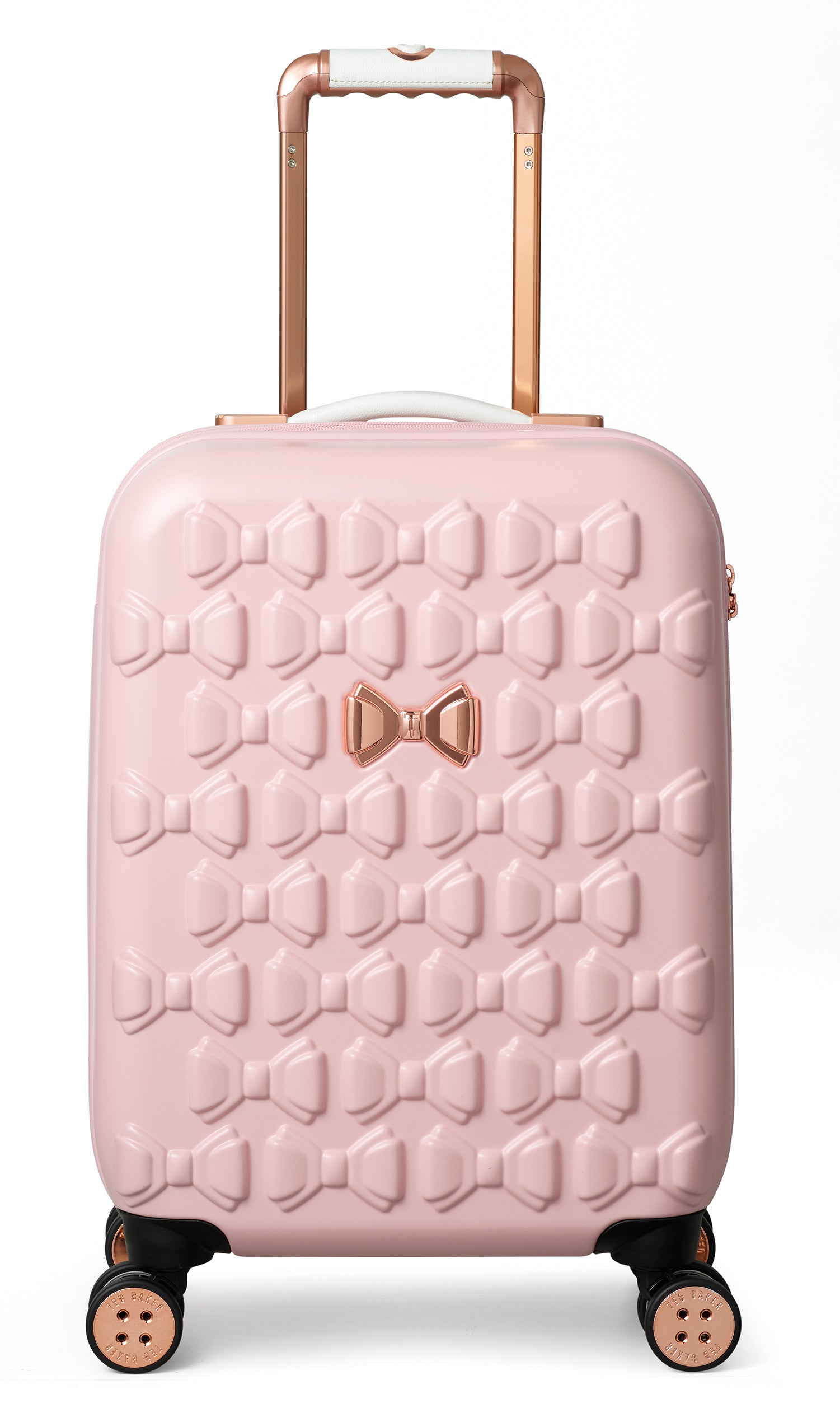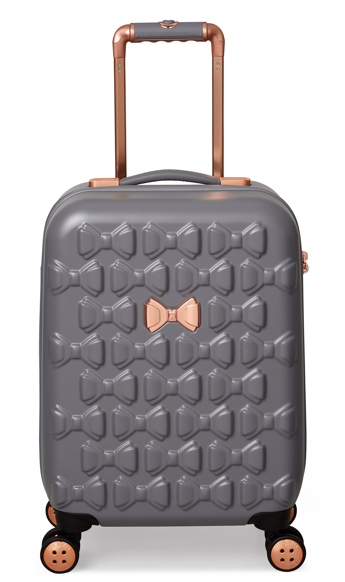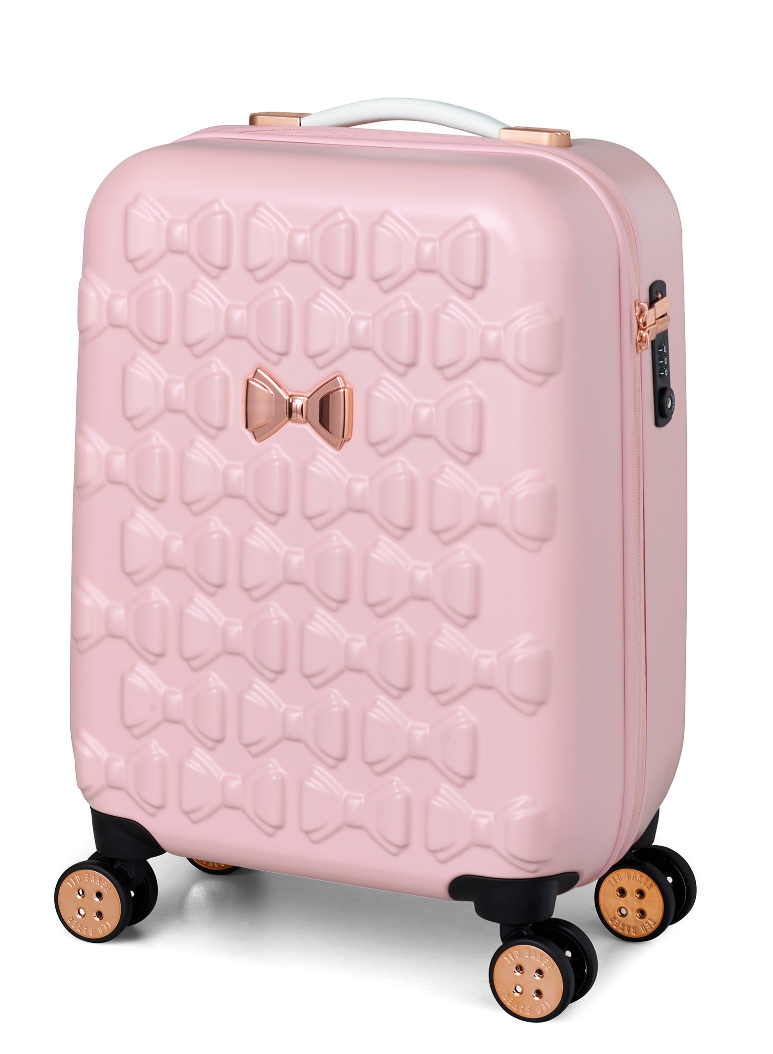 Inspired by Teds love of the bow, Beaus unique and distinctive moulded shell is made from lightweight and shock resistant polycarbonate. The satin texture finish reduces signs of scuffs and scratches to keep Beau looking timeless and elegant. The single Ted Baker branded rose gold bow takes centre stage and is complimented by signature rose gold hard wear, aircraft grade aluminium trolley system and iconic logo button hubcaps. The four smooth rolling double wheels make for ultimate and stable 360 degree manoeuvrability. All wheeled pieces come with integrated TSA combination lock.