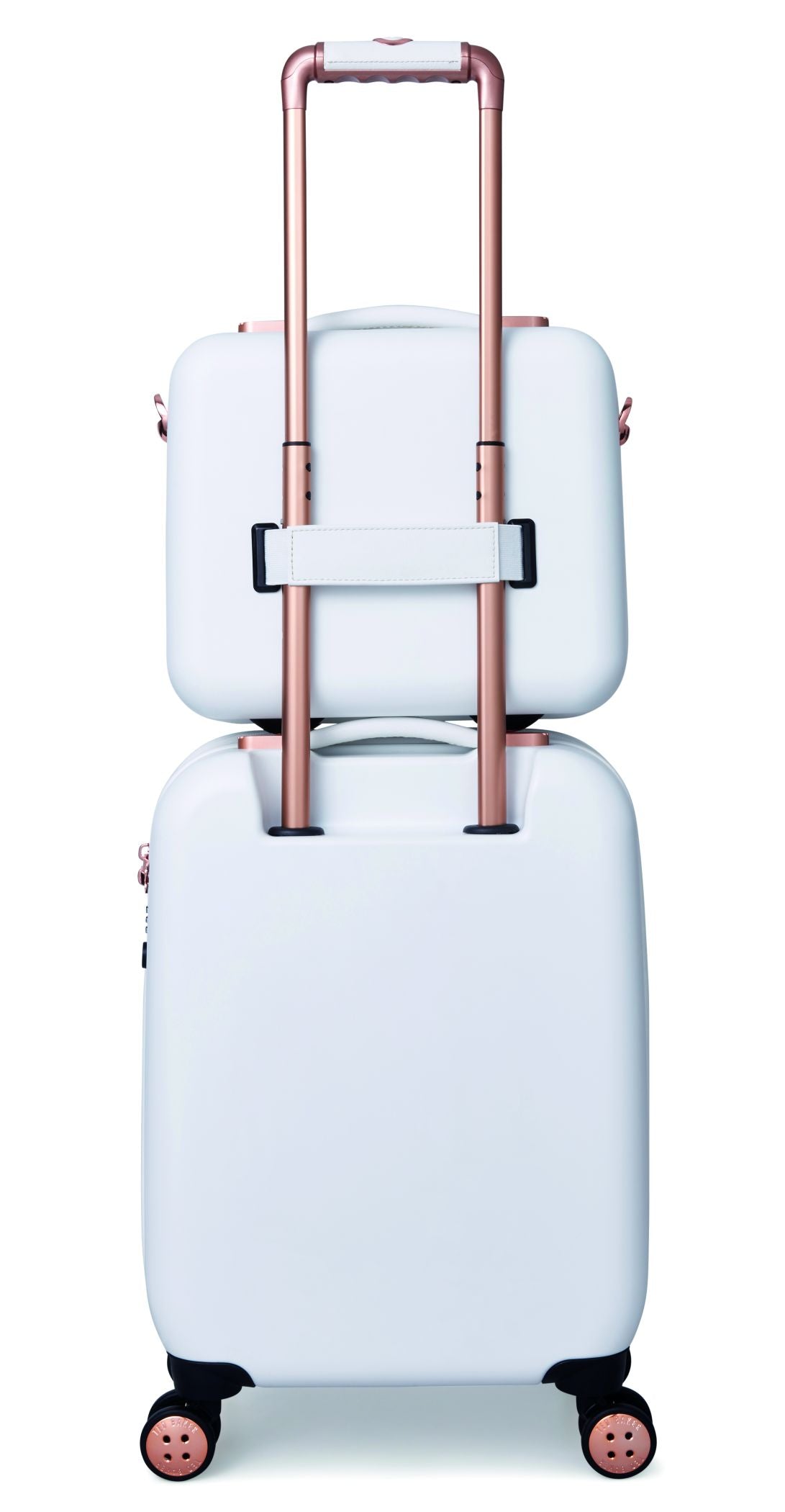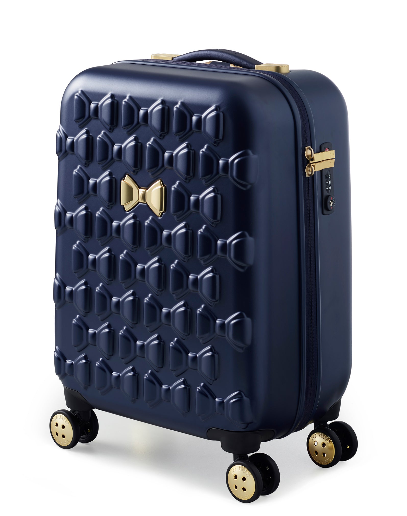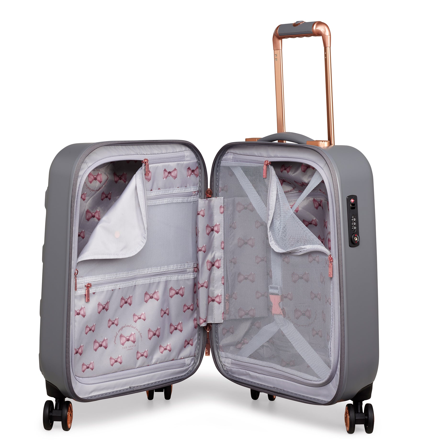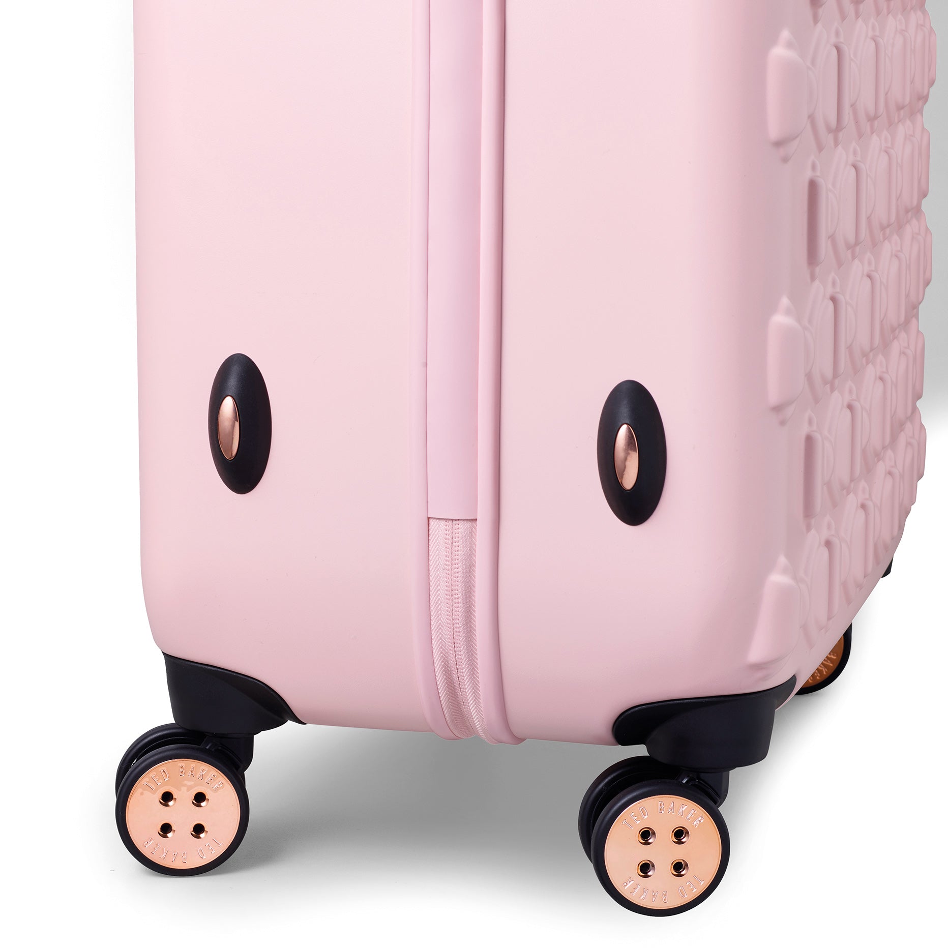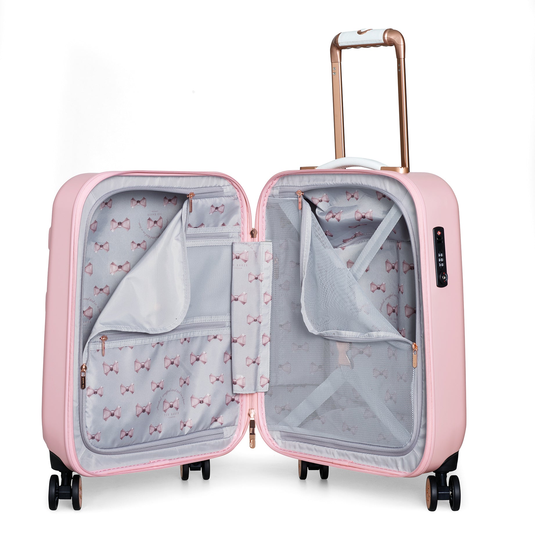 Inspired by Teds love of the bow, Beaus unique and distinctive moulded shell is made from lightweight and shock resistant polycarbonate. The satin texture finish reduces signs of scuffs and scratches to keep Beau looking timeless and elegant. The single Ted Baker branded rose gold bow takes centre stage and is complimented by signature rose gold hard wear, aircraft grade aluminium trolley system and iconic logo button hubcaps. The four smooth rolling double wheels make for ultimate and stable 360 degree manoeuvrability. All wheeled pieces come with integrated TSA combination lock.