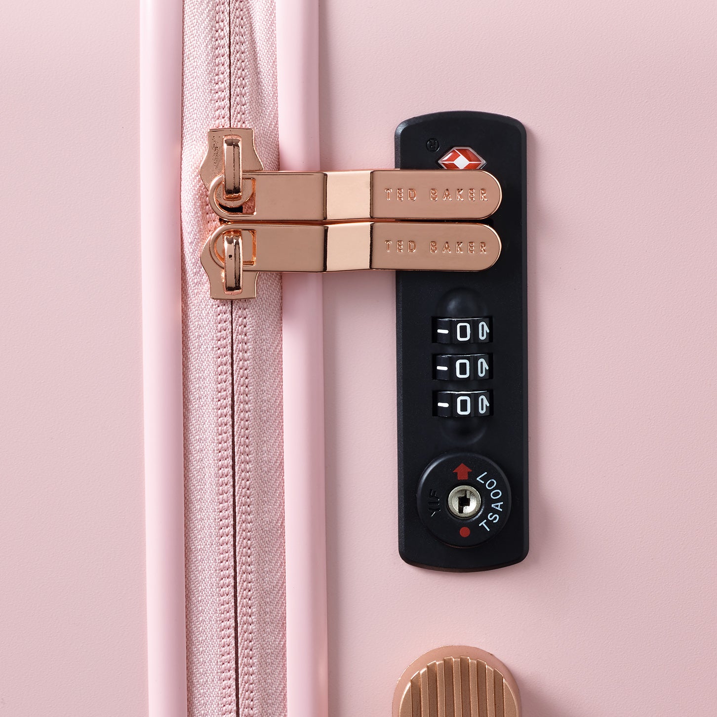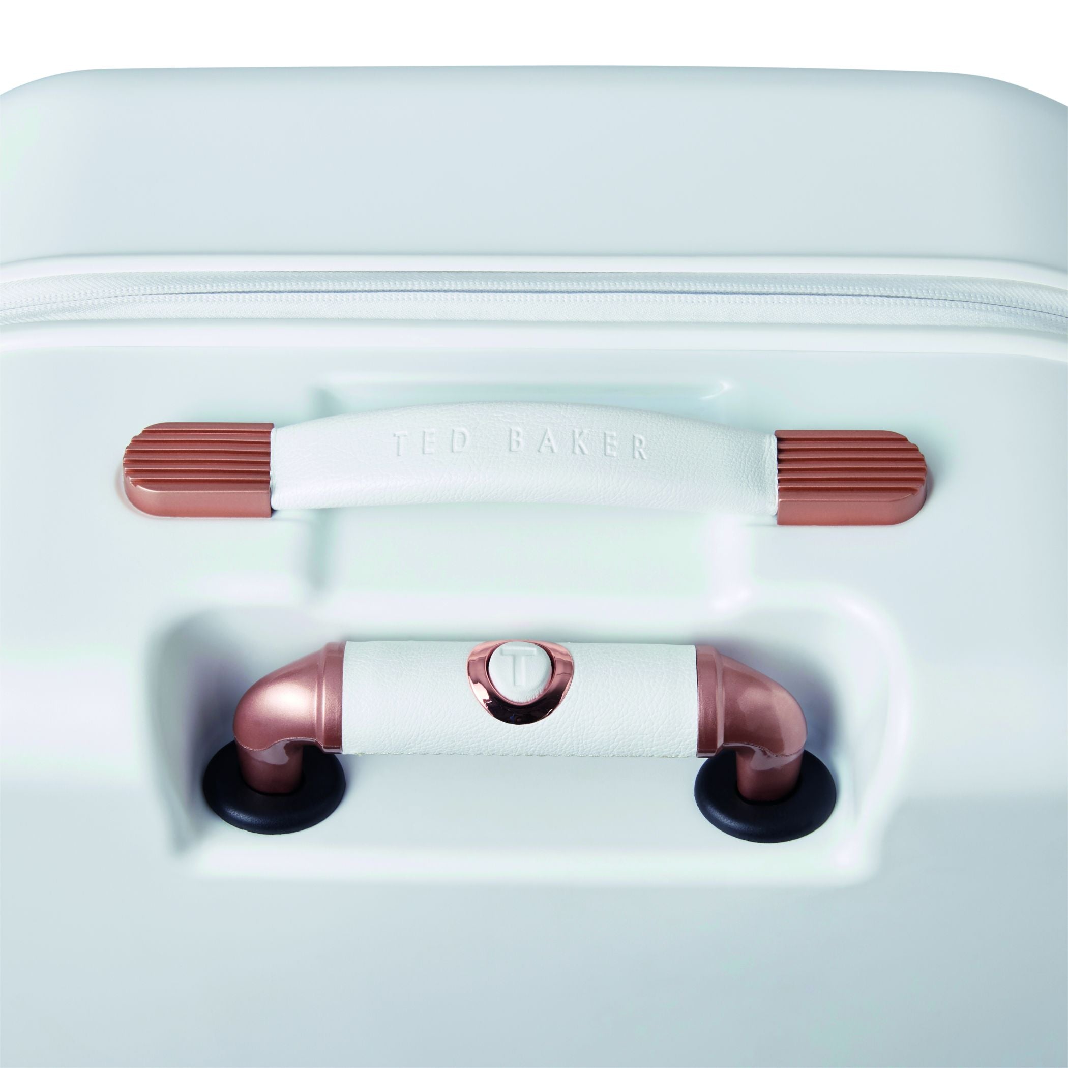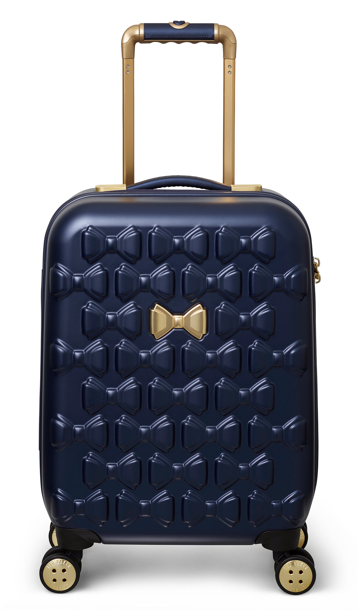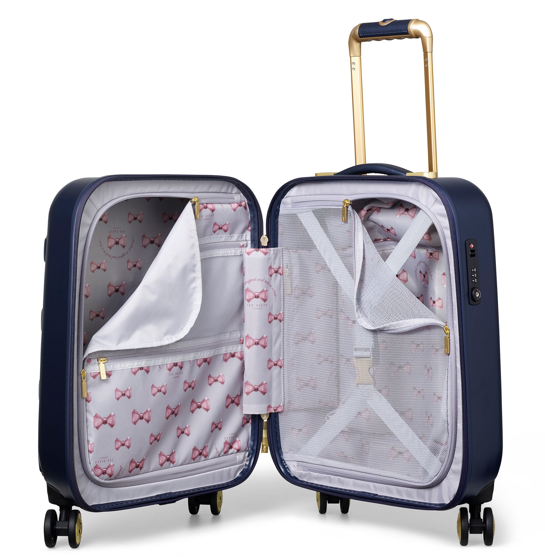 Inspired by Teds love of the bow, Beaus unique and distinctive moulded shell is made from lightweight and shock resistant polycarbonate. The satin texture finish reduces signs of scuffs and scratches to keep Beau looking timeless and elegant. The single Ted Baker branded rose gold bow takes centre stage and is complimented by signature rose gold hard wear, aircraft grade aluminium trolley system and iconic logo button hubcaps. The four smooth rolling double wheels make for ultimate and stable 360 degree manoeuvrability. All wheeled pieces come with integrated TSA combination lock.