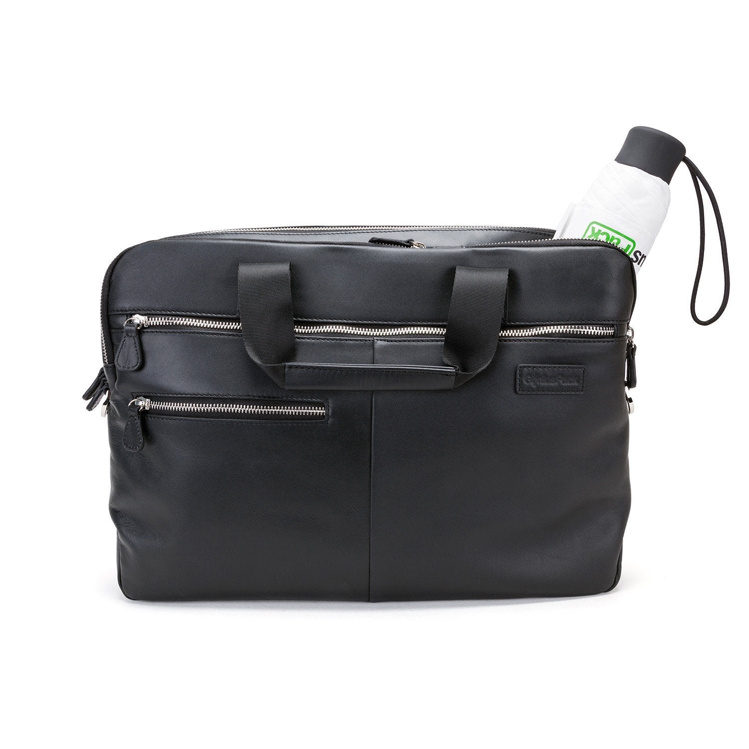 The luxe leather briefcase is equipped with a 17" laptop compartment and plenty of organizational pockets. The soft leather exterior is equipped with multiple zippered pockets for quick access items. You have the option to carry this briefcase by the removable shoulder strap as well as the top carry handle.