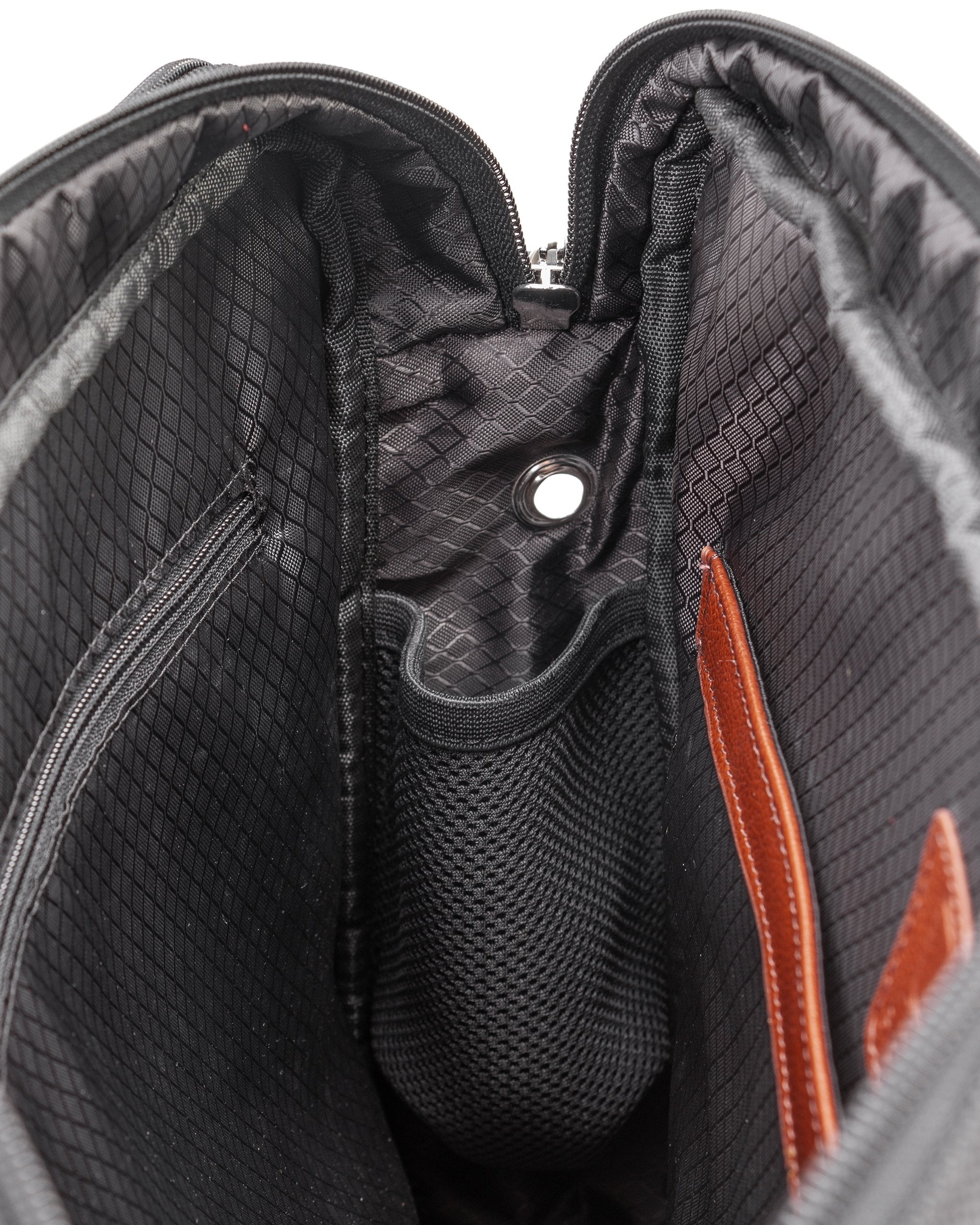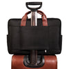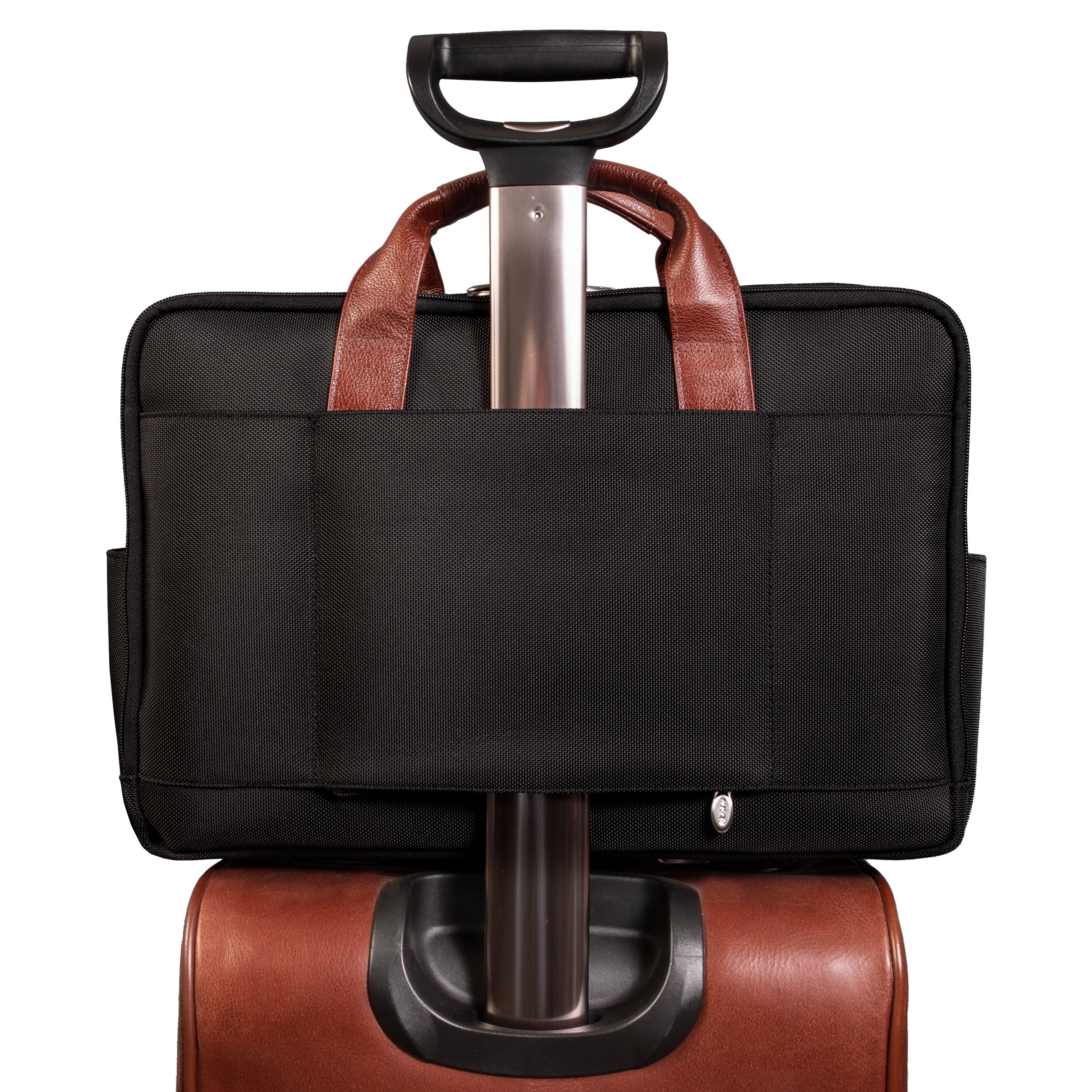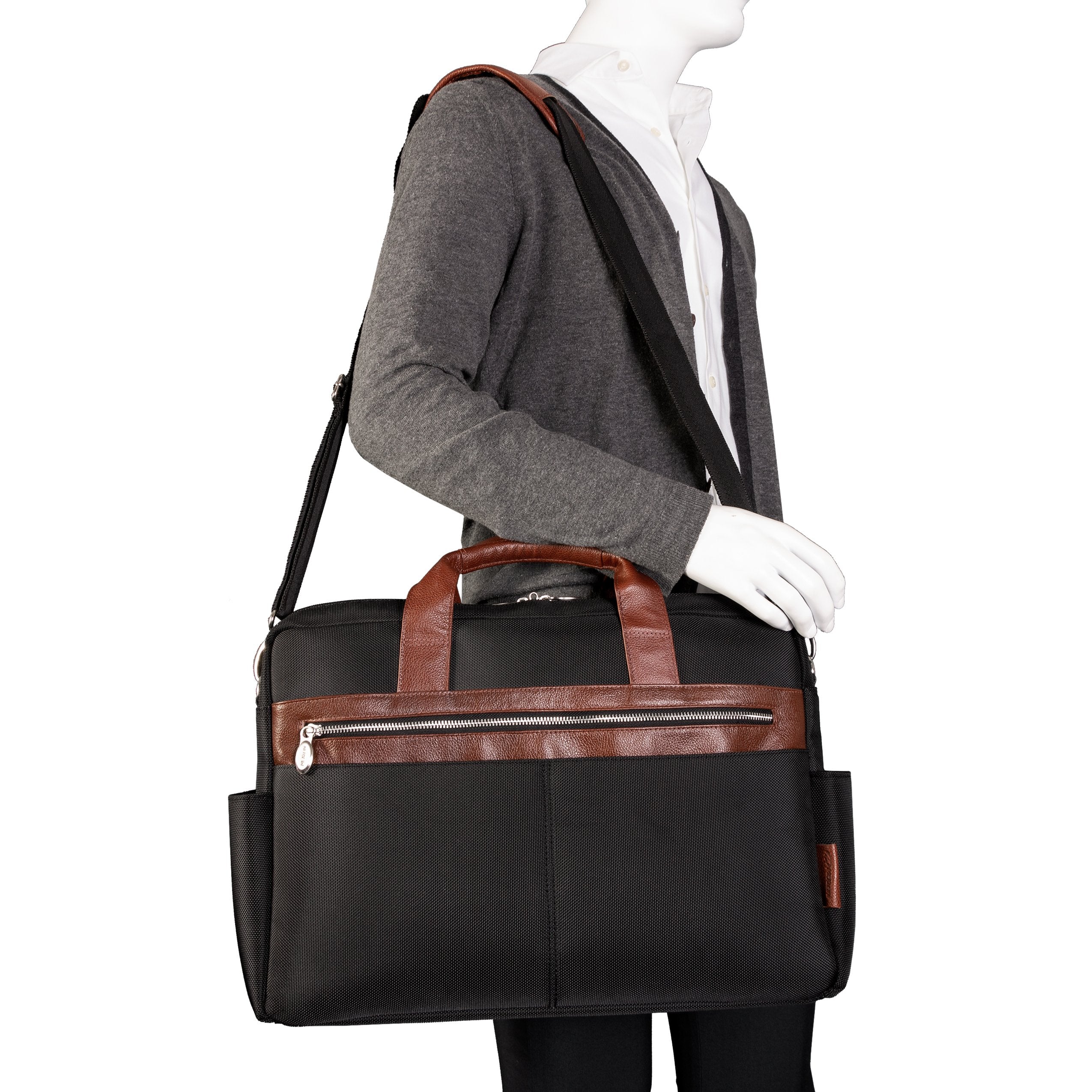 A two-tone spacious nylon 17 with elegant contrasting leather accents laptop and tablet briefcase. Keep your cellphone, keys, and other items handy in the exterior zipper pocket with accessory organizer. Be prepared for any situation by carrying water bottles, umbrellas, etc. in the side and front slip pockets. Fully lined interior with leather trim keep it all safe with our anti-theft lockable metal zippers. Store important items or documents in the interior zipper pocket. Padded tablet pocket and side mesh pocket for your power bank. The back compartment includes a 17 padded built in laptop sleeve. Carry easily with the non-slip contour removable shoulder strap or you can turn the back pocket into a piggyback strap and set it on your rolling case.