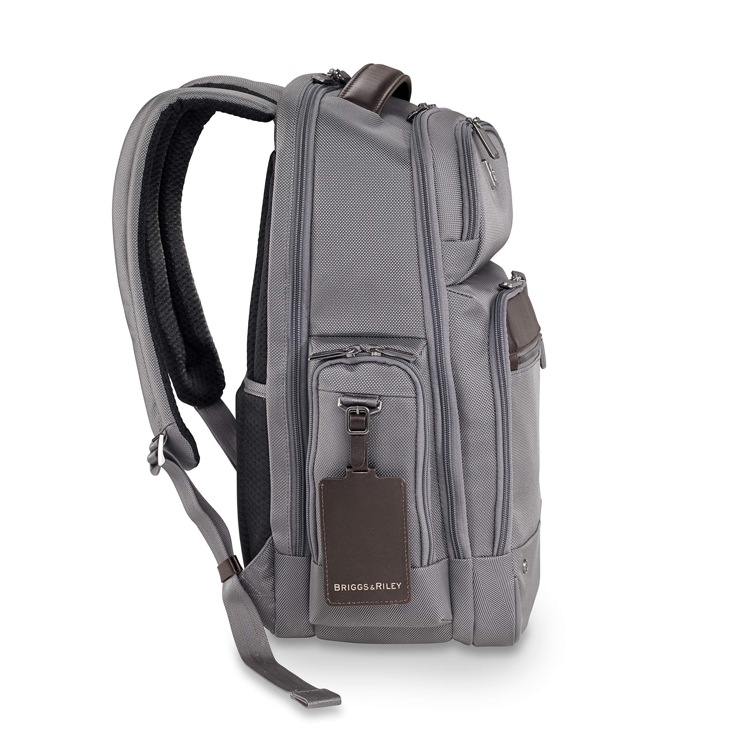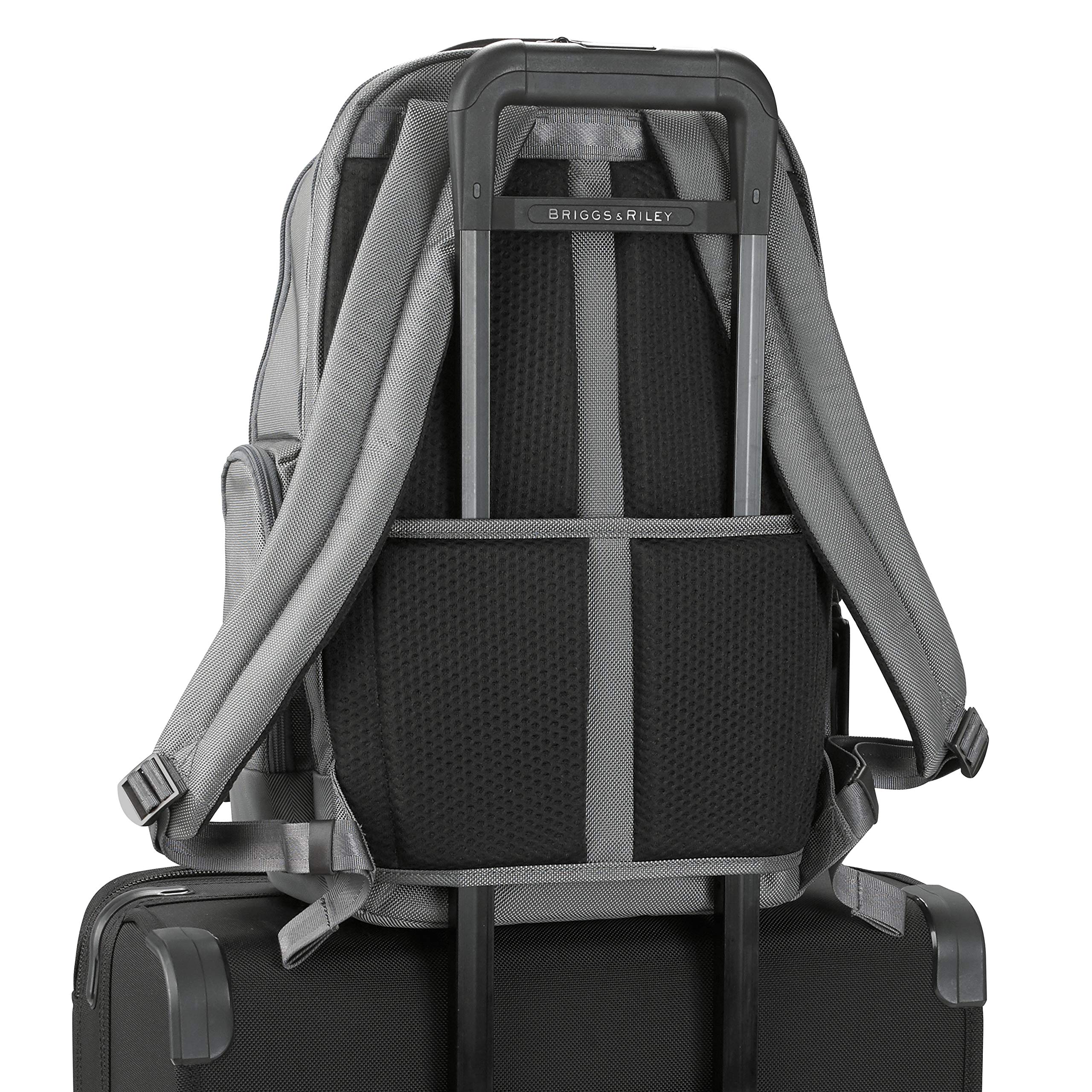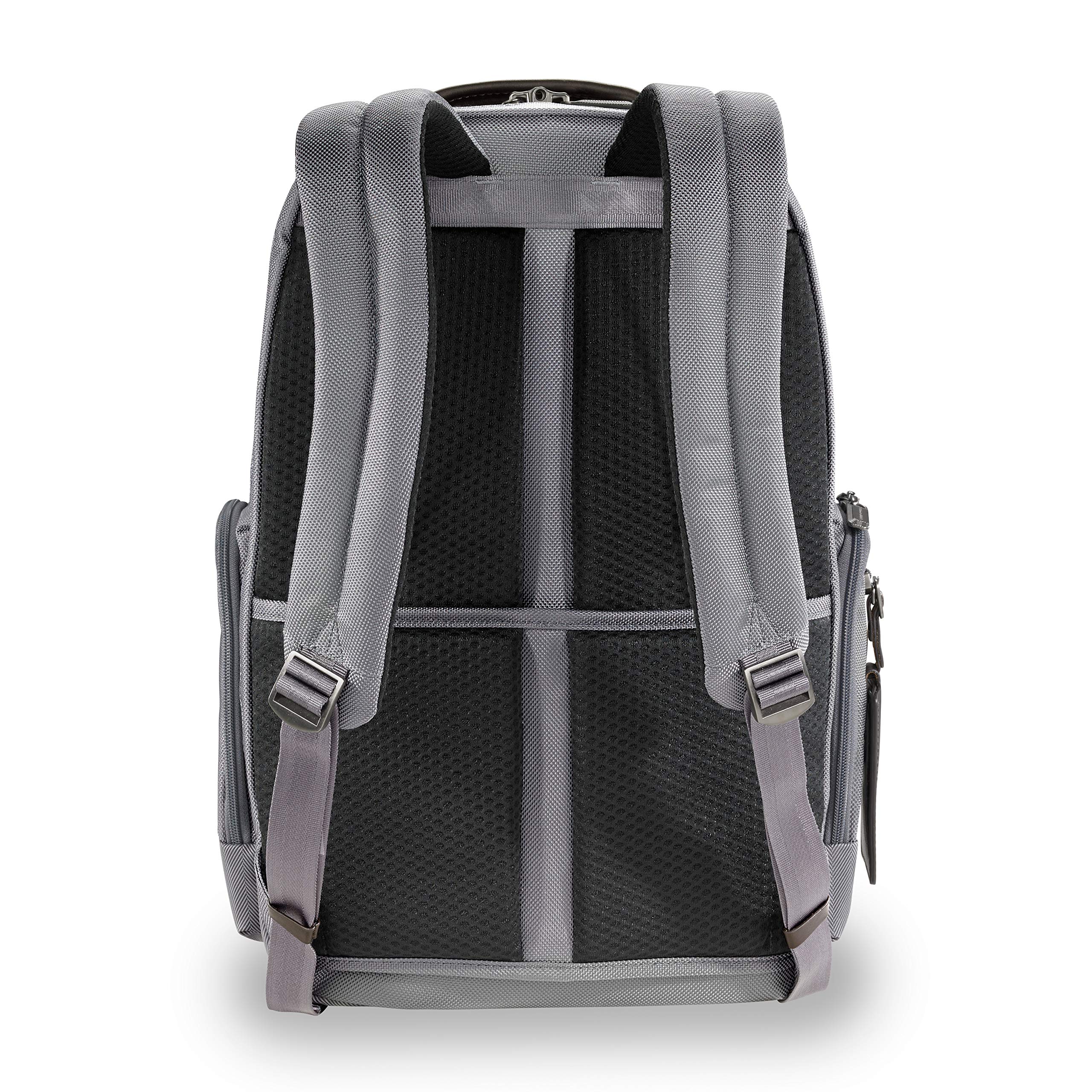 • Sleek, removable hanging leather ID tag with snap window closure conceals personal information. Adjustable padded neoprene backpack straps for maximum shoulder comfort. Aerated mesh back padding allows air to circulate against body, keeping back cool, while generously padded back panel adds lumbar support. Slip-through back panel allows bag to slide over any Briggs & Riley Outsider handle for seamless transportation of two bags as one.