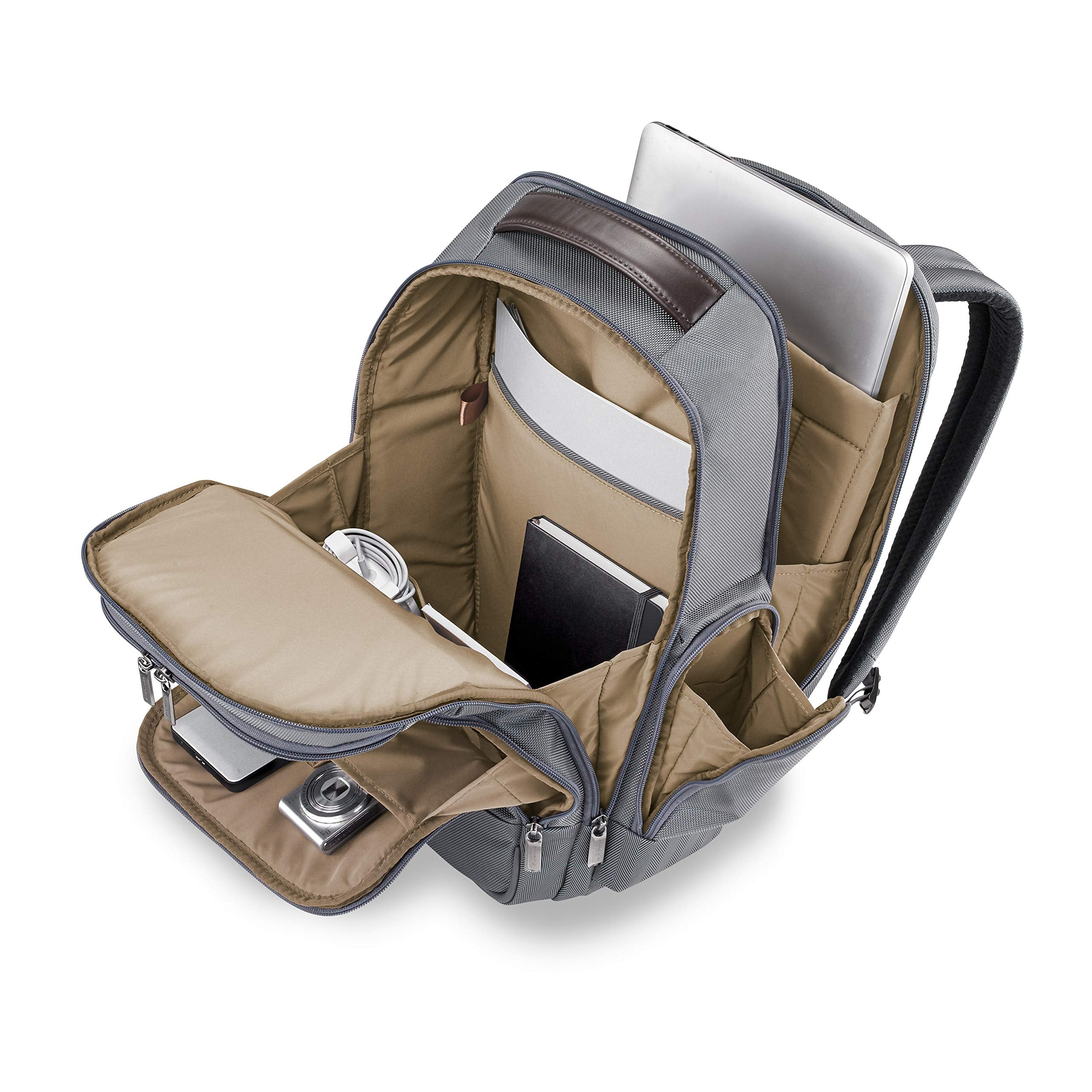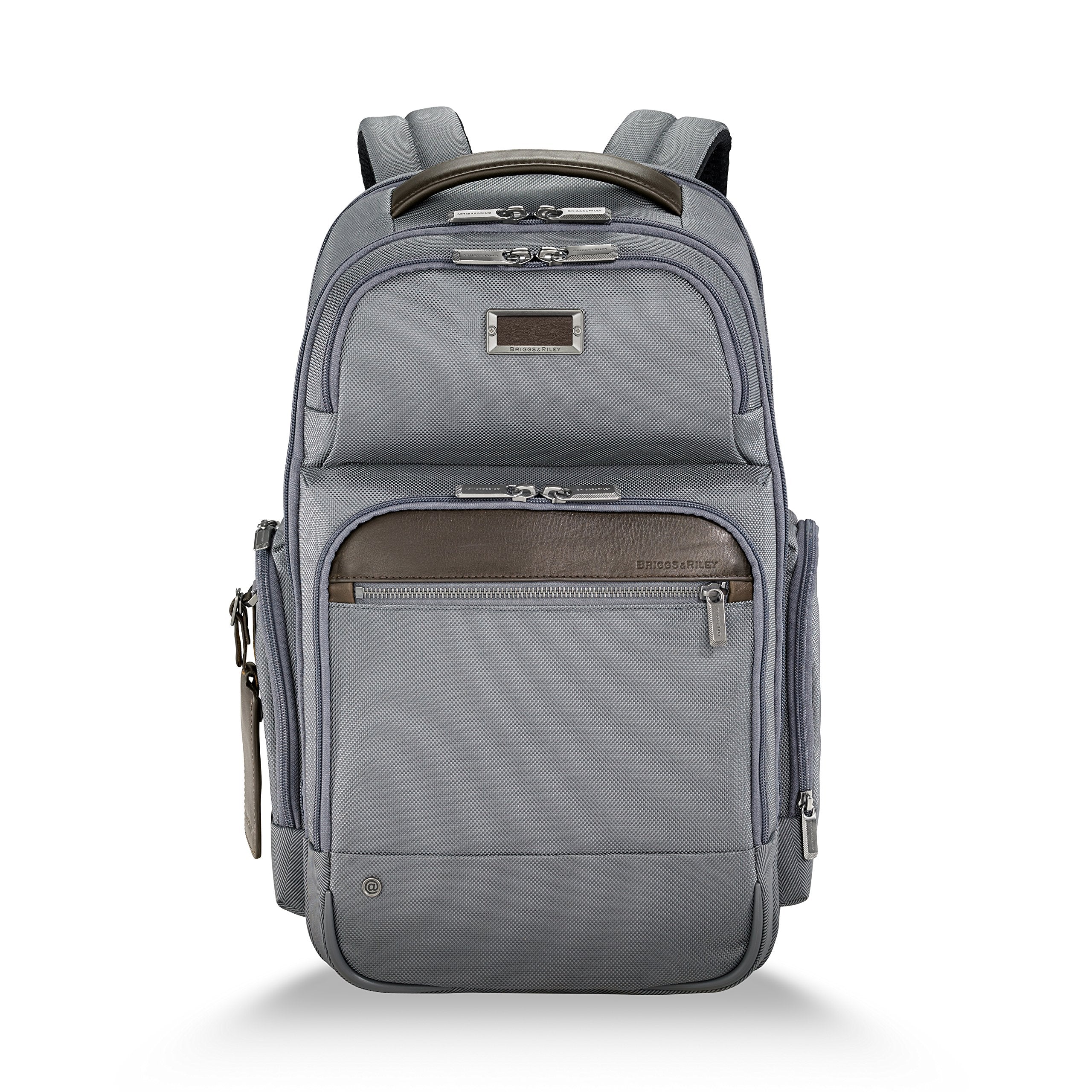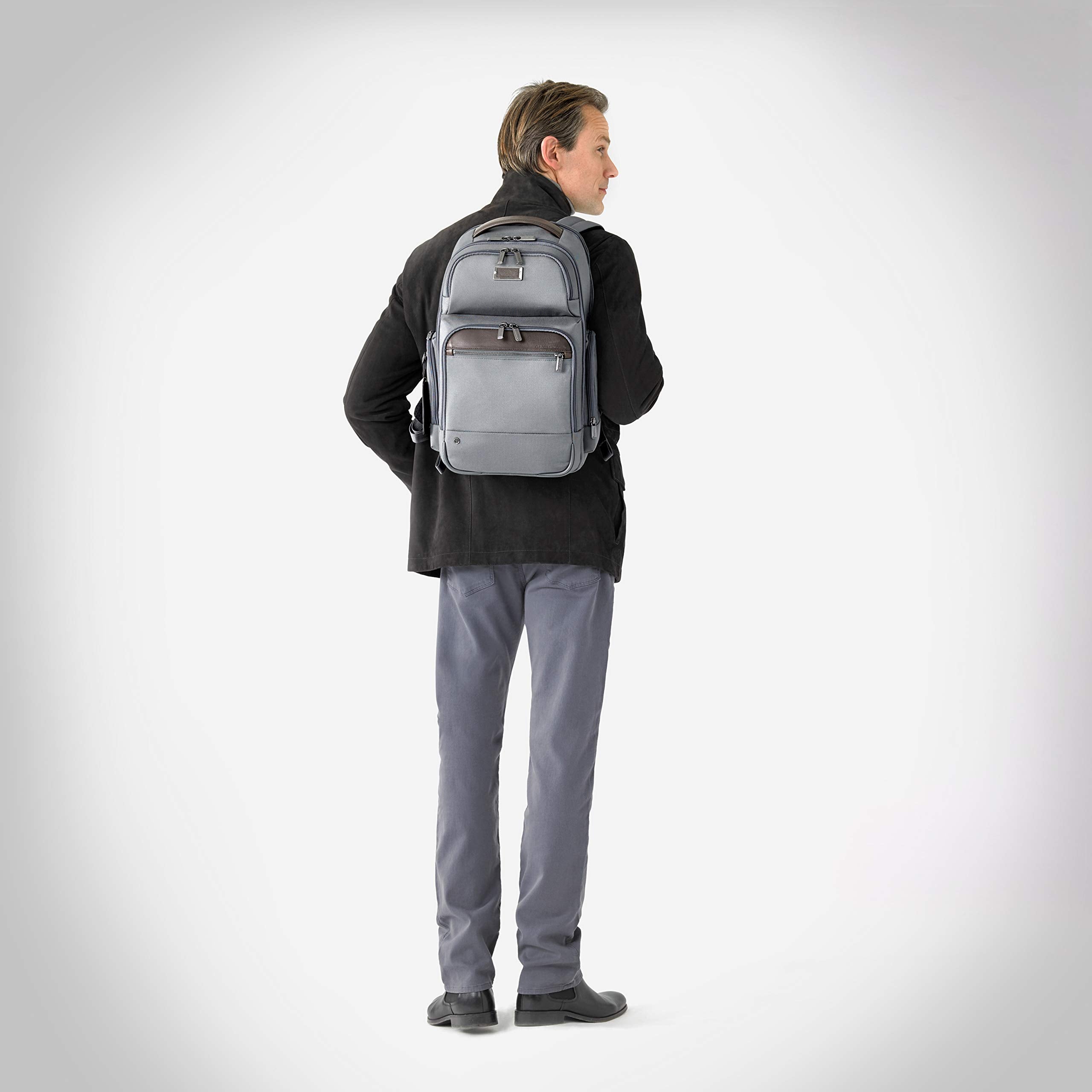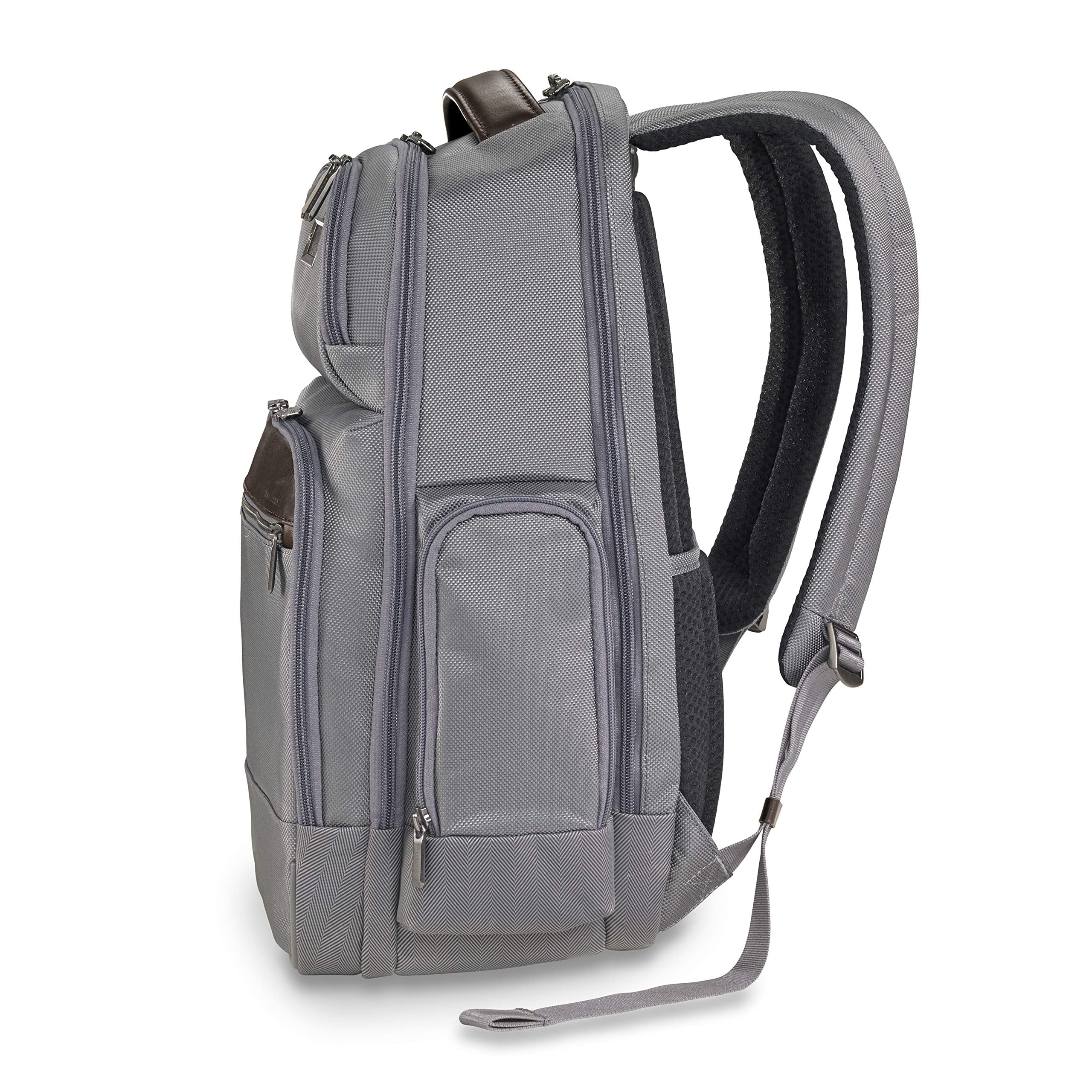 • Sleek, removable hanging leather ID tag with snap window closure conceals personal information. Adjustable padded neoprene backpack straps for maximum shoulder comfort. Aerated mesh back padding allows air to circulate against body, keeping back cool, while generously padded back panel adds lumbar support. Slip-through back panel allows bag to slide over any Briggs & Riley Outsider handle for seamless transportation of two bags as one.