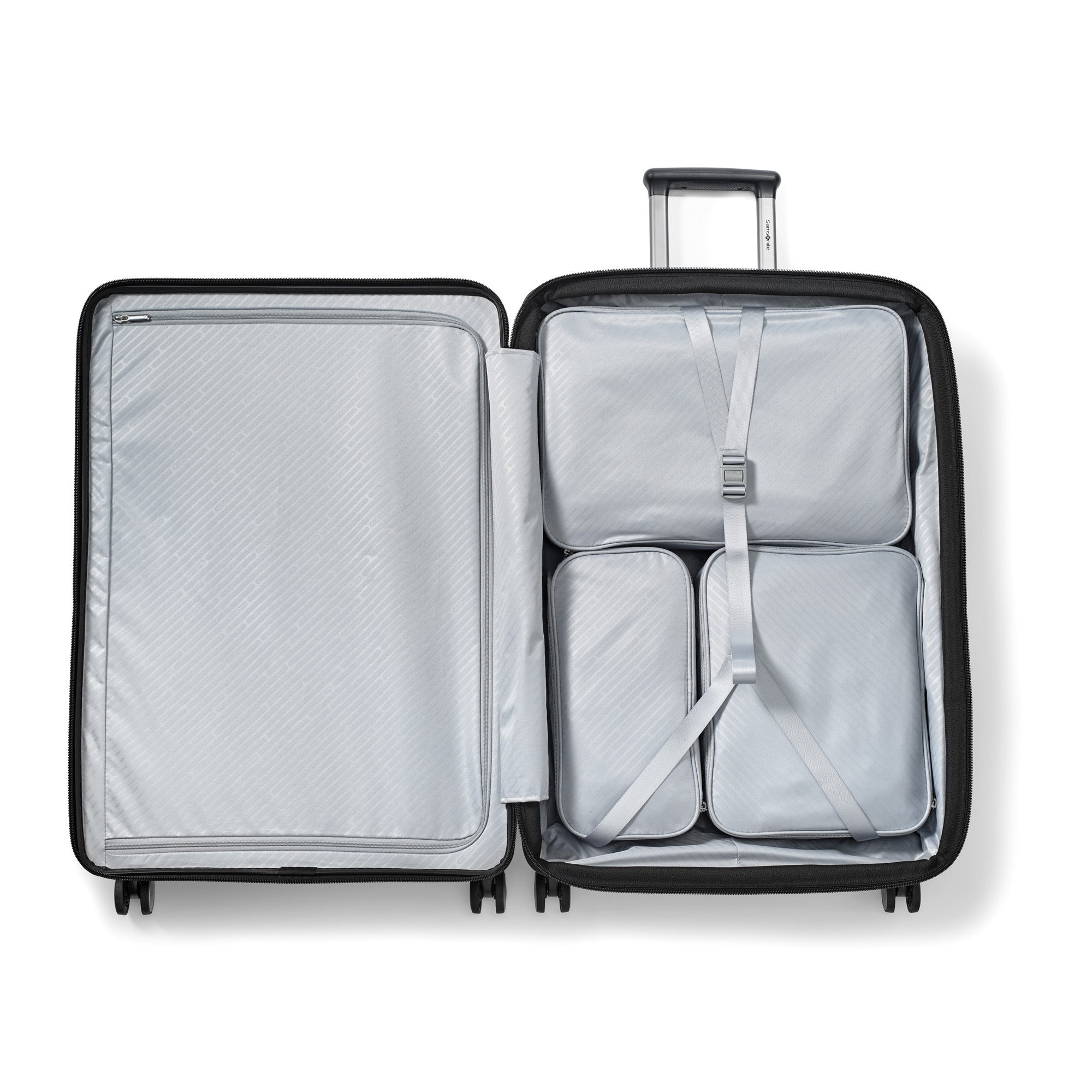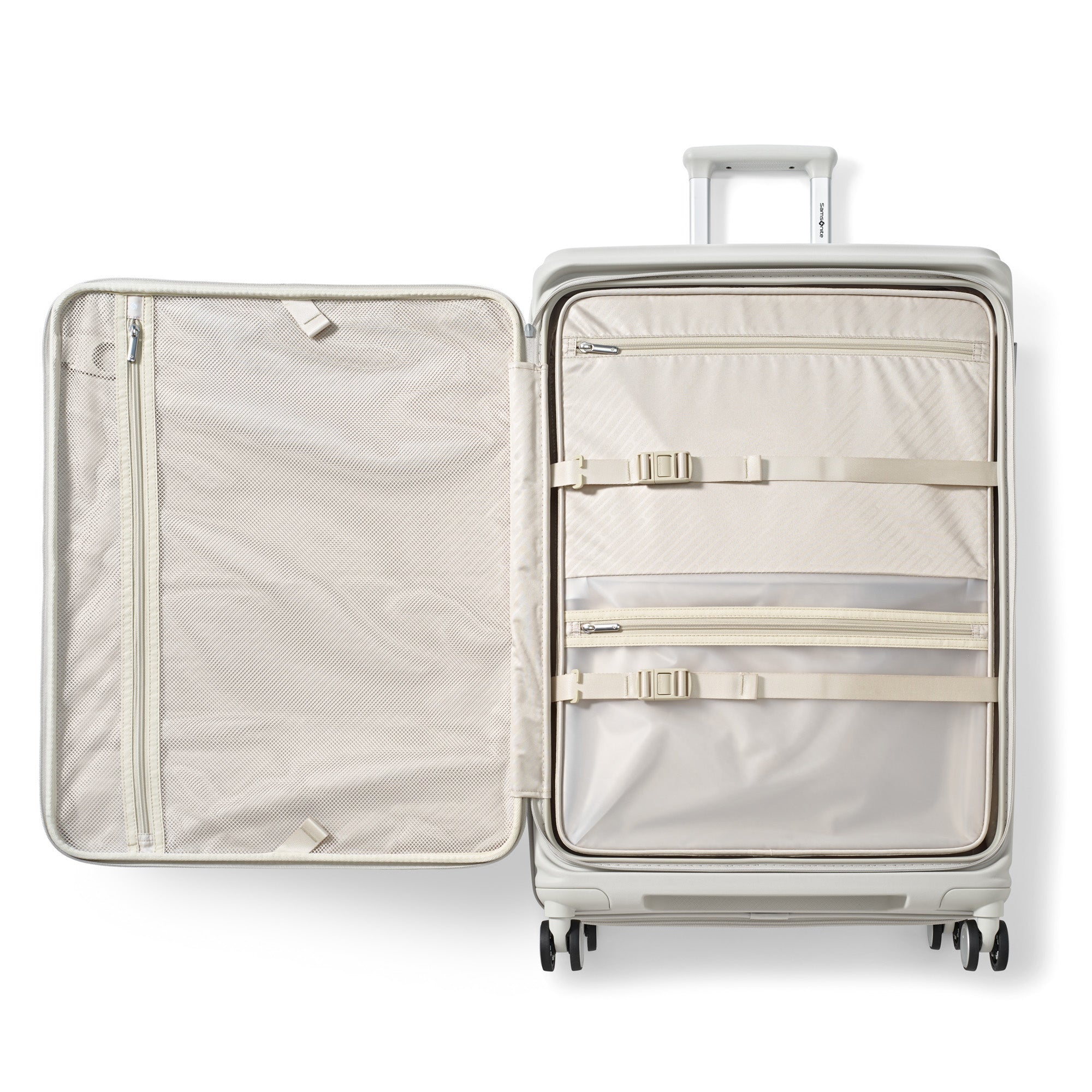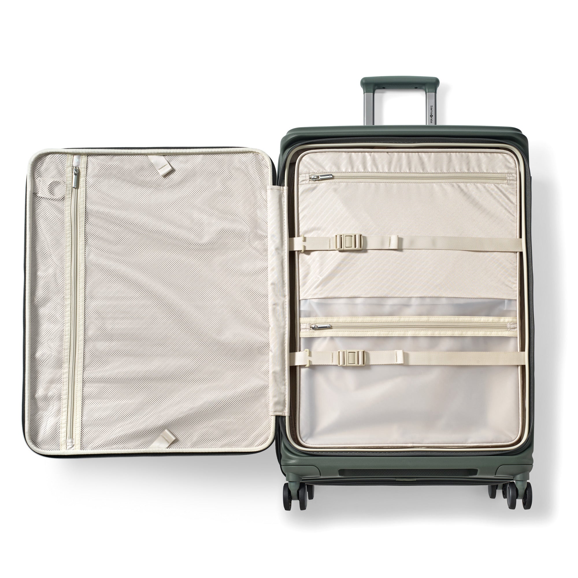 Made from ultra-durable and sustainable materials, the Large Spinner opens from the middle, like traditional luggage, and provides a second front door opening that allows you to fully pack and unpack when floor space is limited.