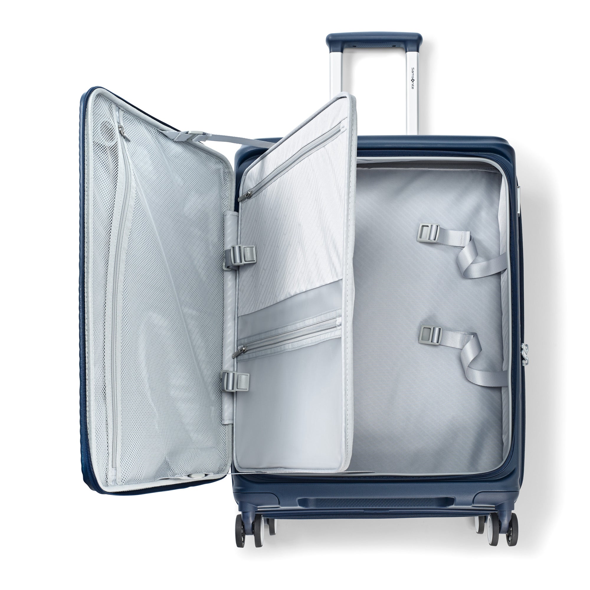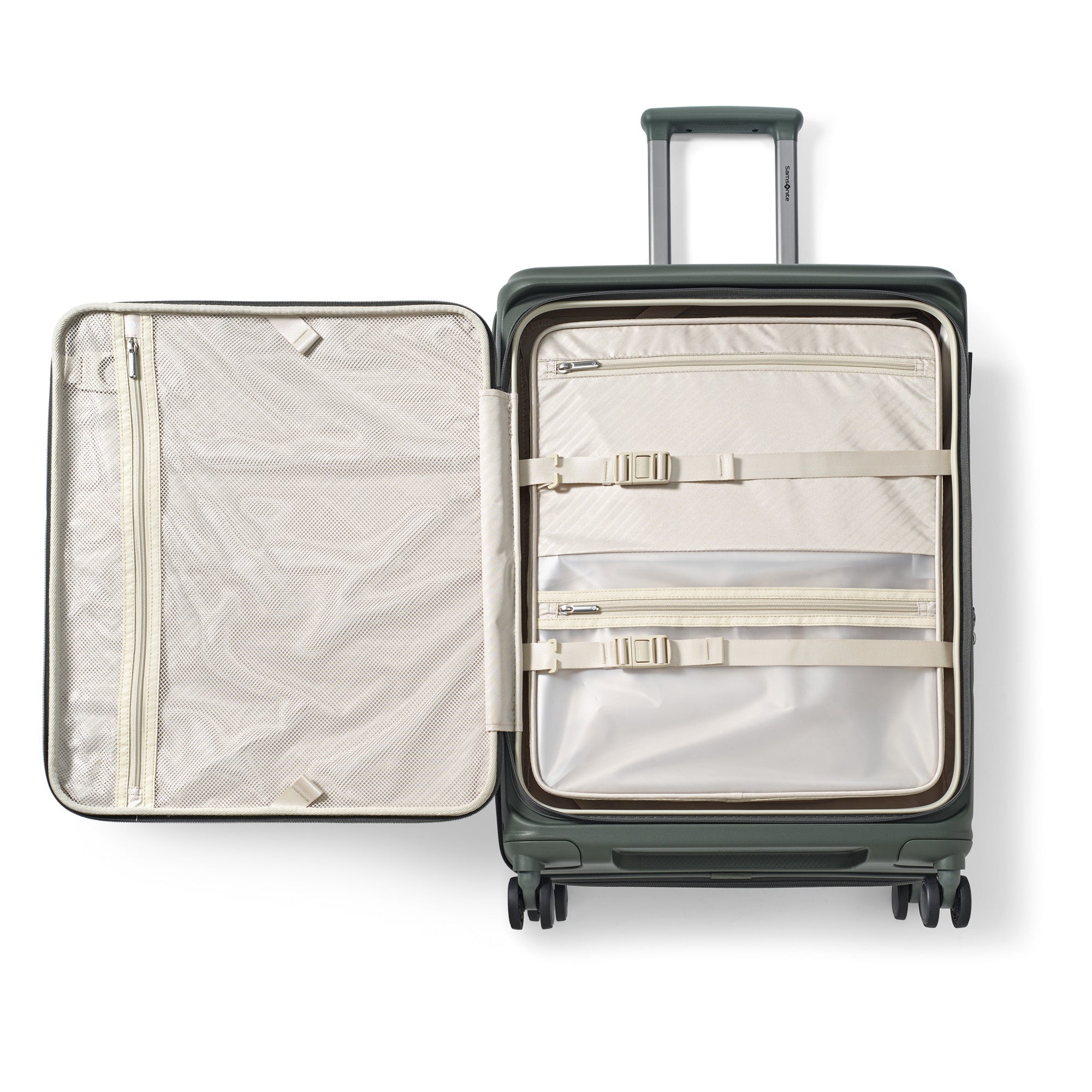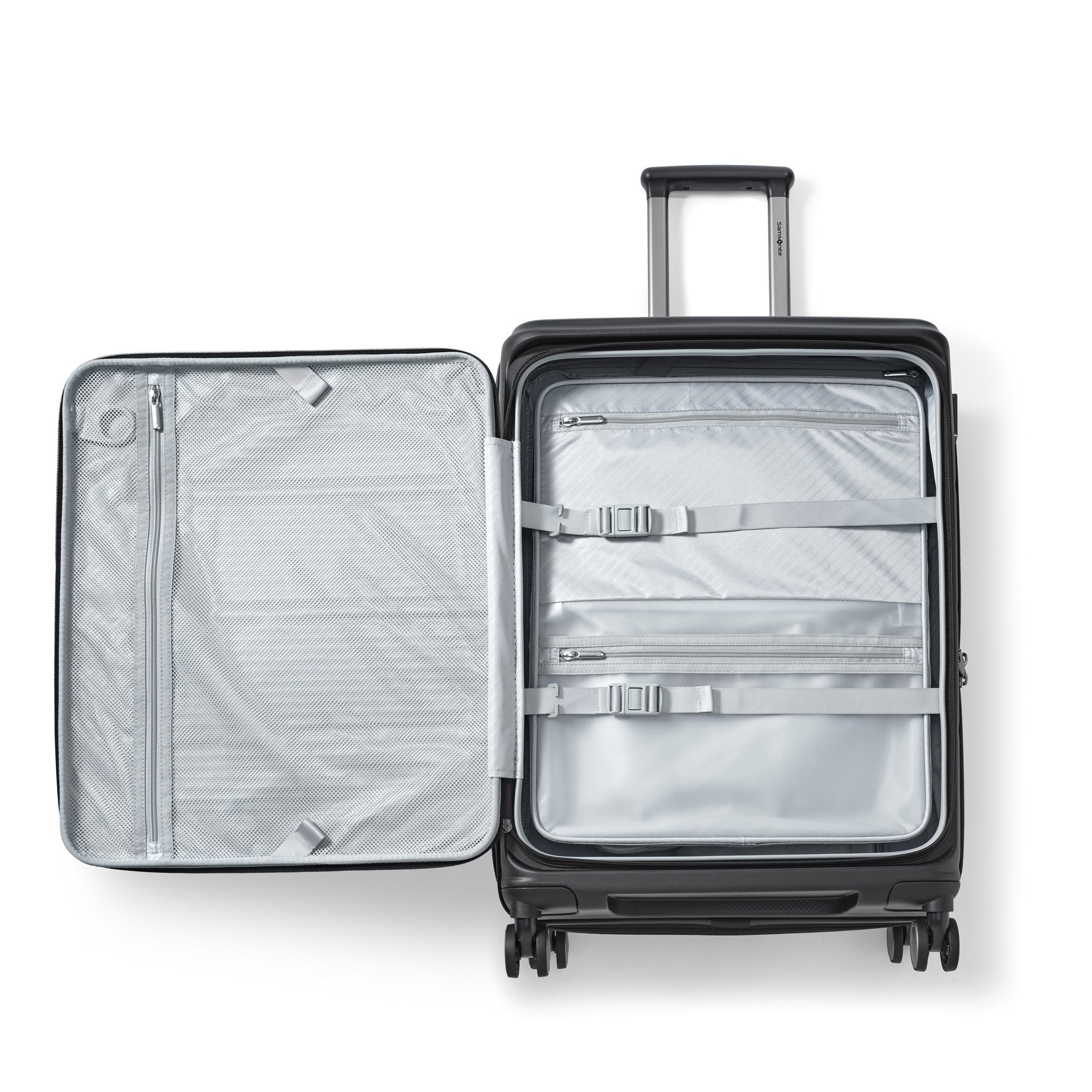 Made from ultra-durable and sustainable materials, the Medium Spinner opens from the middle, like traditional luggage, and provides a second front door opening that allows you to fully pack and unpack when floor space is limited.