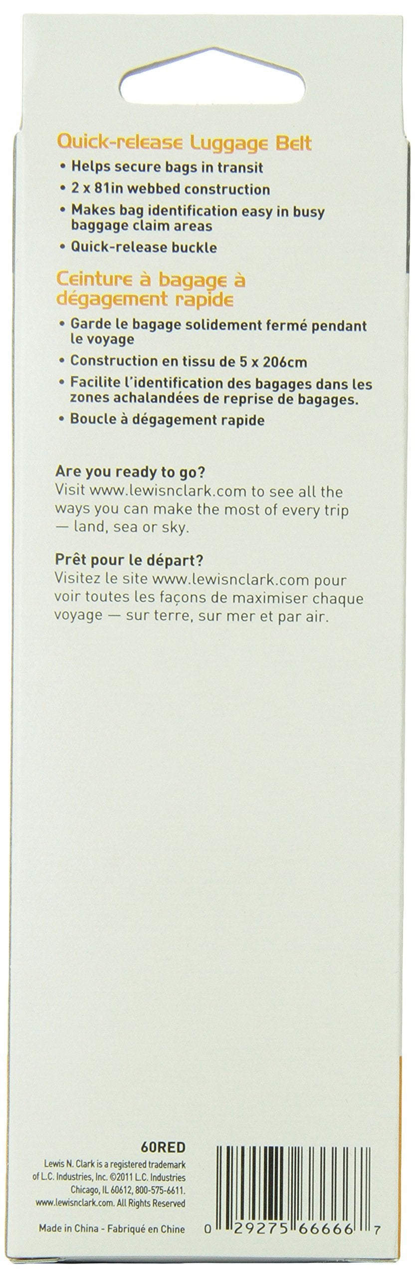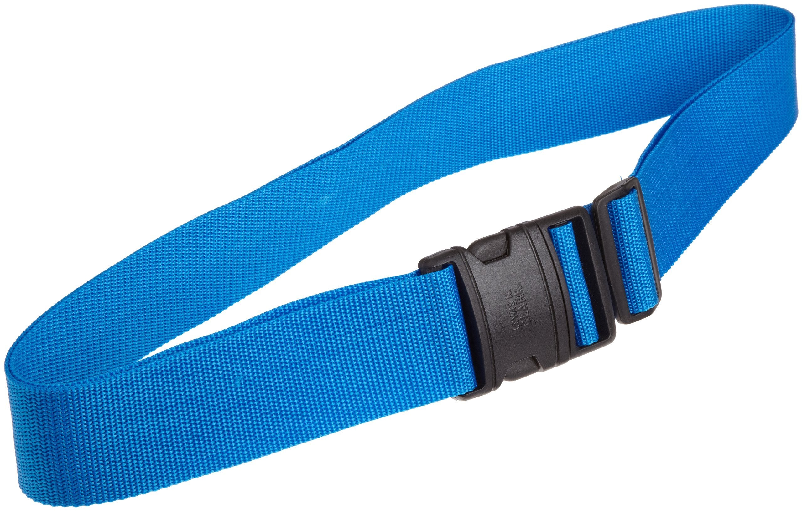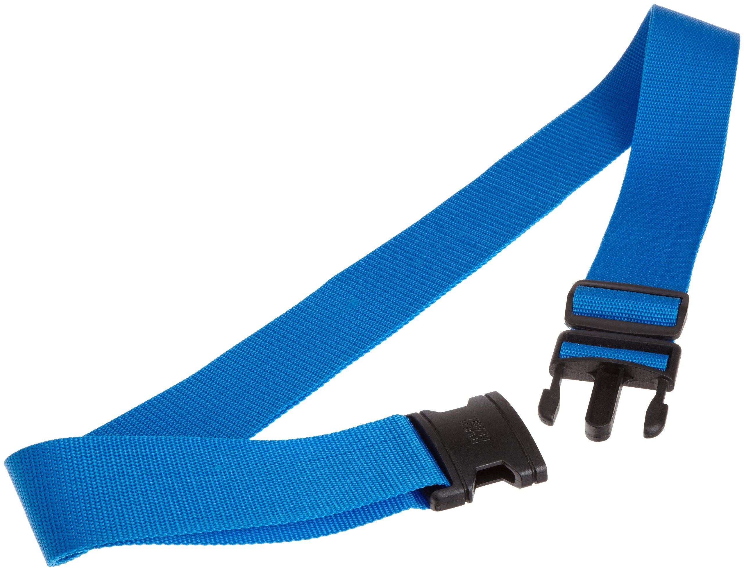 Adjustable webbed belt. Quick-release poly buckle. 2in x 81in. Black, Blue,Rainbow, Red . Deluxe adjustable webbed luggage belt with quick releasebuckle. Measures 2" wide by 81" long. Deluxe adjustable webbed luggage beltwith quick release buckle. Measures 2" wide by 81" long.