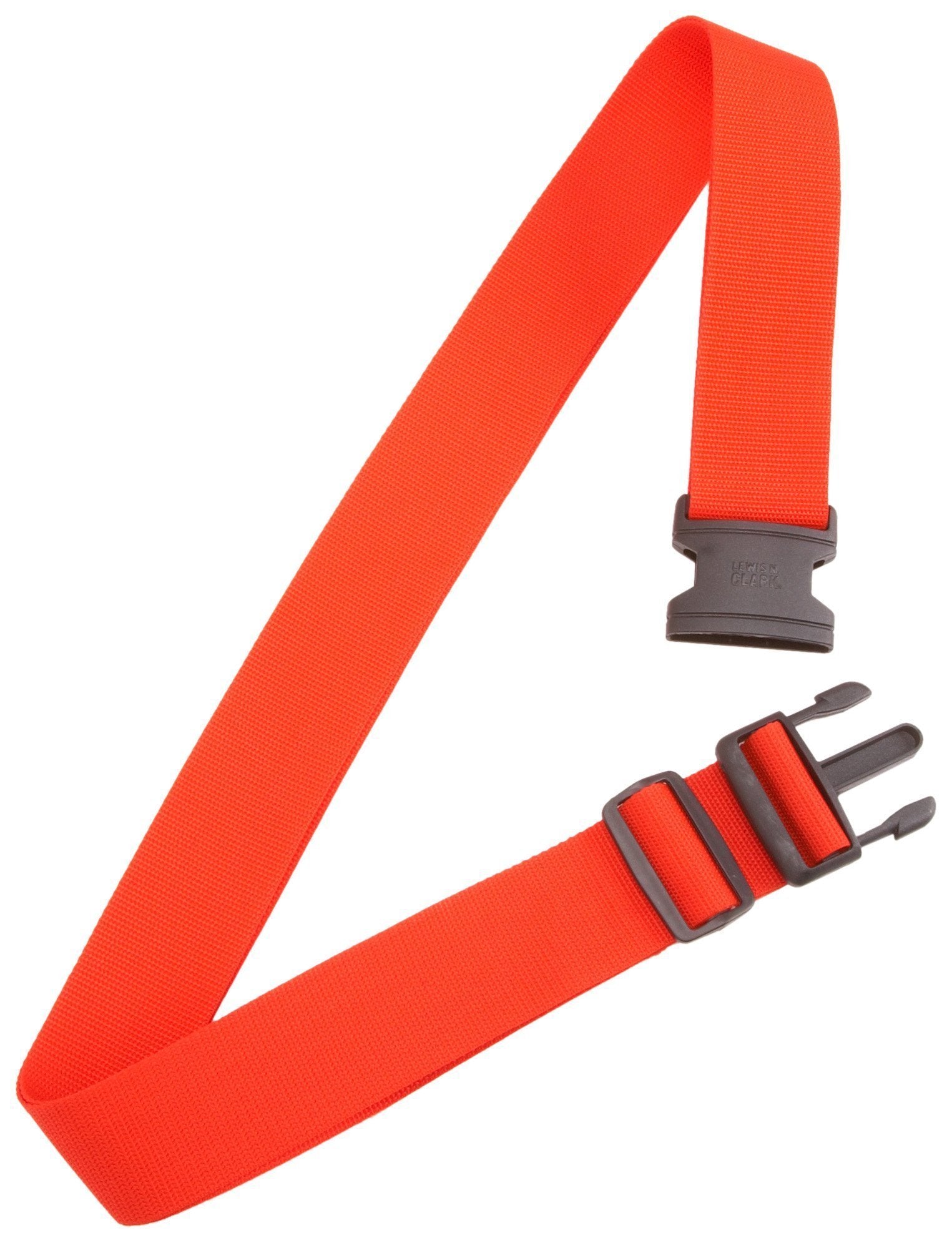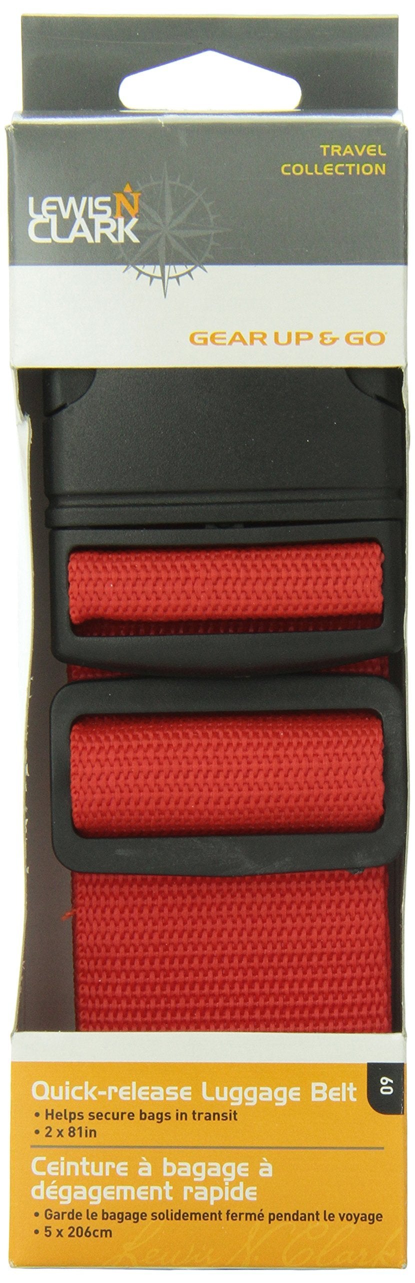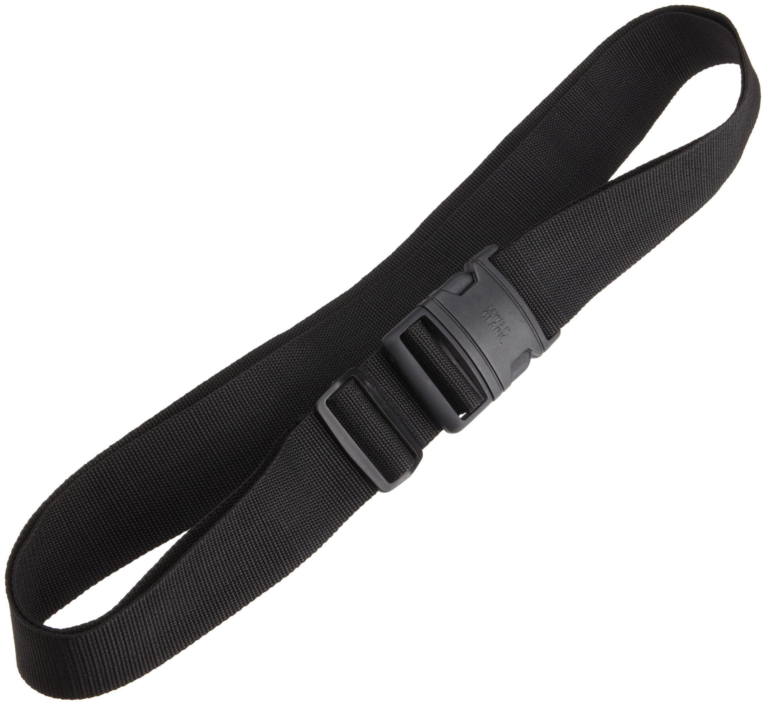 Adjustable webbed belt. Quick-release poly buckle. 2in x 81in. Black, Blue,Rainbow, Red . Deluxe adjustable webbed luggage belt with quick releasebuckle. Measures 2" wide by 81" long. Deluxe adjustable webbed luggage beltwith quick release buckle. Measures 2" wide by 81" long.