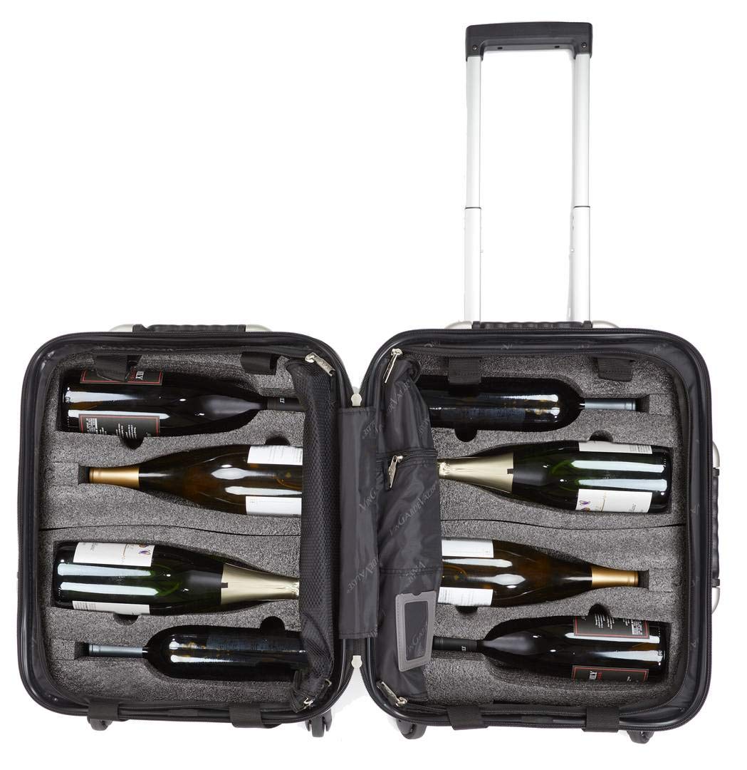 Travel in confidence with the newest version of the VinGardeValise 03, a must-have travel accessory that guarantees a safe journey for your favorite wine, beer & spirits. This flexible design features removable inserts, making packing easy; carry up to 8 (750 ml) bottles, personal belongings, or both! The VGV 03 Petite features a 100% proprietary compound material shell with closed-cell foam. The new asymmetrical Hinomoto wheels make the VGV easy for you to maneuver, while a TSA compliant lock is flush mounted and integrated into the suitcase. The product comes with a 10-Year Manufacturers Limited Warranty on any defects in materials and workmanship. Additional inserts, sold separately, offer temperature controlling wine chiller sheets and magnum size capability.