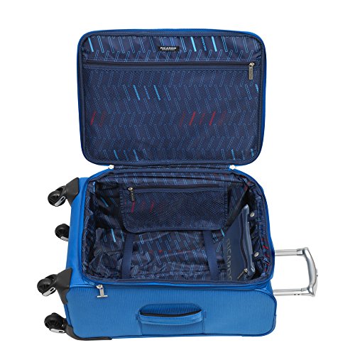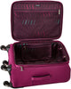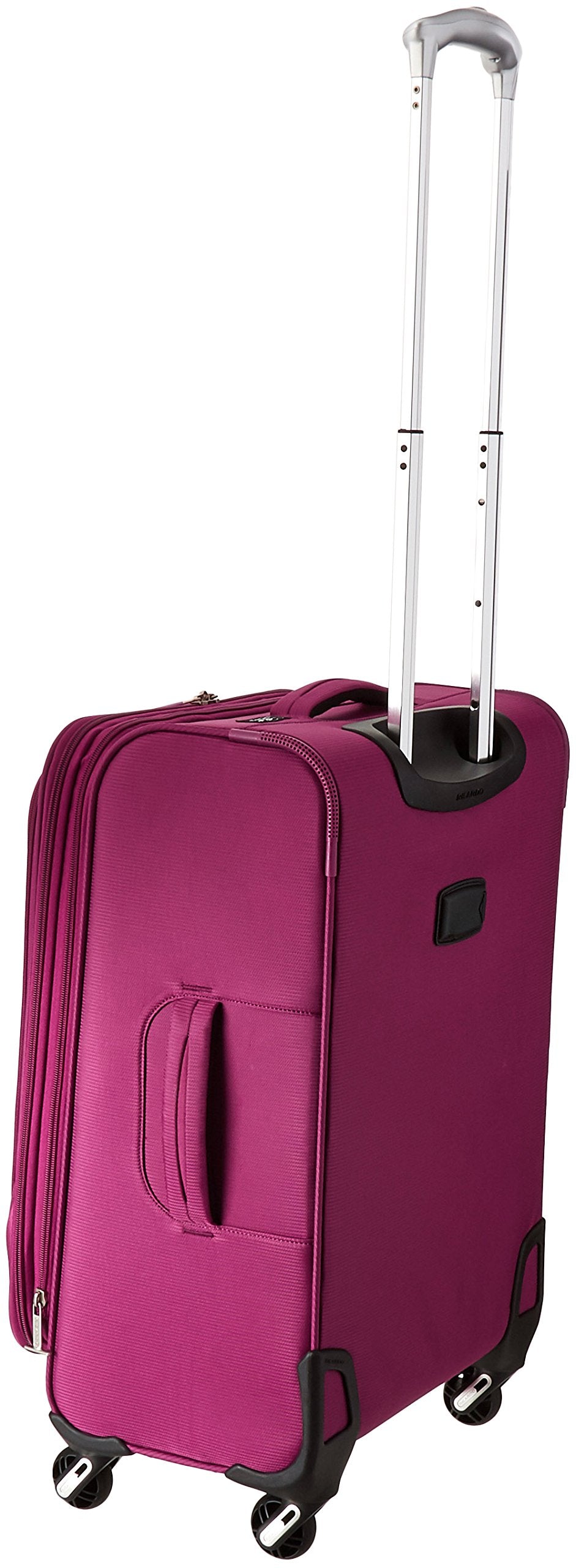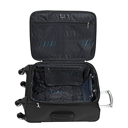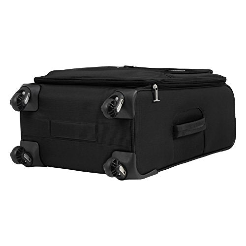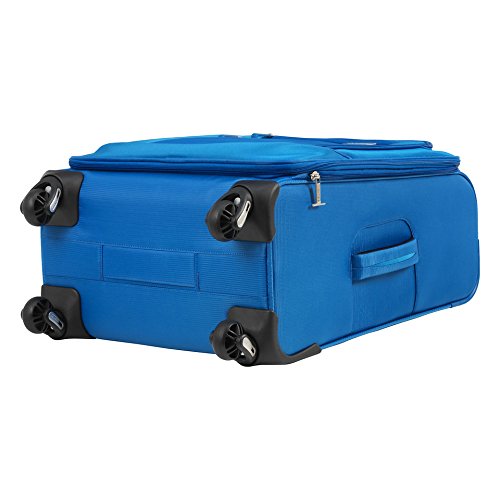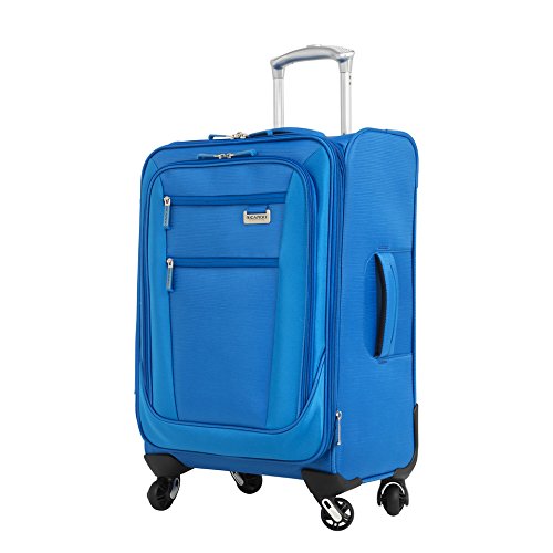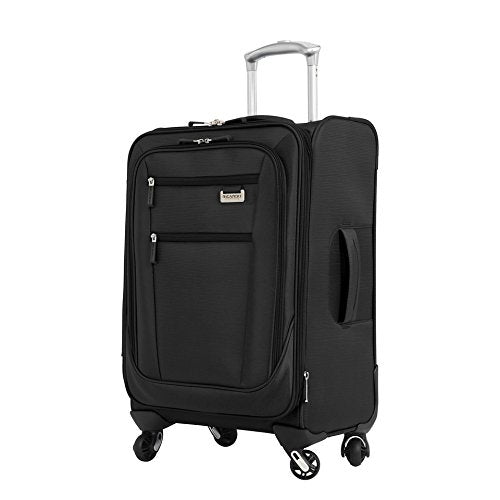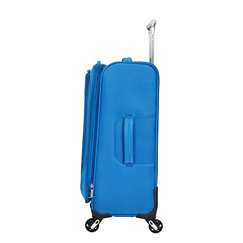 This del mar ultralight soft side collection features a new precision engineered spinner wheels and tray system that provides exceptional stability and mobility whether you push, pull or walk alongside the case. The retractable handle system has an ergonomic push-button handle that adjusts to the height that fits your comfort needs. Innovative cushioned top and side carry handle design is incredibly lightweight yet extremely durable. The interior has multiple pockets for you to organize you personal belongings.