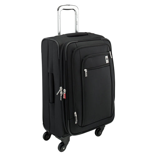 • Telescoping handle offers a soft touch grip for maximum comfort. Recessed padded top and side carry handles. Easy to grab bottom handle is great for overhead compartments