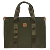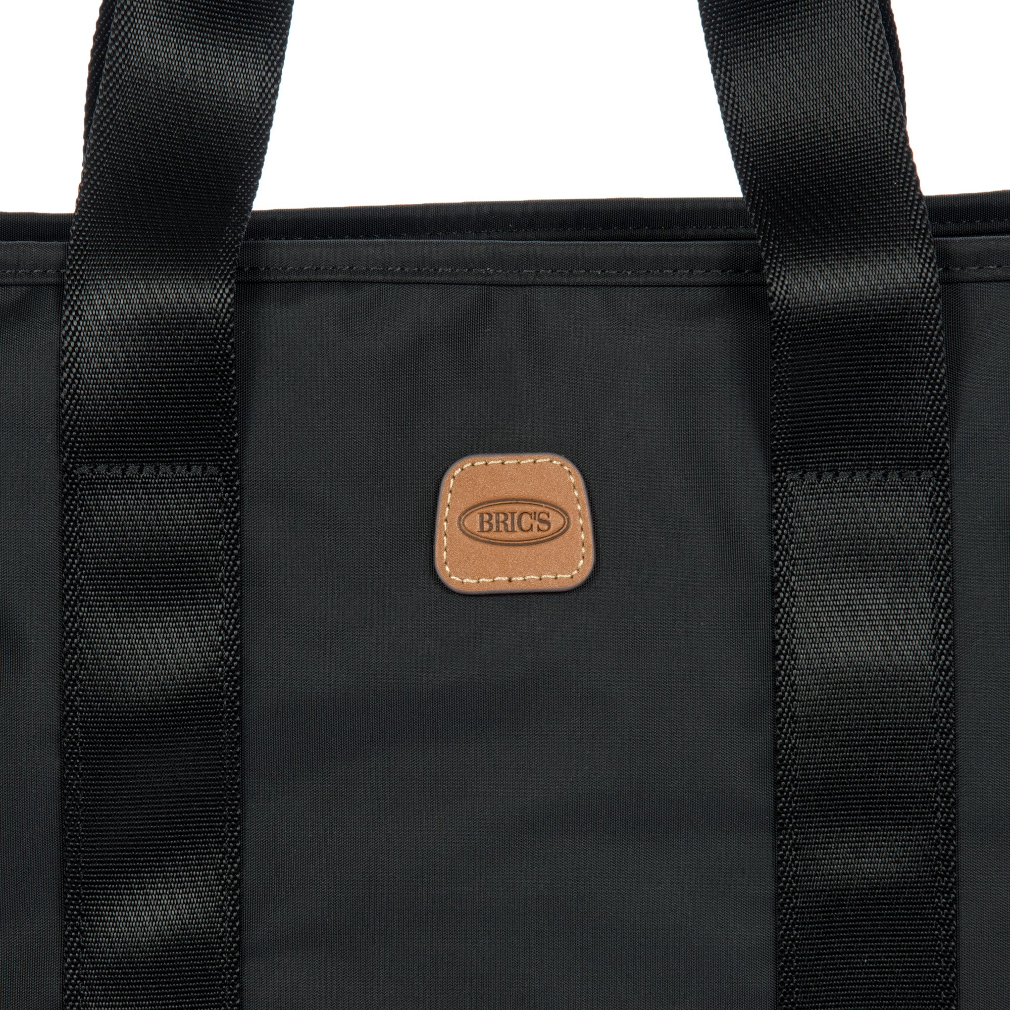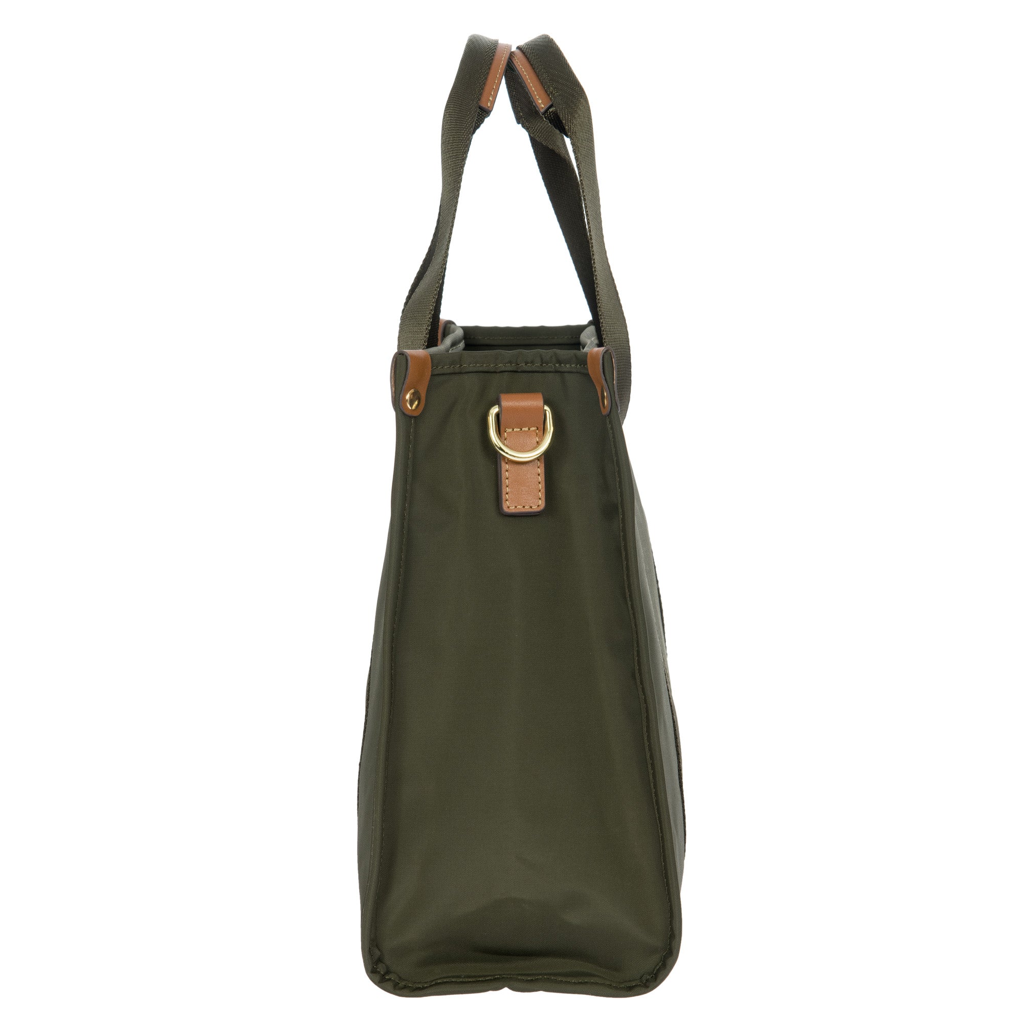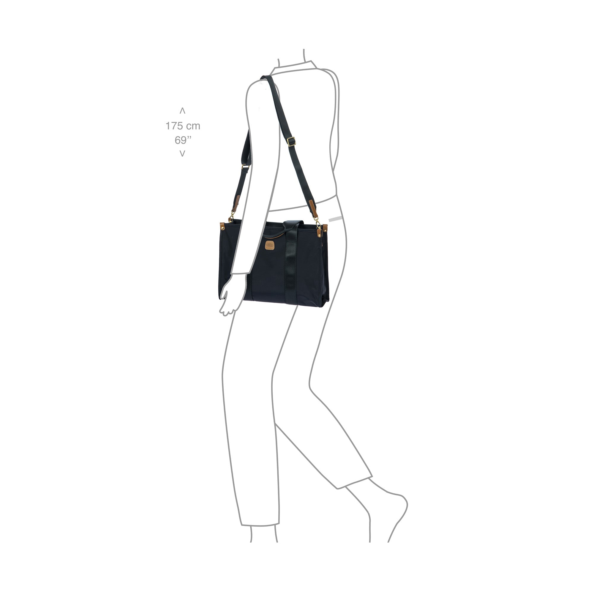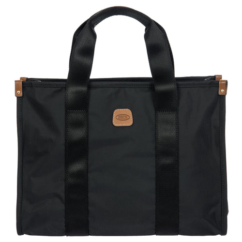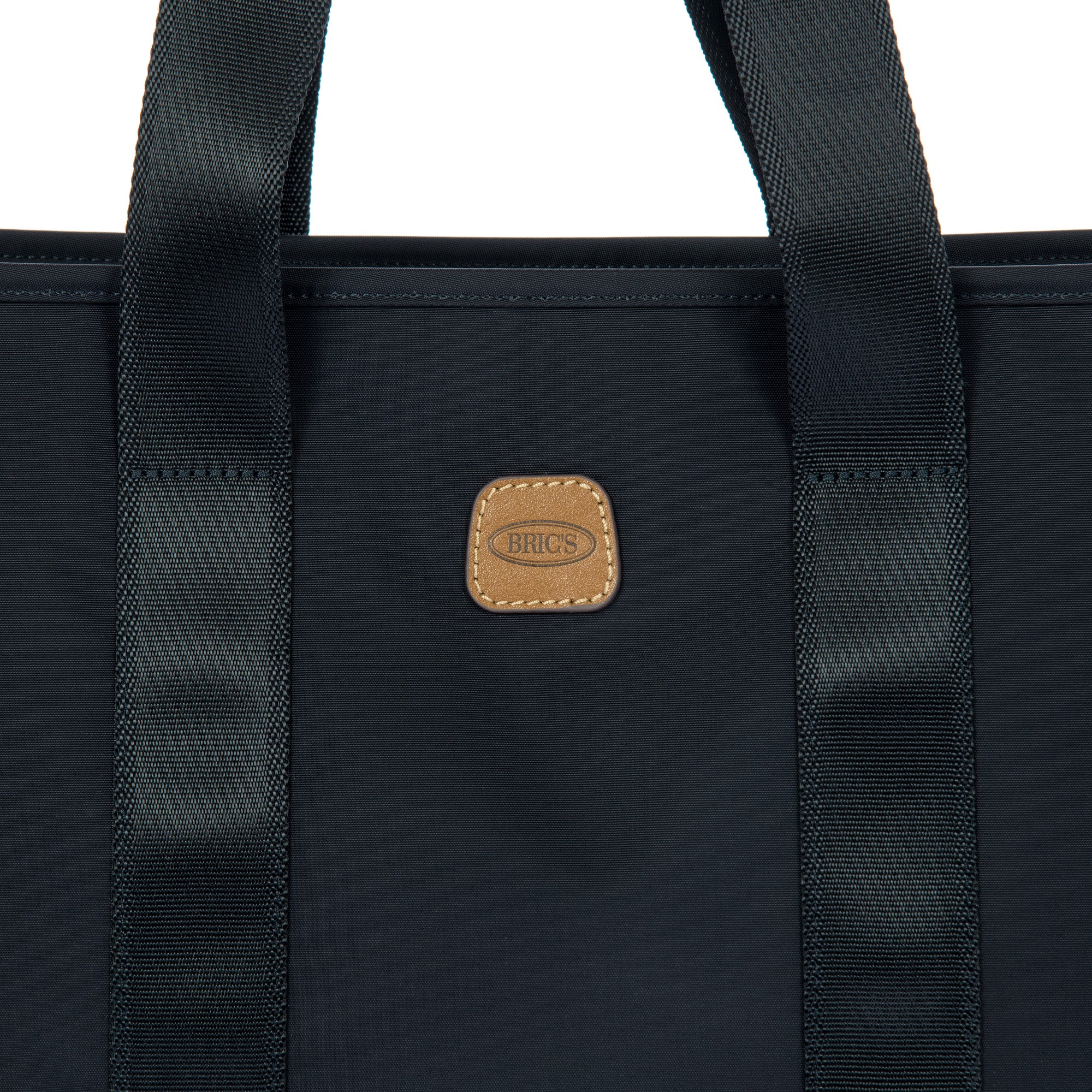 The X-Collection Opera Bag combines volume and essential lines, and is made of a water-proof, recycled fabric. Reinforced bottom, padded tablet pocket, double handle and removable shoulder strap for this functionally elegant bag. Safe zipped fastening. This functional 24/7 bag is embellished by ribbons and genuine leather details - Bric's hallmark.