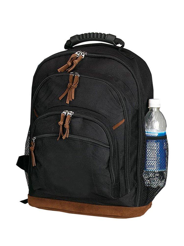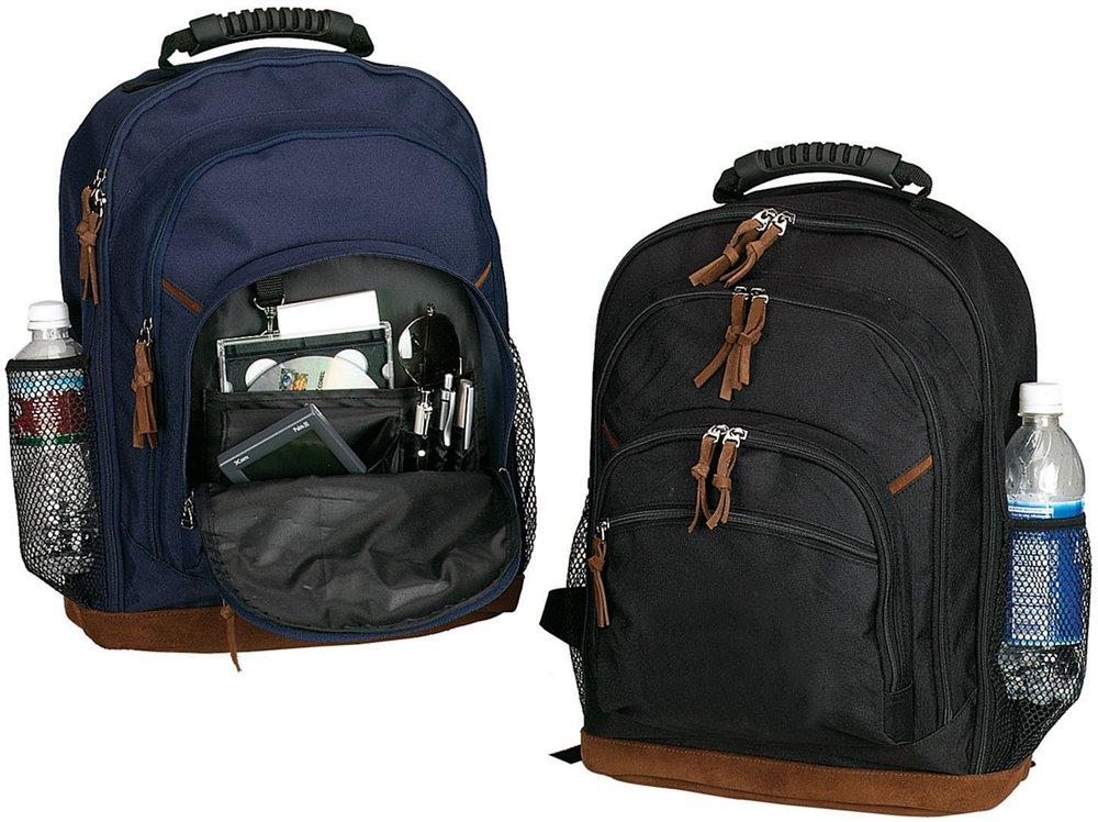 Made of 600D polyester with leather bottom and trim 2 front zipperedcompartments with organizer pockets, pen loop and key ring holder Dual meshpockets at side with rubber handle at top 2 large main zippered compartments Apadded back gives this classic bag a contemporary twist