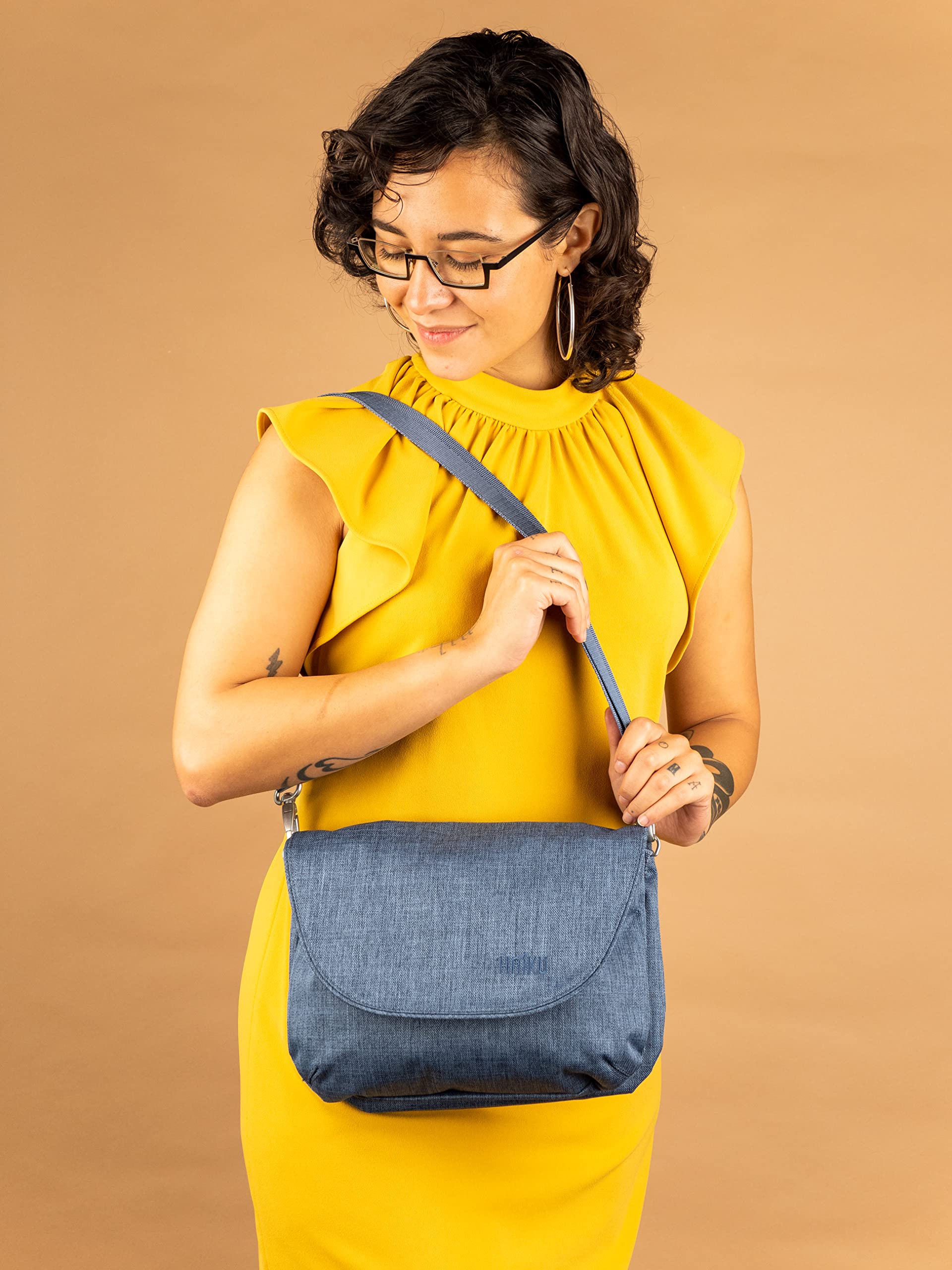 Minimalist on the outside, feature-rich on the inside, the double-compartment Bliss quickly expands to hold your wallet, notebook, and even a light sweater. The back zipper compartment secures your most precious items, while the front compartment gives you quick access on the move. Its comfortable, curved silhouette is perfect for wearing crossbody or slung over a shoulder with the adjustable strap.