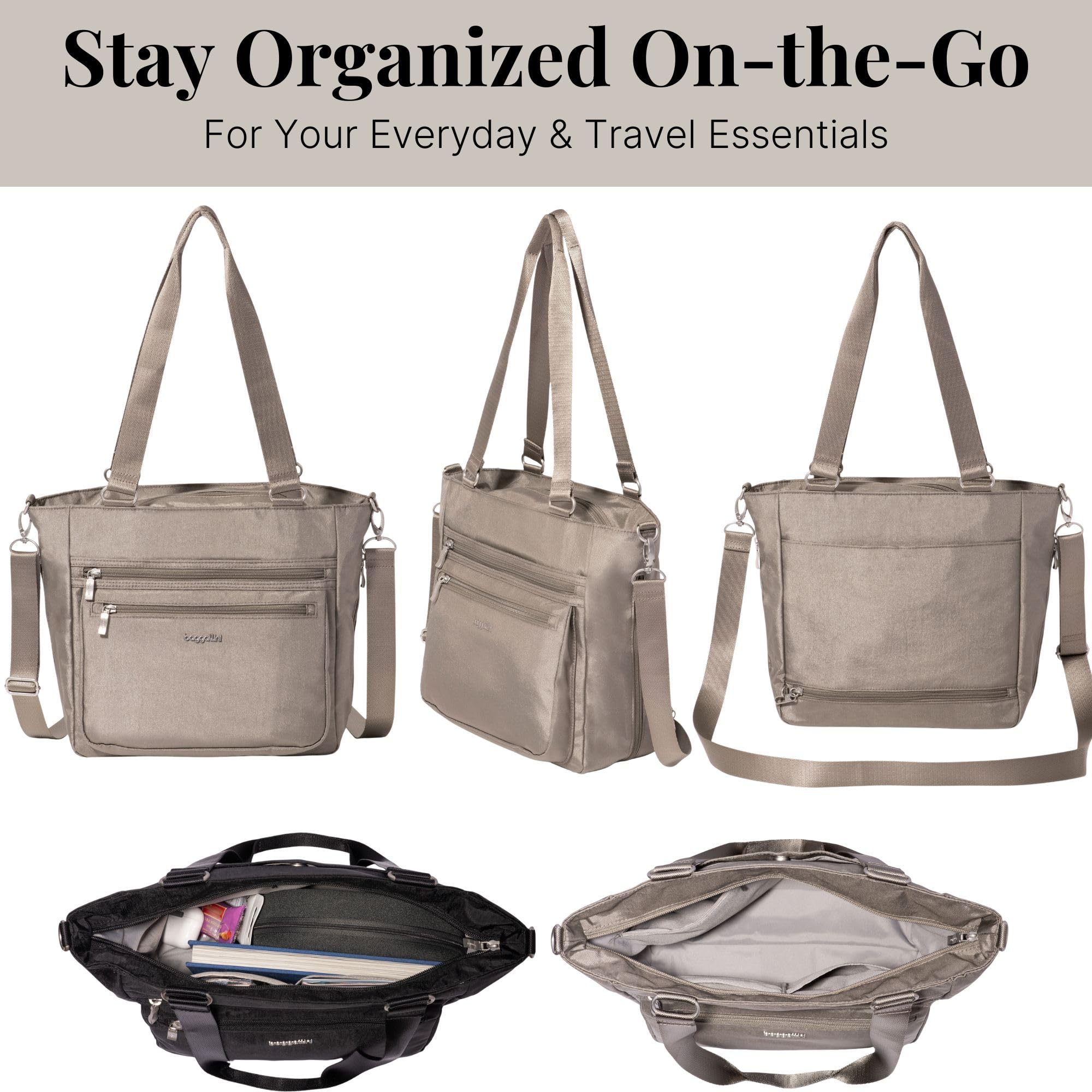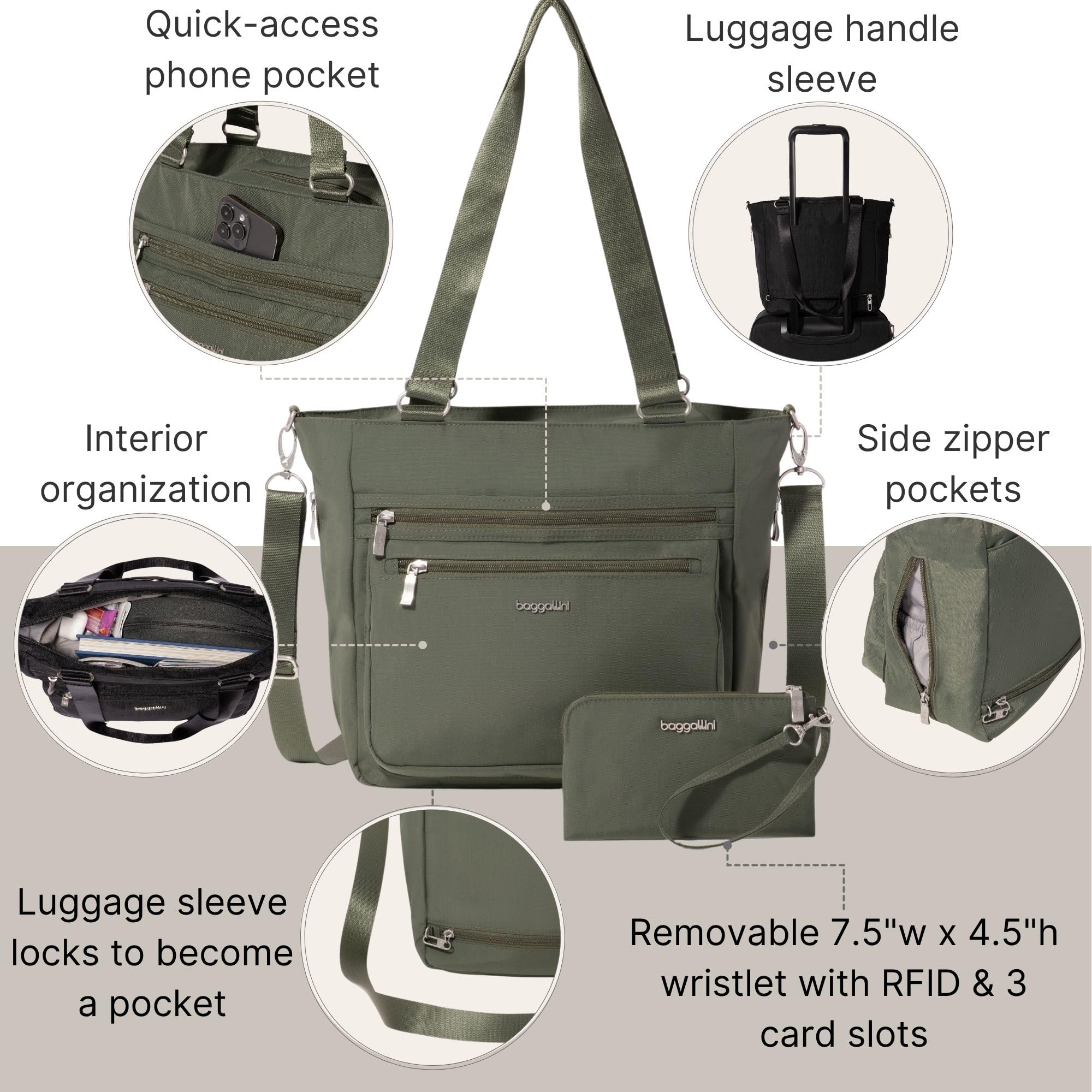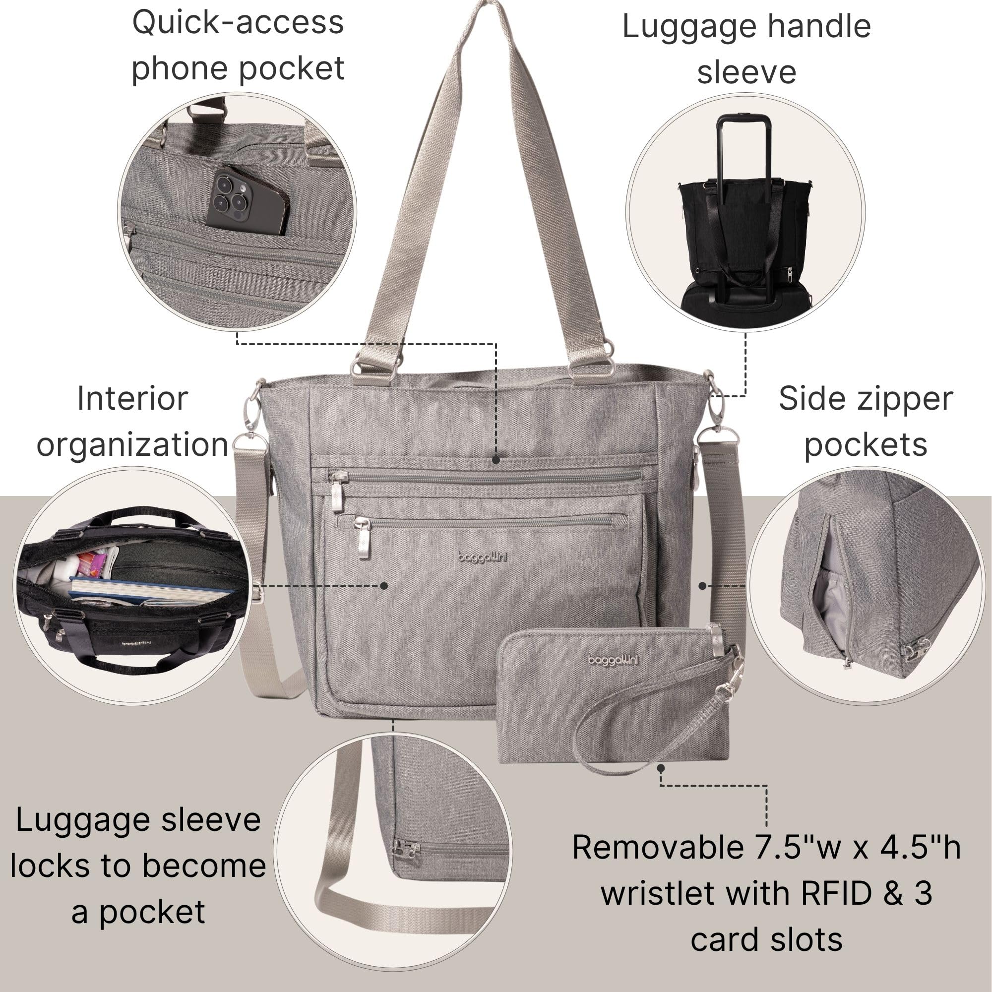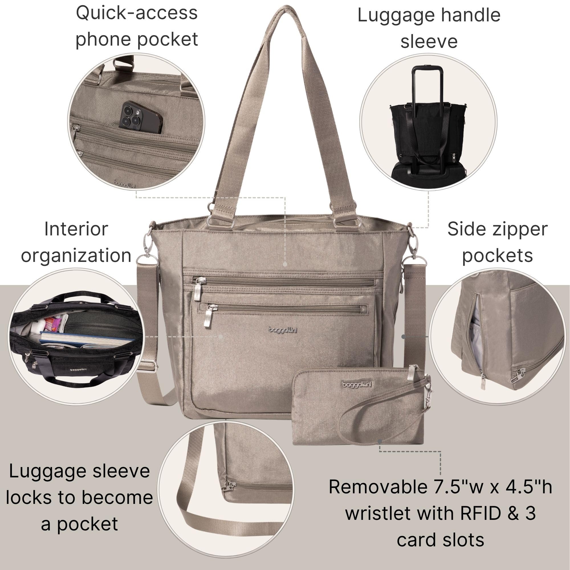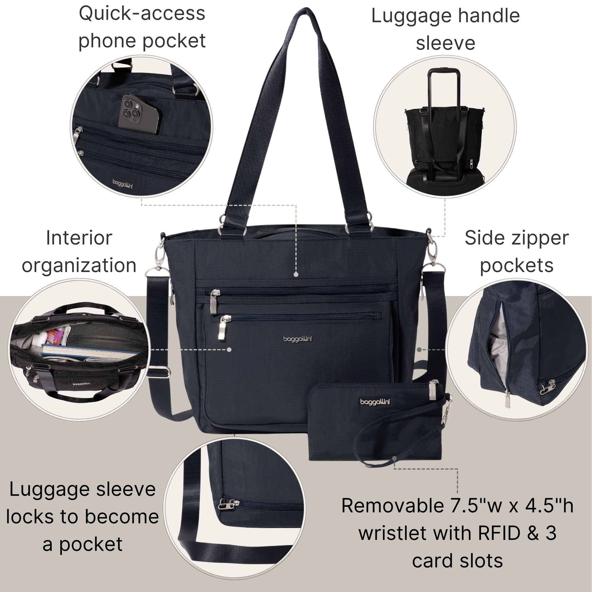 Just the right size for everyday errands and equally at home as an out-and-about travel bag, this tote bag comes complete with a water bottle pocket and an RFID-protected wristlet. A convenient luggage handle sleeve helps you stack your bags while youre catching connecting flights, and the wide variety of pockets ensure everything has a place.