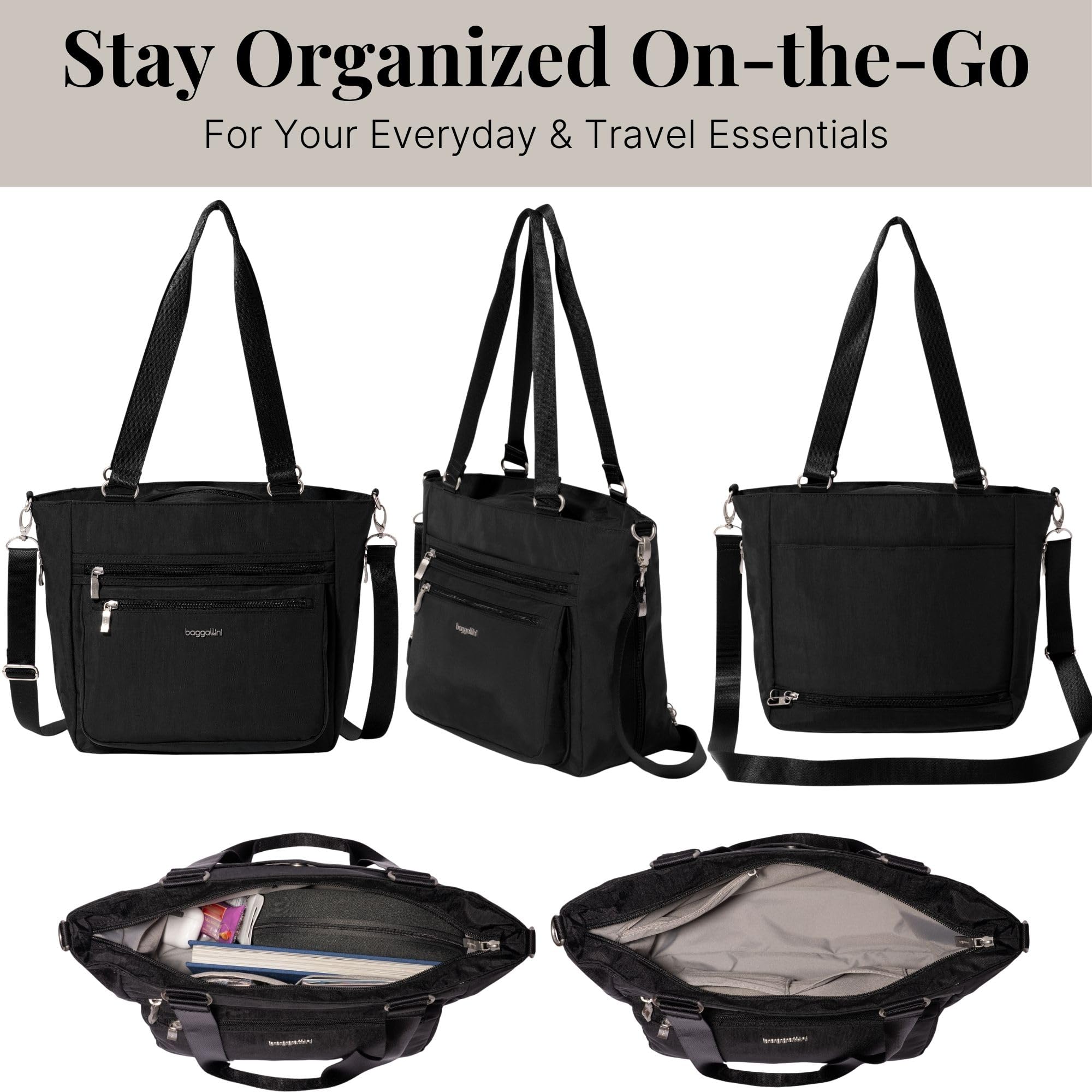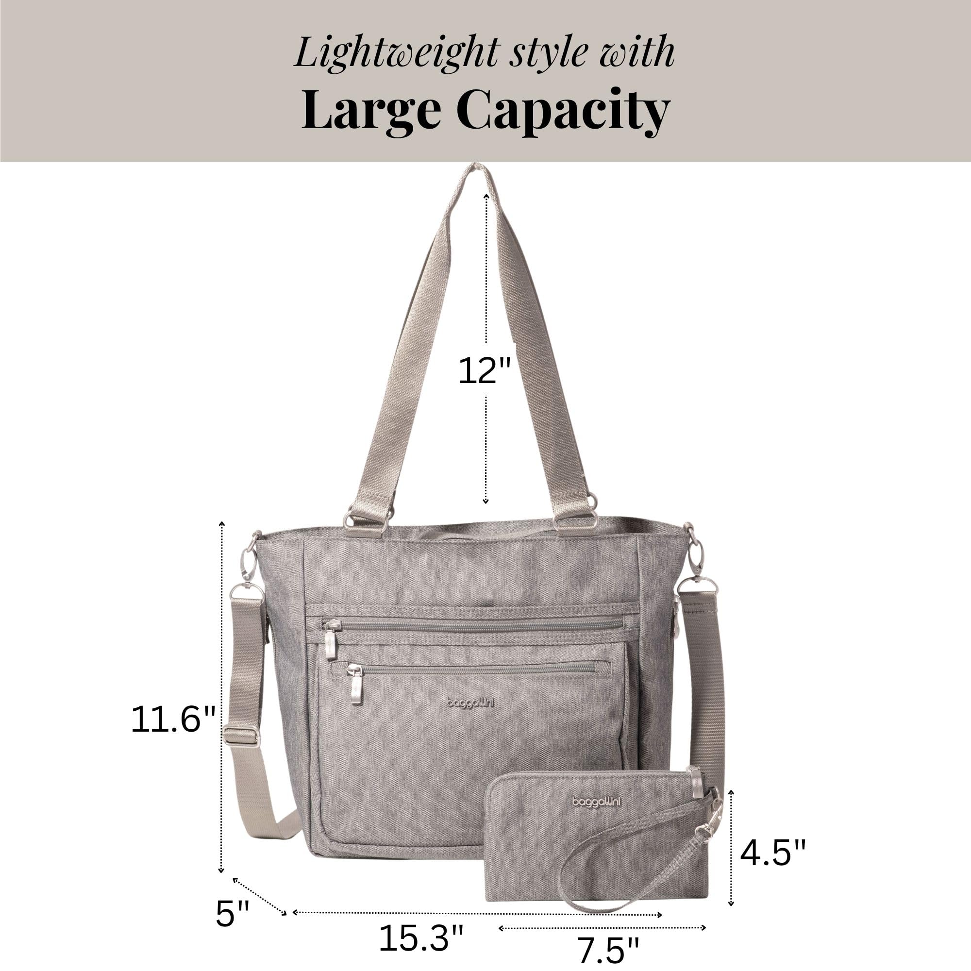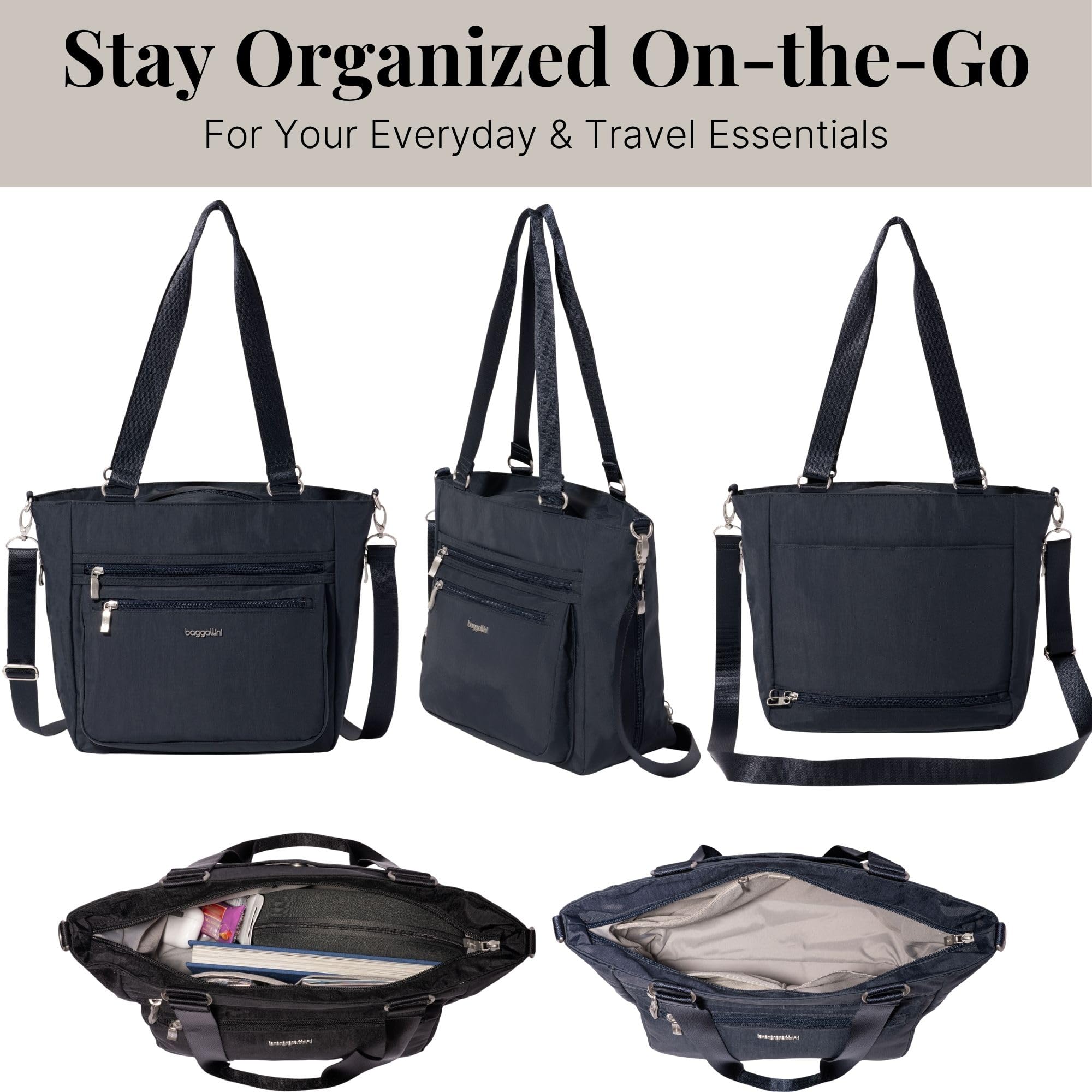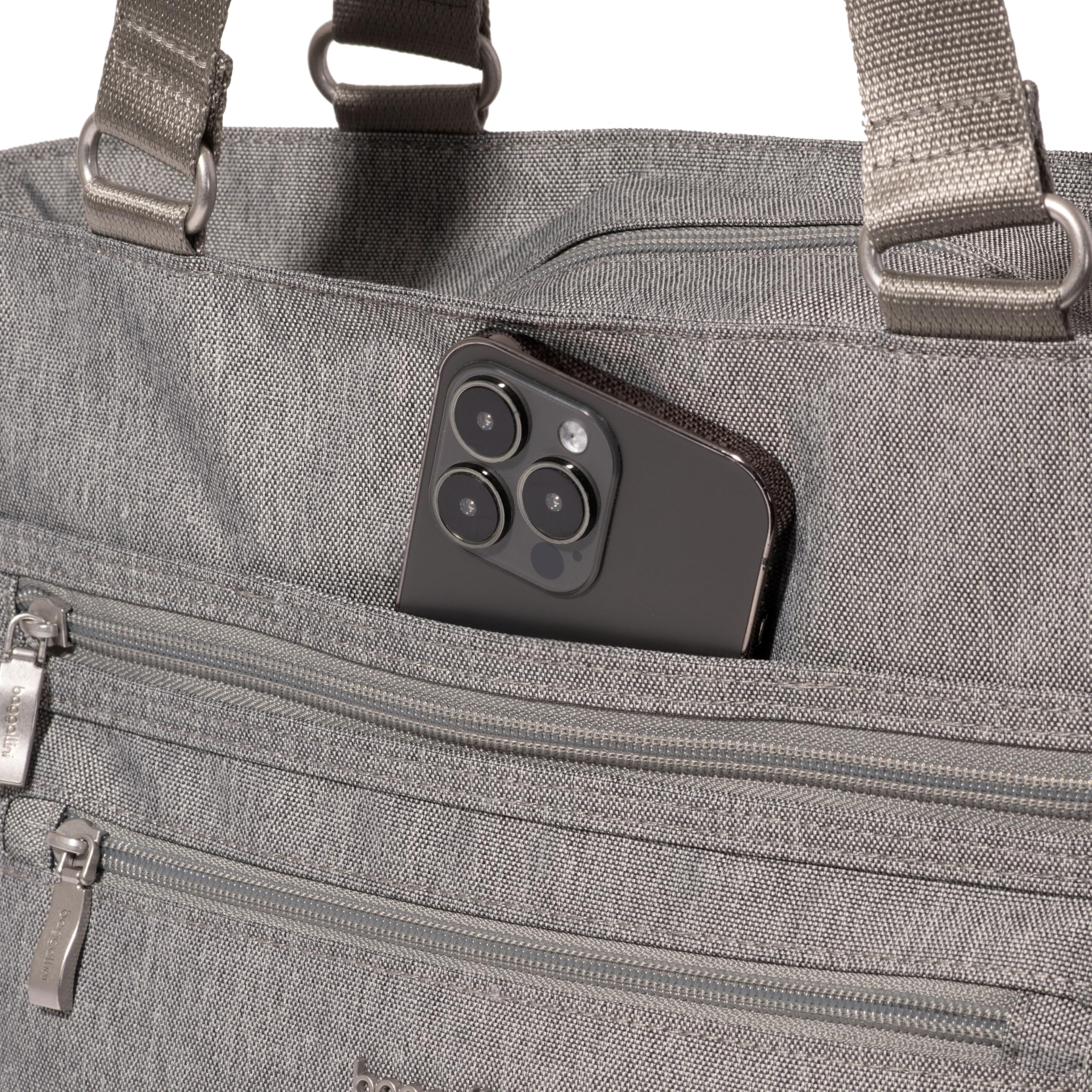 Just the right size for everyday errands and equally at home as an out-and-about travel bag, this tote bag comes complete with a water bottle pocket and an RFID-protected wristlet. A convenient luggage handle sleeve helps you stack your bags while youre catching connecting flights, and the wide variety of pockets ensure everything has a place.