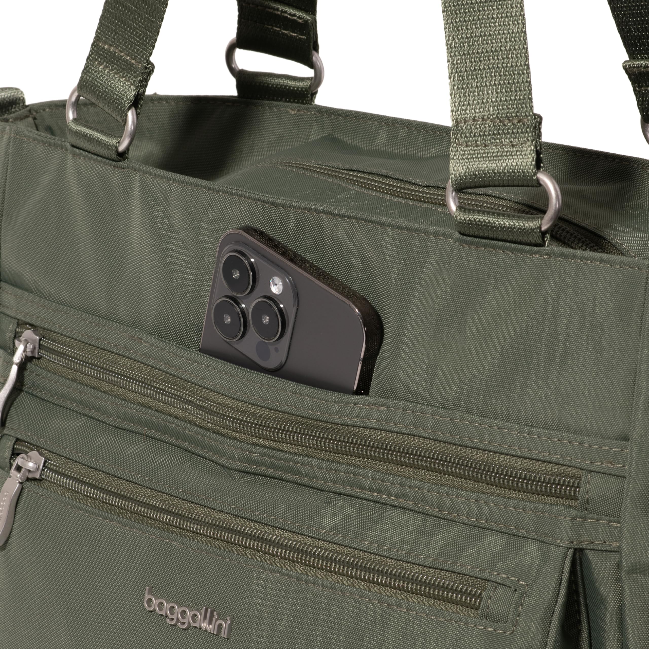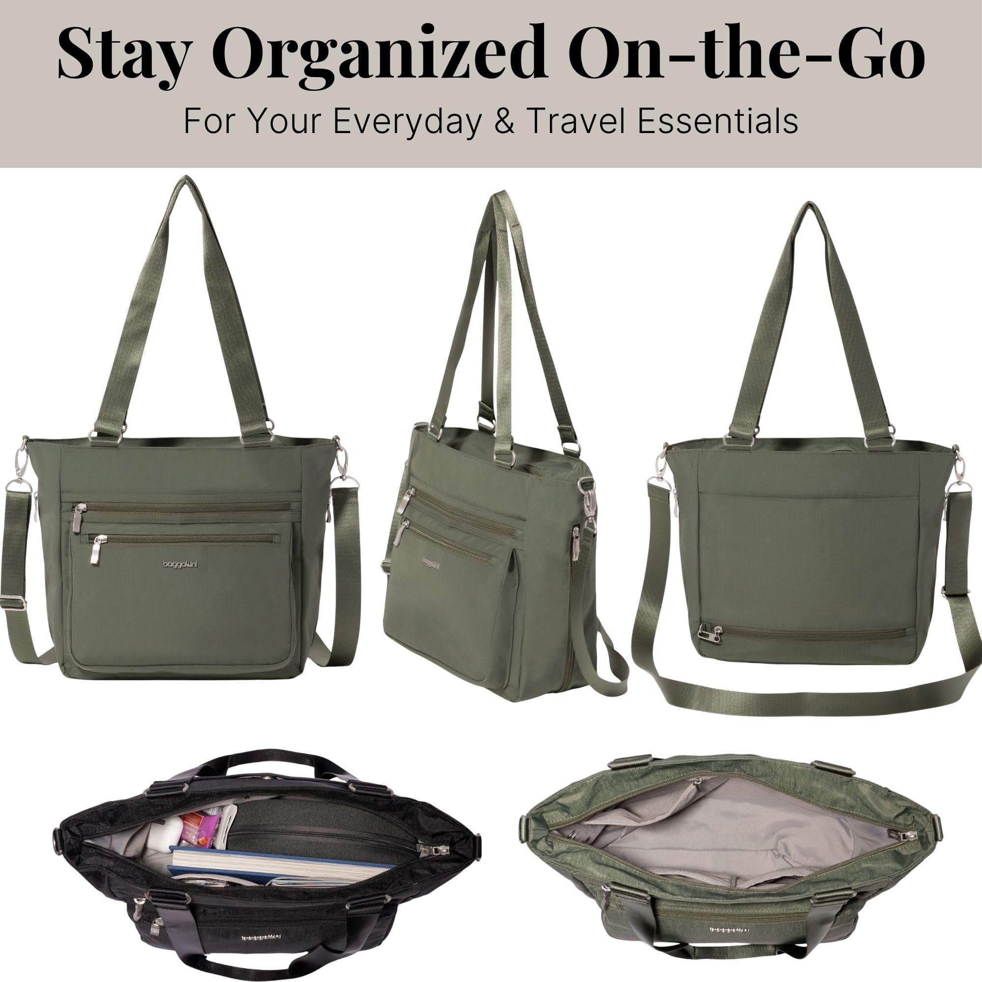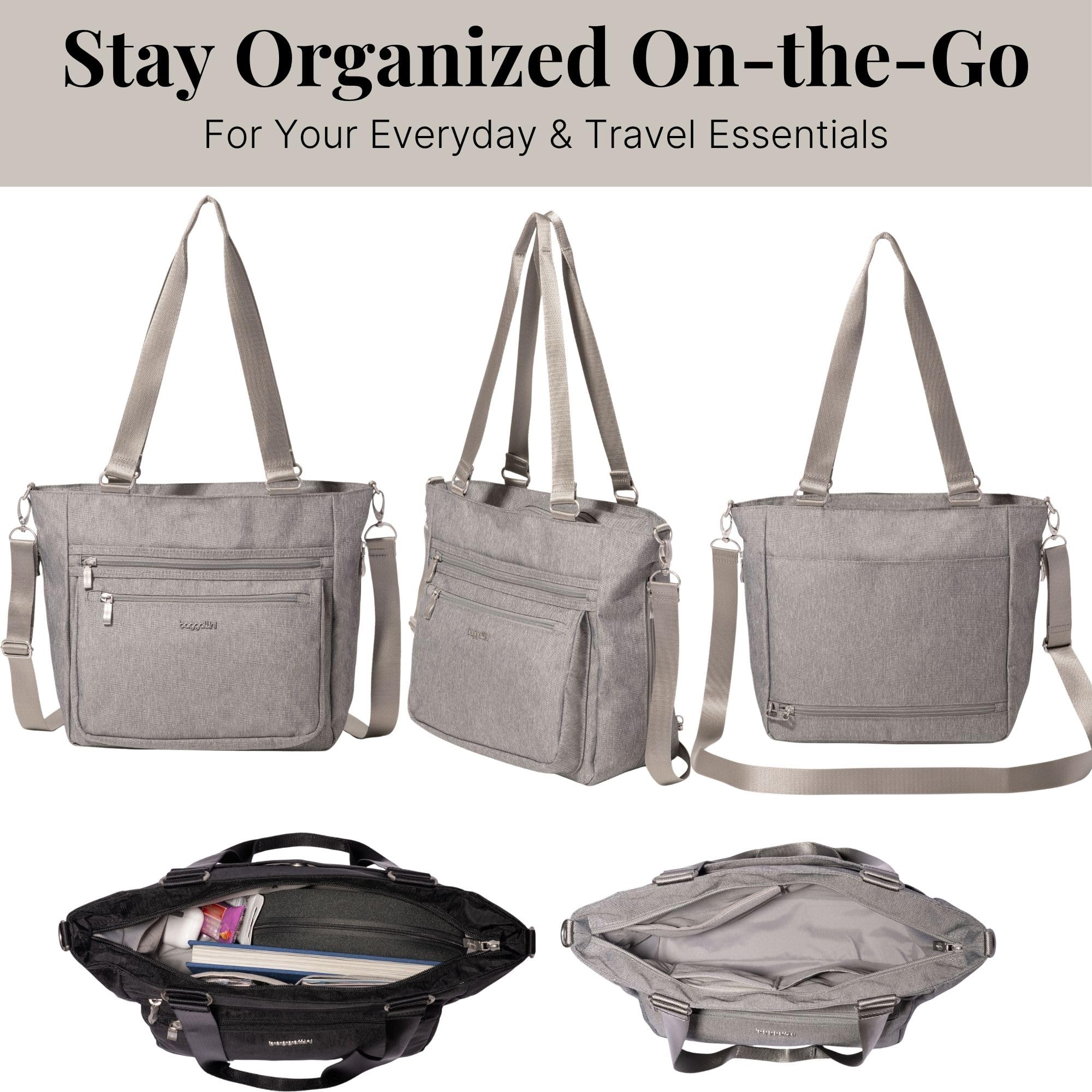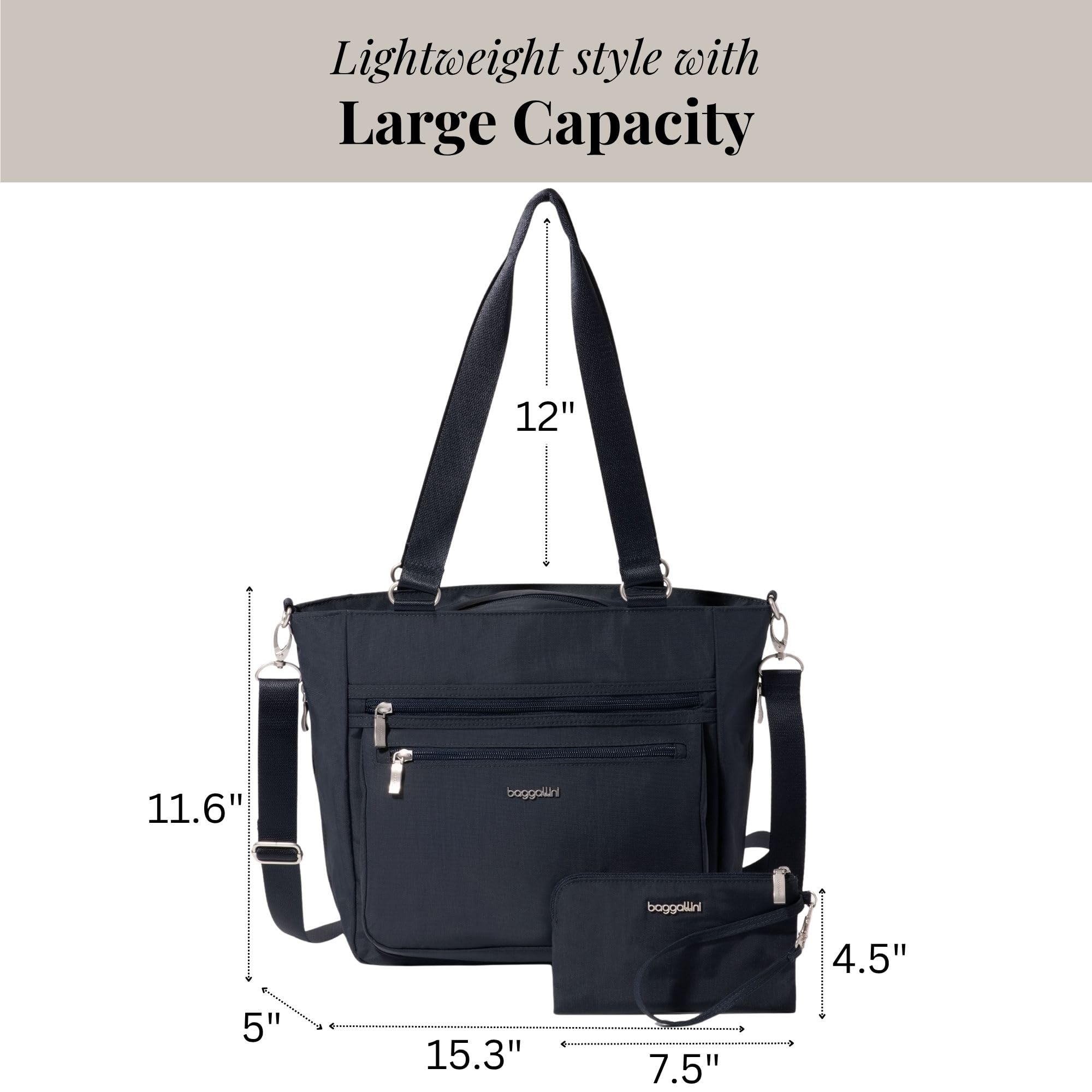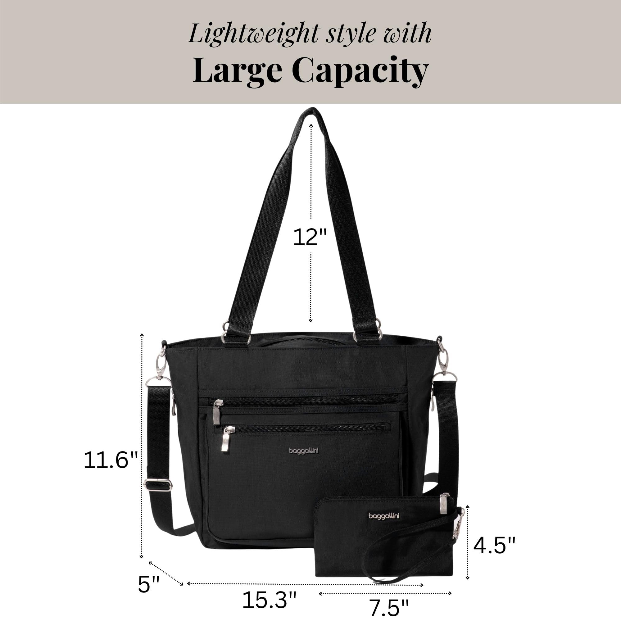 Just the right size for everyday errands and equally at home as an out-and-about travel bag, this tote bag comes complete with a water bottle pocket and an RFID-protected wristlet. A convenient luggage handle sleeve helps you stack your bags while youre catching connecting flights, and the wide variety of pockets ensure everything has a place.