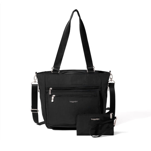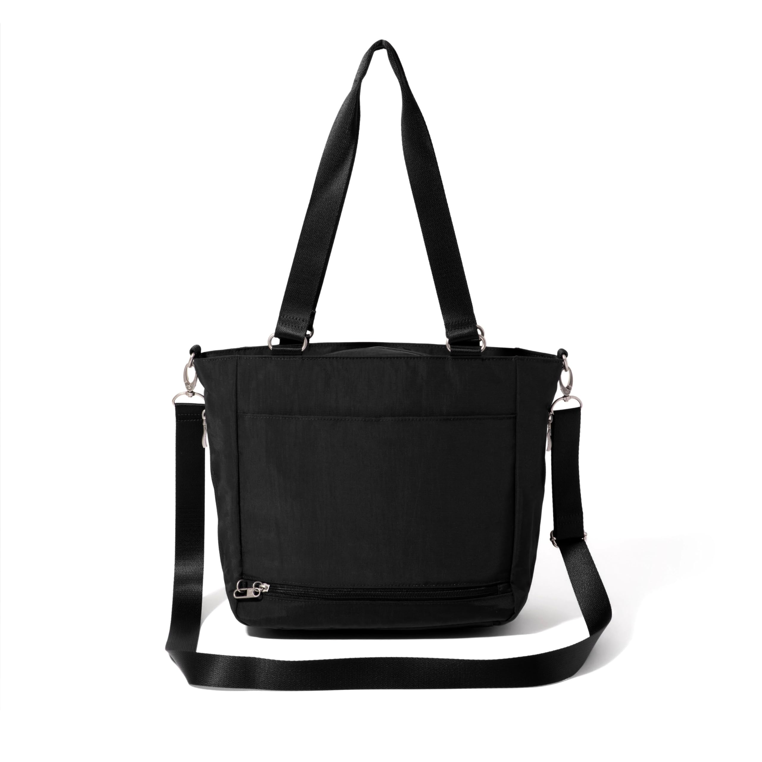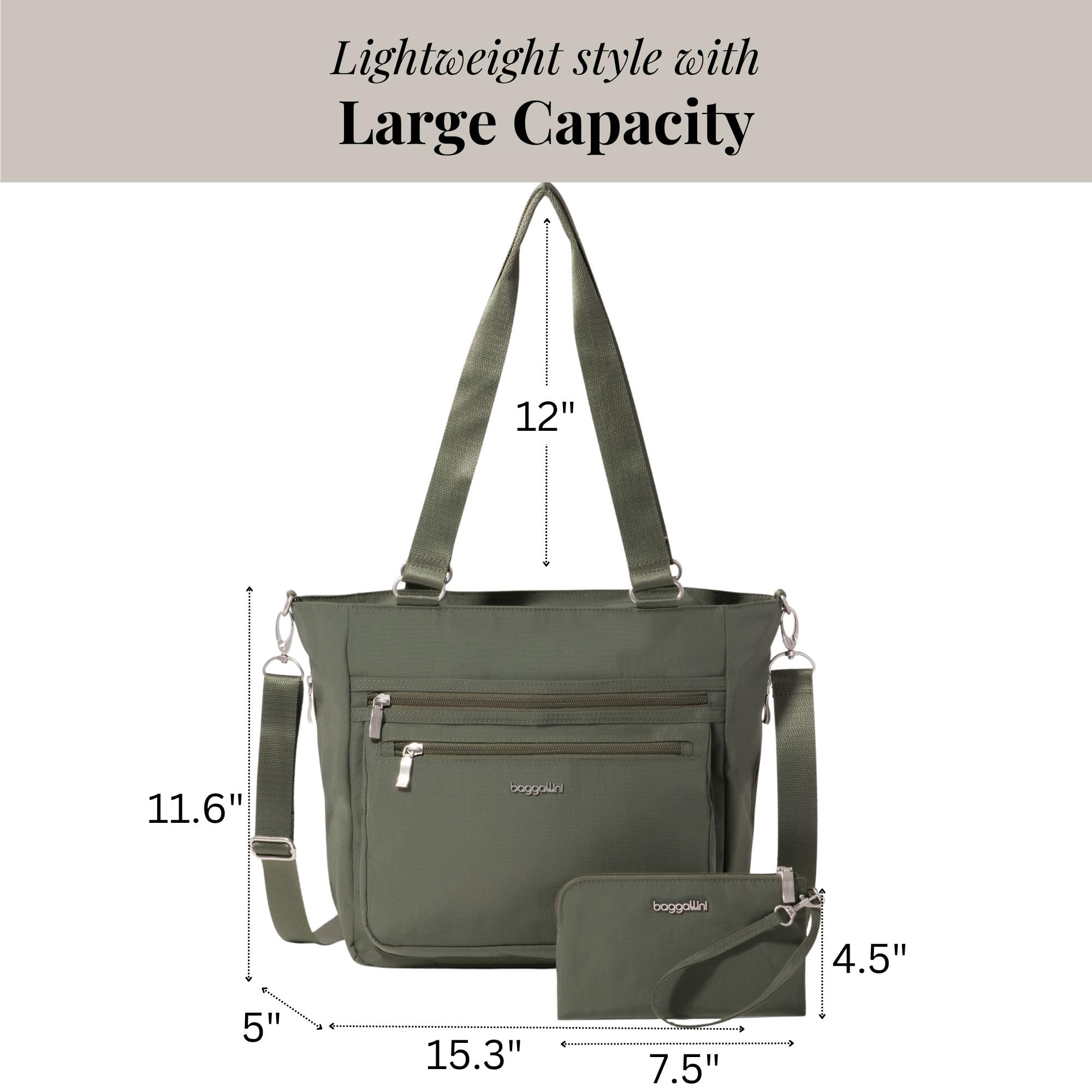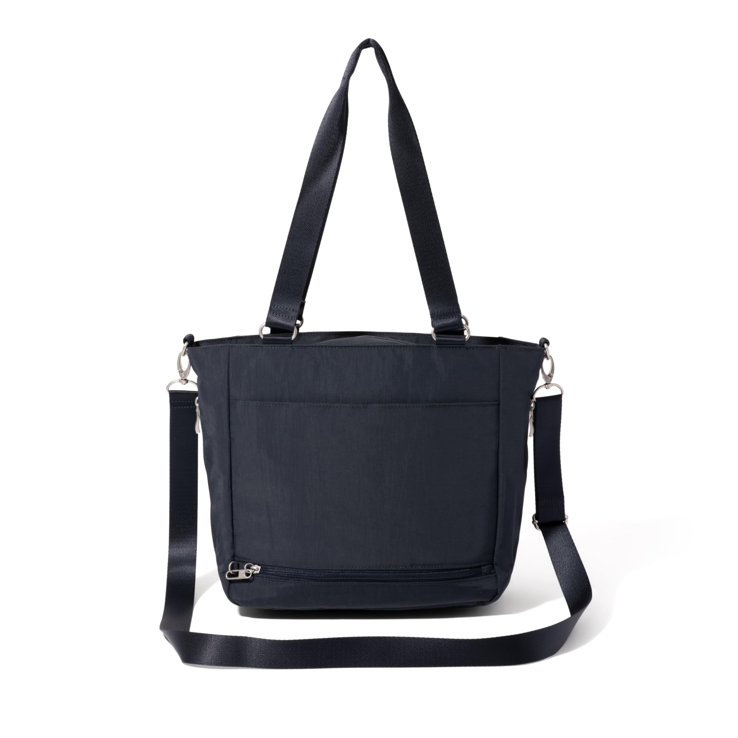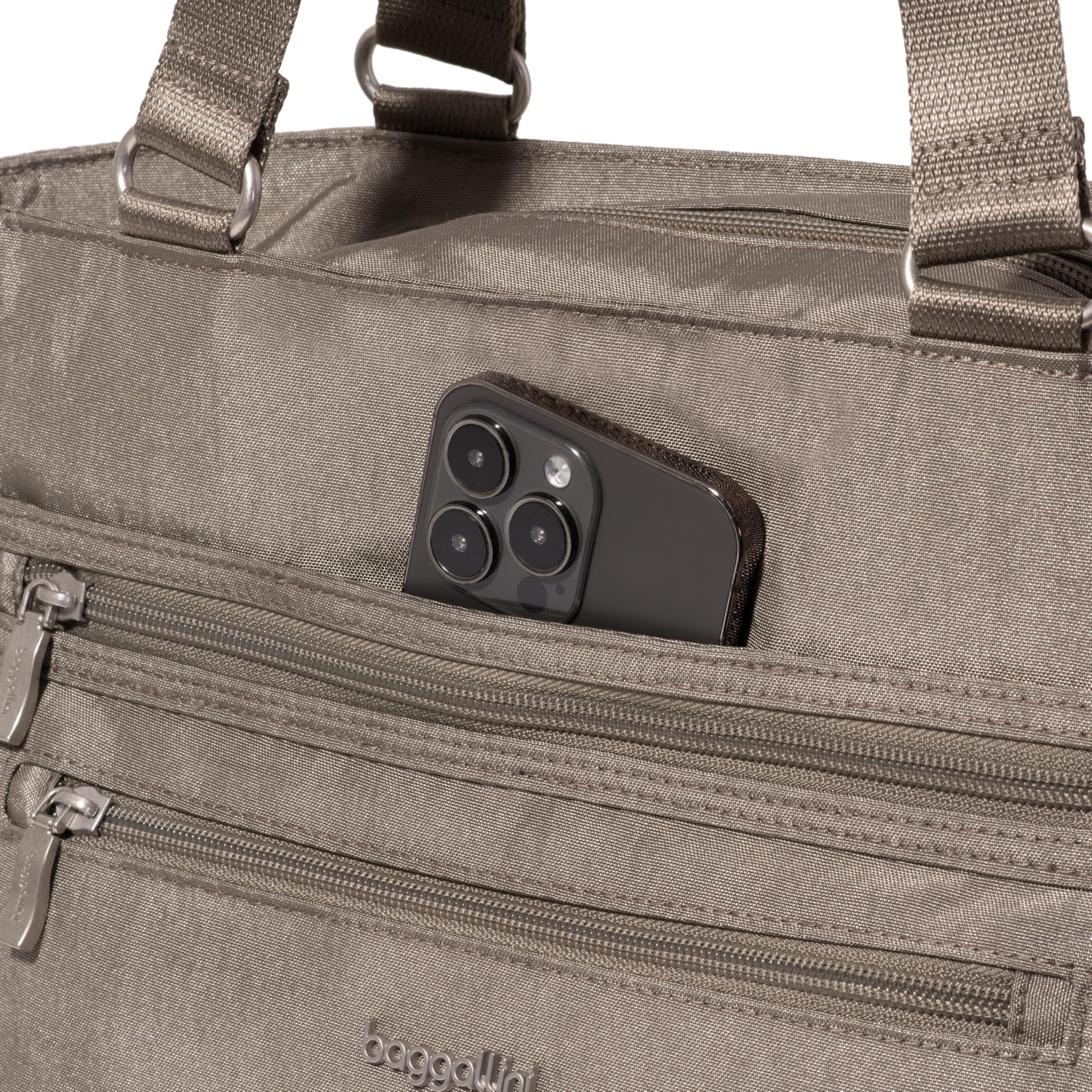 Just the right size for everyday errands and equally at home as an out-and-about travel bag, this tote bag comes complete with a water bottle pocket and an RFID-protected wristlet. A convenient luggage handle sleeve helps you stack your bags while youre catching connecting flights, and the wide variety of pockets ensure everything has a place.