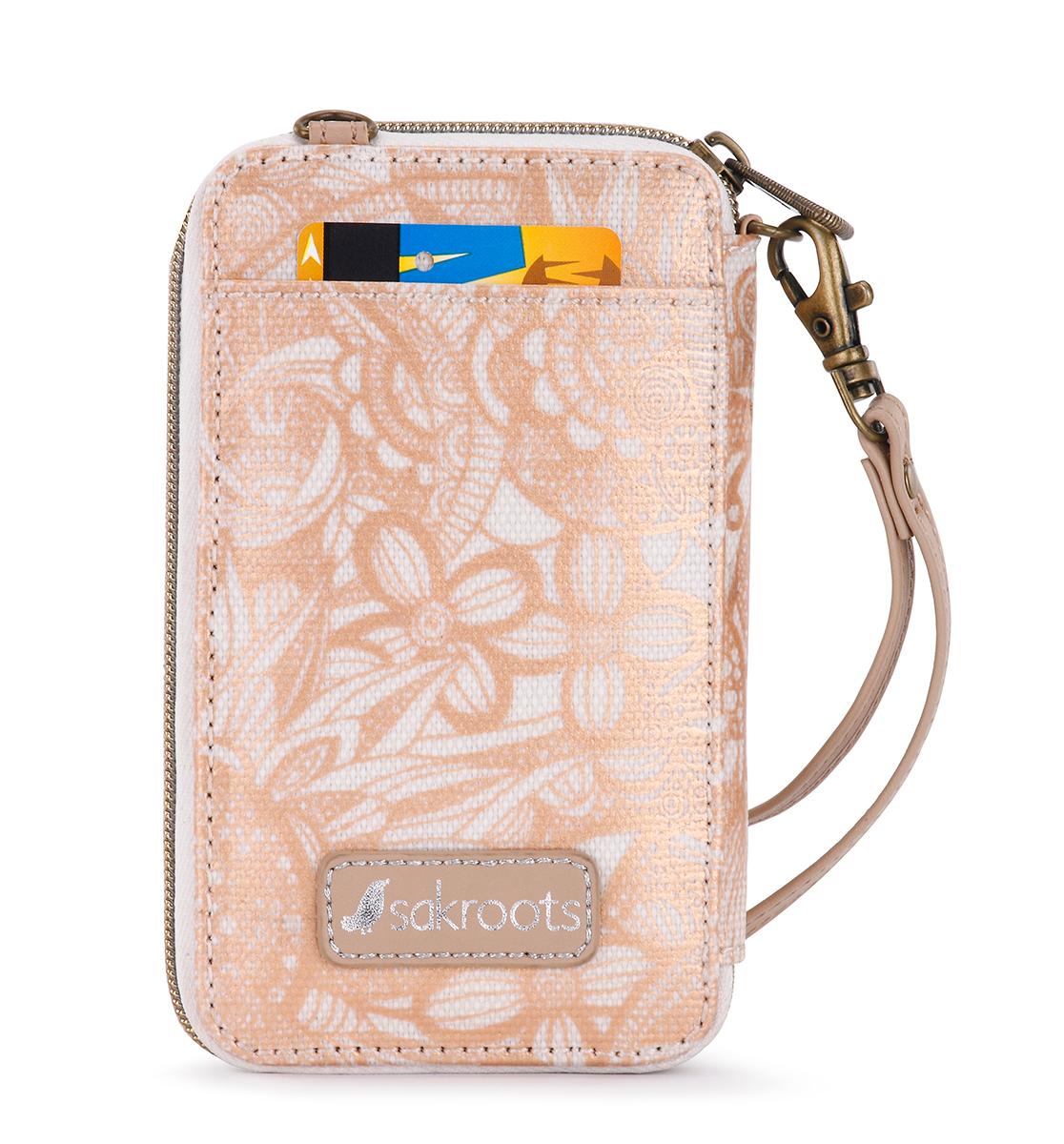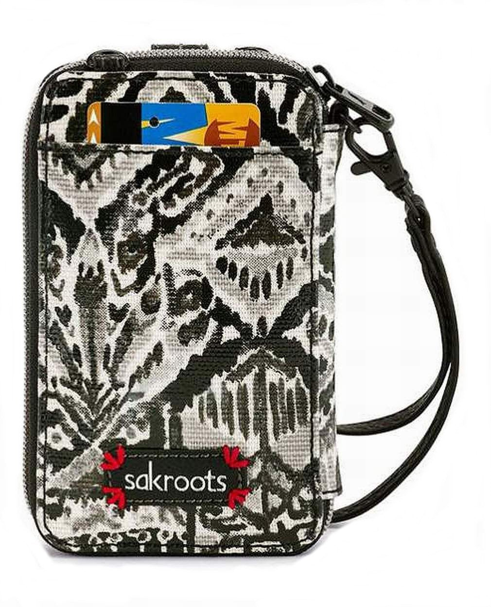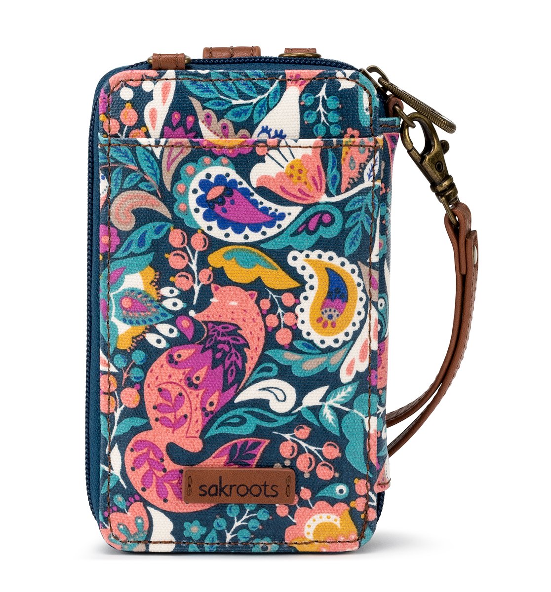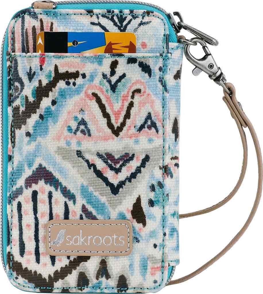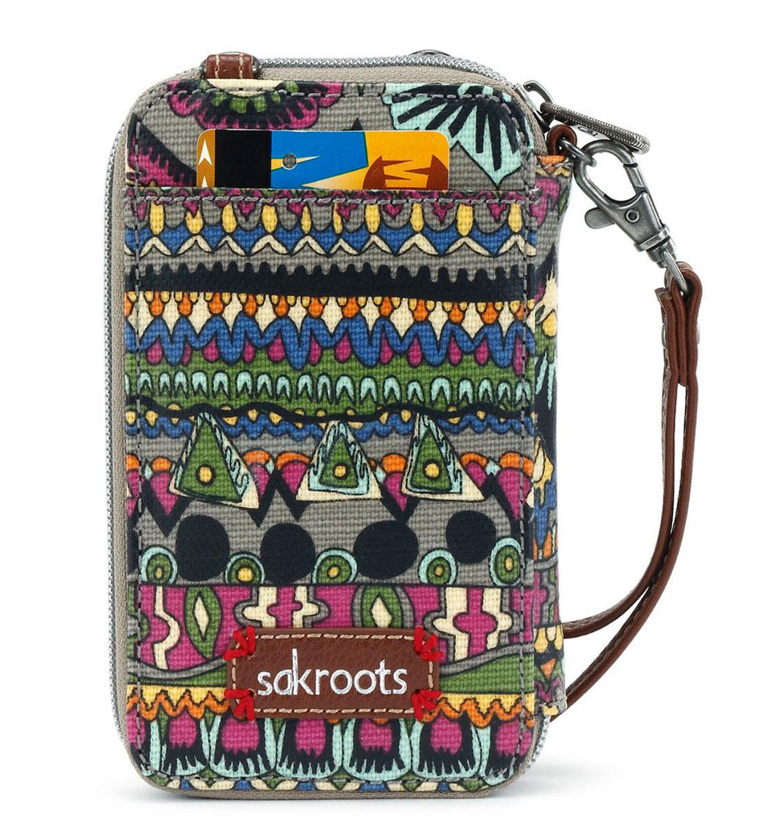 Sakroots Artist Circle Smartphone Wristlet is small and compact and perfect for touring around a new city. With a wristlet strap or crossbody strap you will always be hands-free and comfortable. Slip your phone inside the snap closure pocket while keeping cards and bills safely in a zippered pocket.