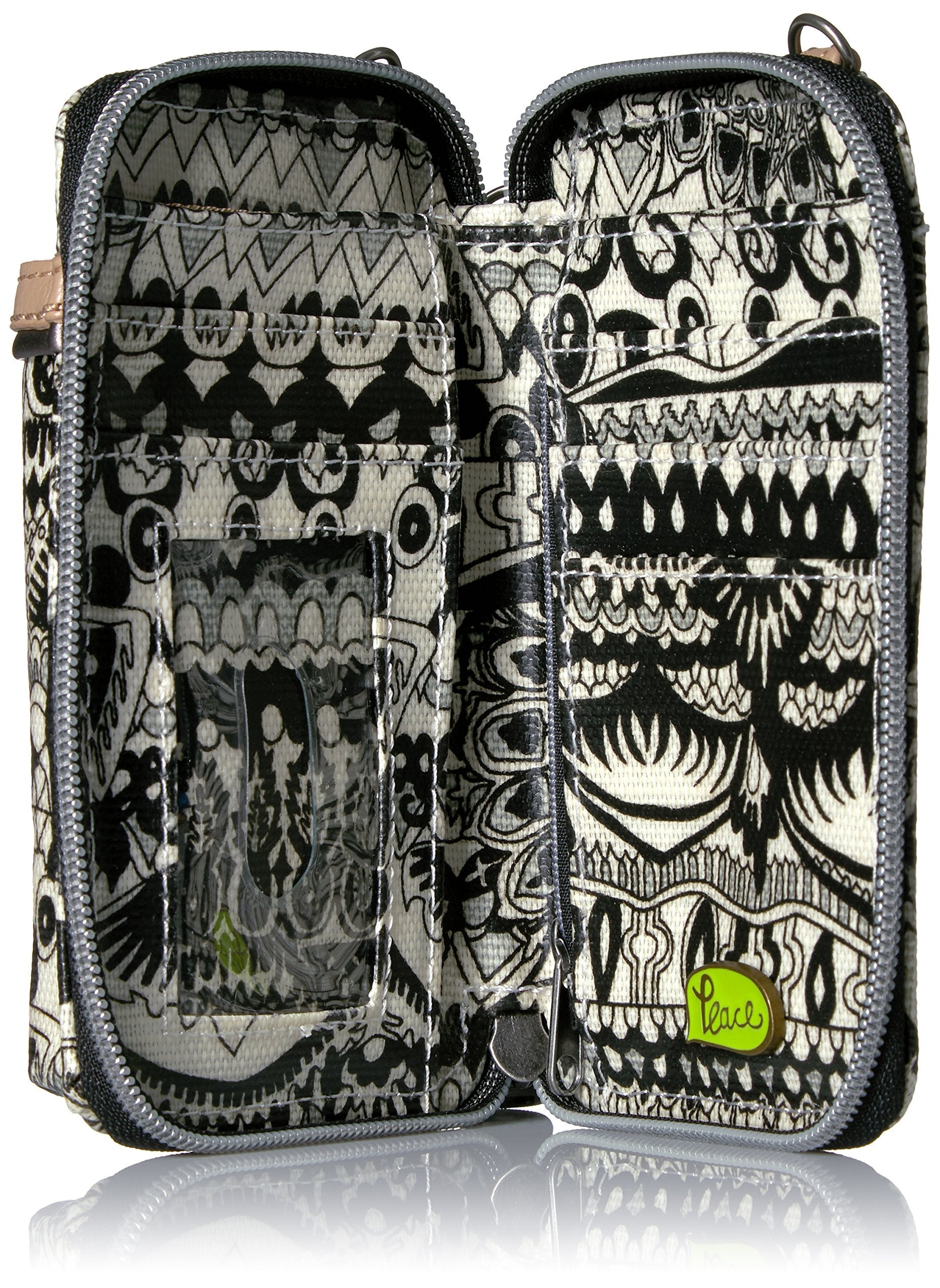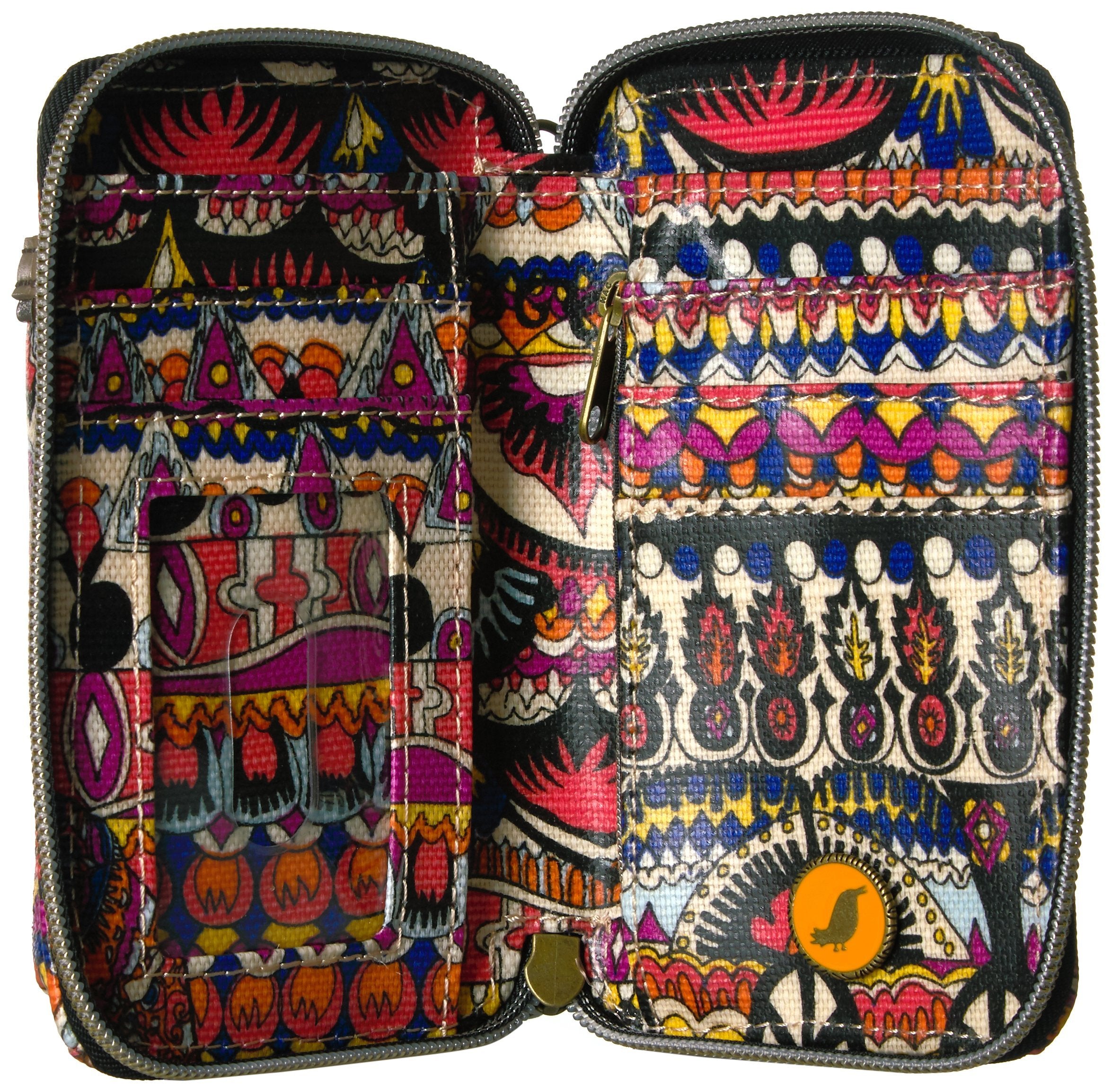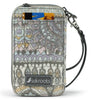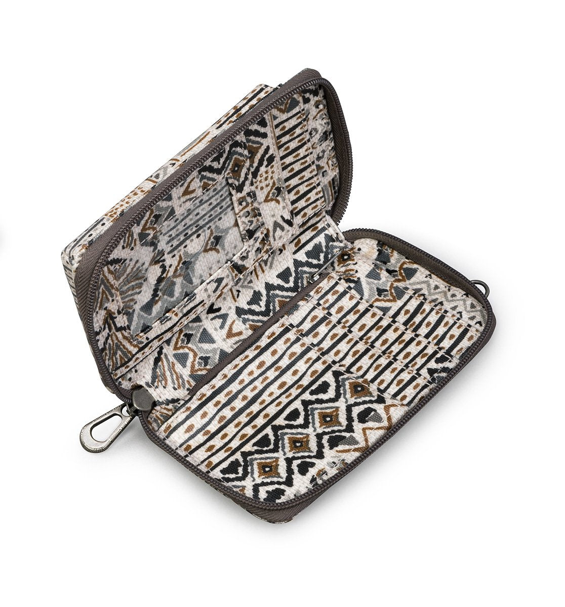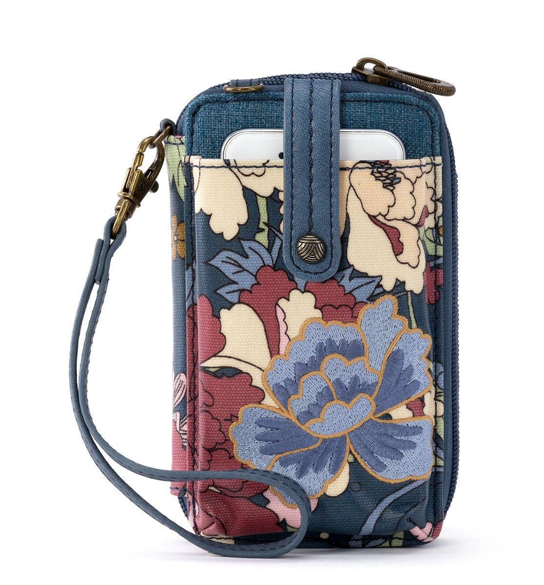 Sakroots Artist Circle Smartphone Wristlet is small and compact and perfect for touring around a new city. With a wristlet strap or crossbody strap you will always be hands-free and comfortable. Slip your phone inside the snap closure pocket while keeping cards and bills safely in a zippered pocket.