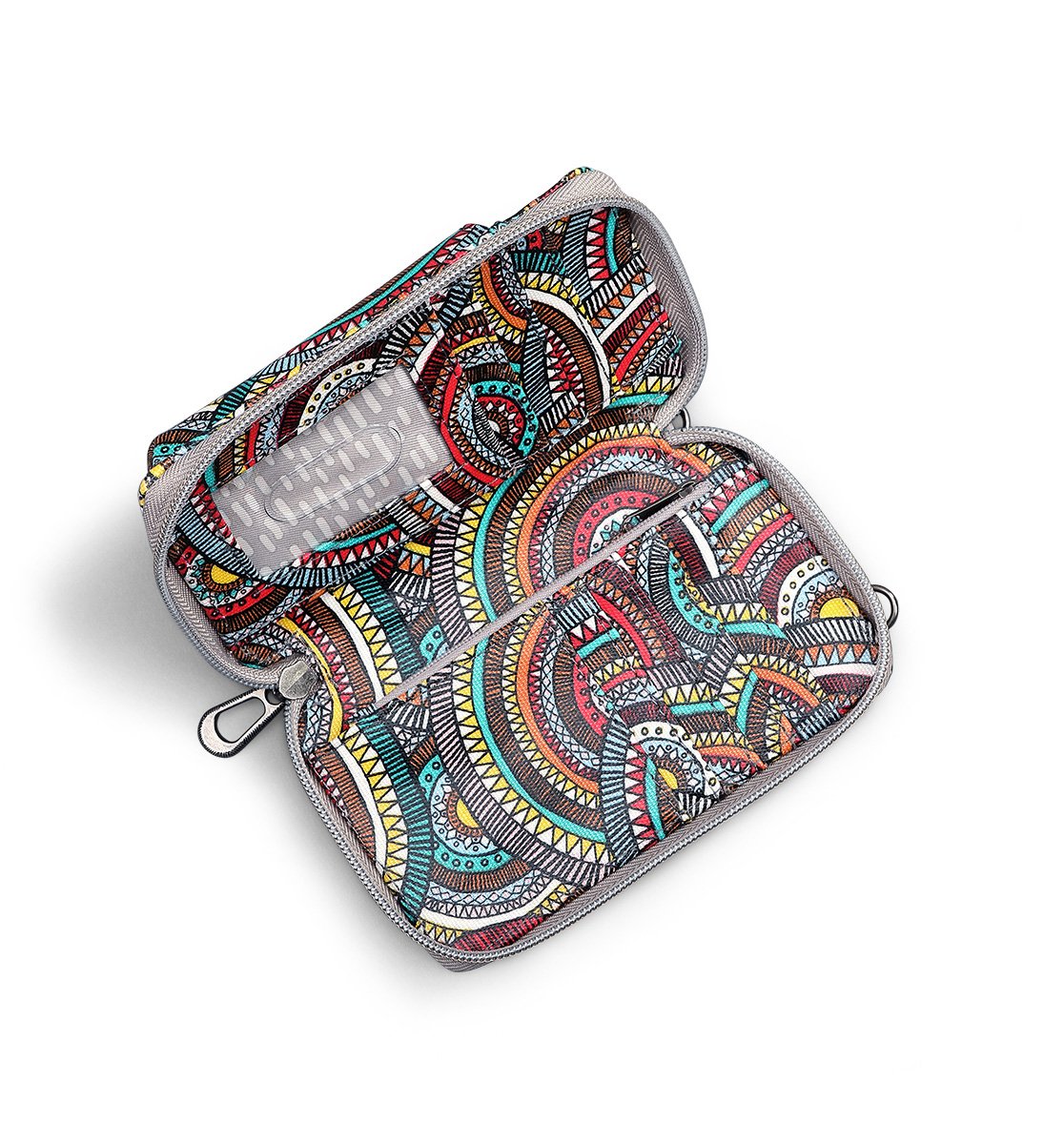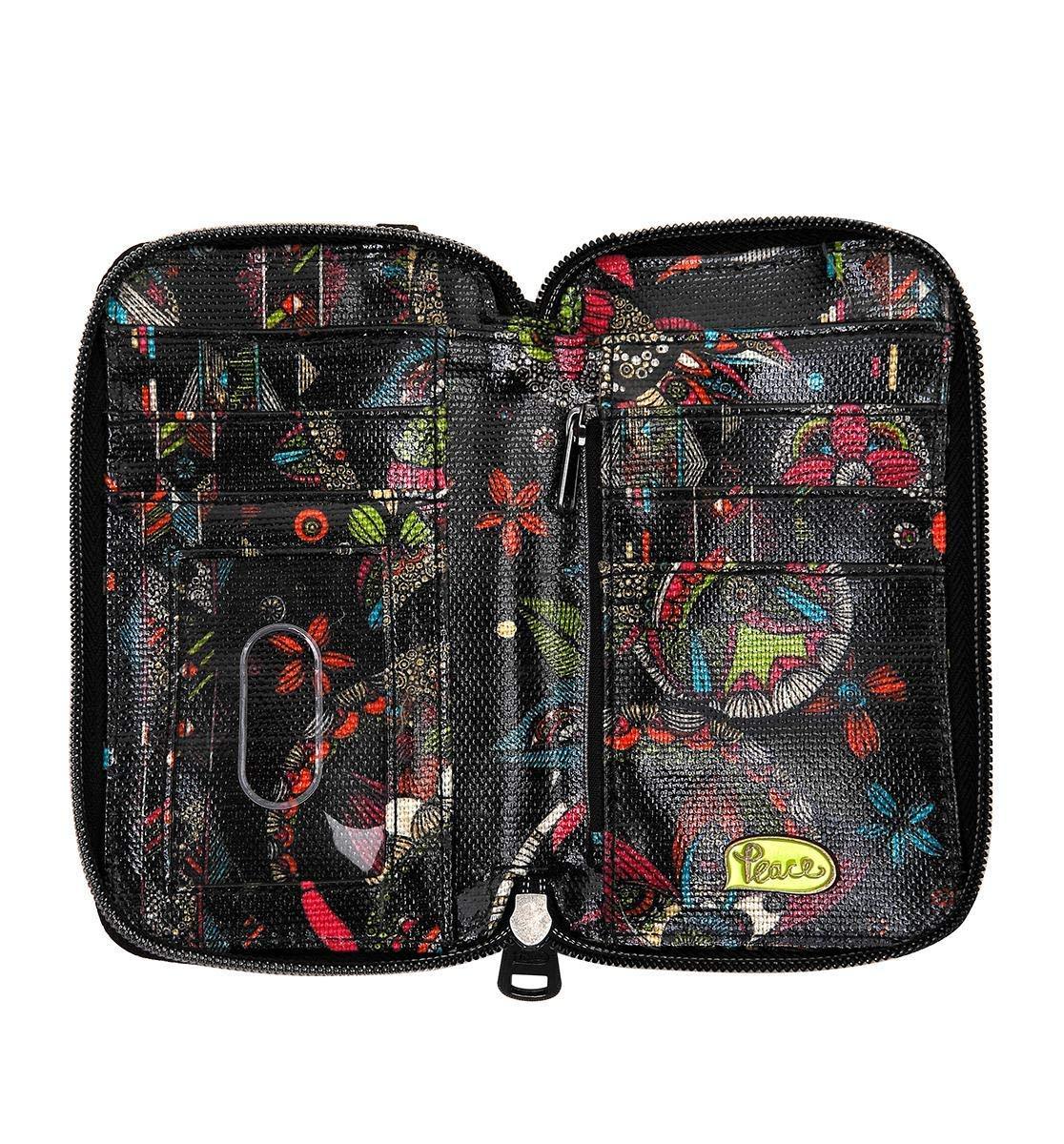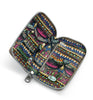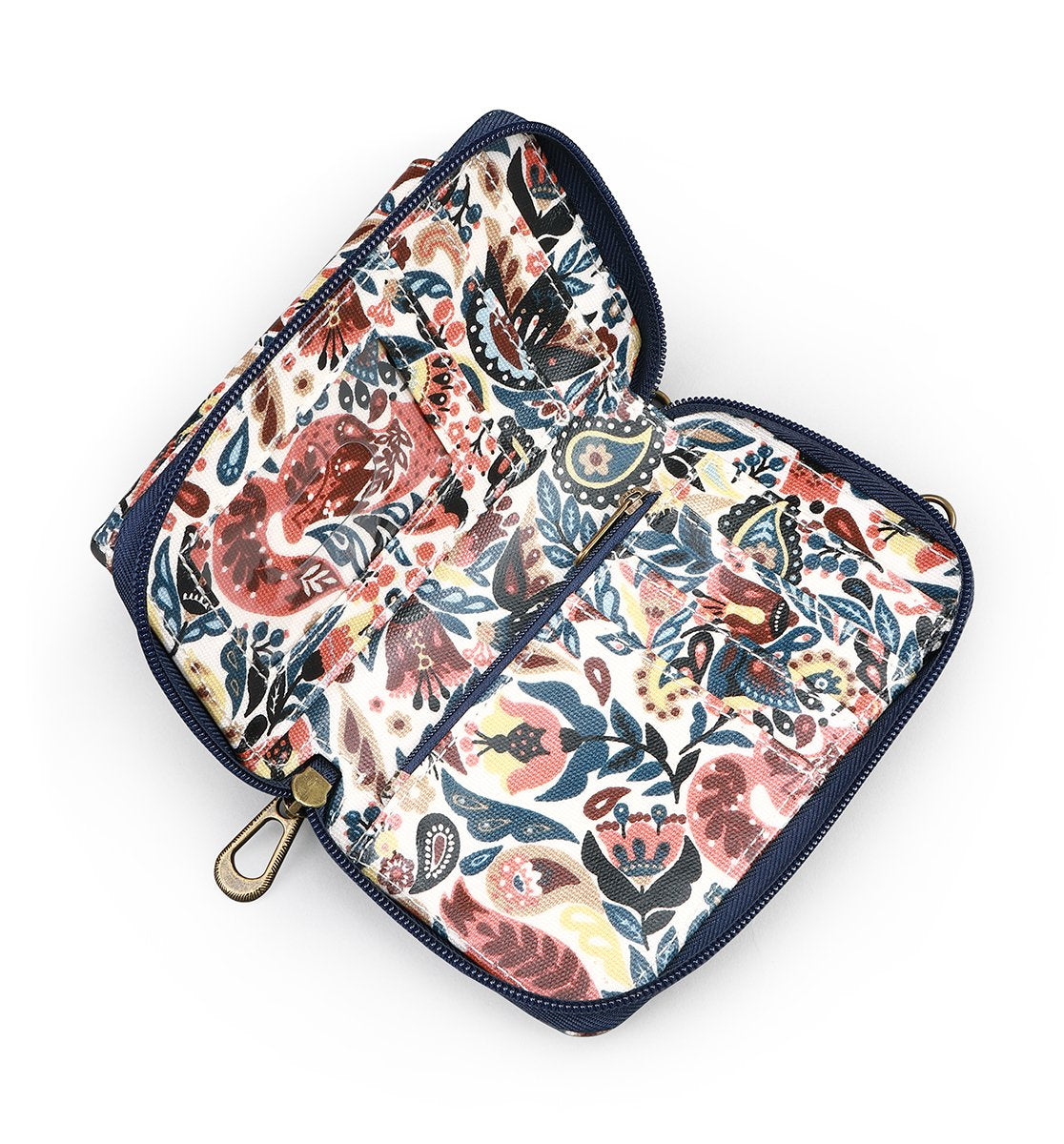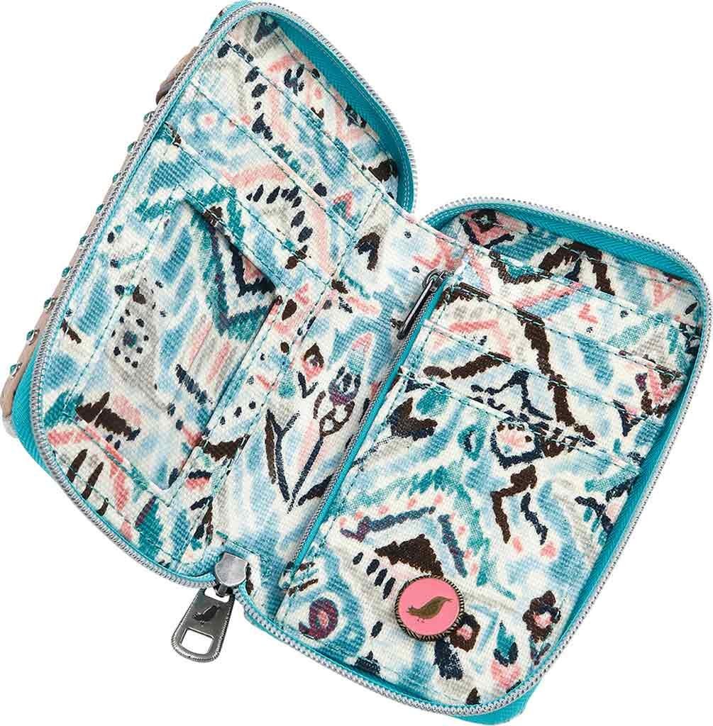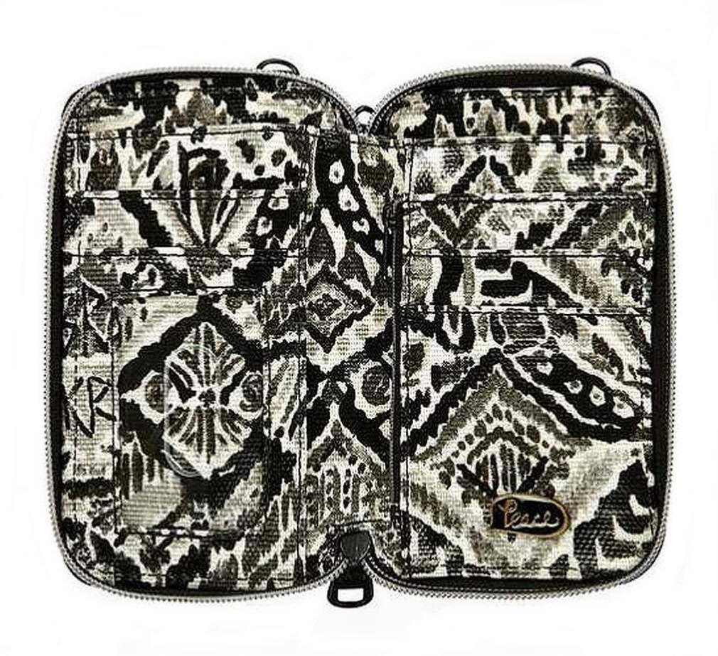 Sakroots Artist Circle Smartphone Wristlet is small and compact and perfect for touring around a new city. With a wristlet strap or crossbody strap you will always be hands-free and comfortable. Slip your phone inside the snap closure pocket while keeping cards and bills safely in a zippered pocket.