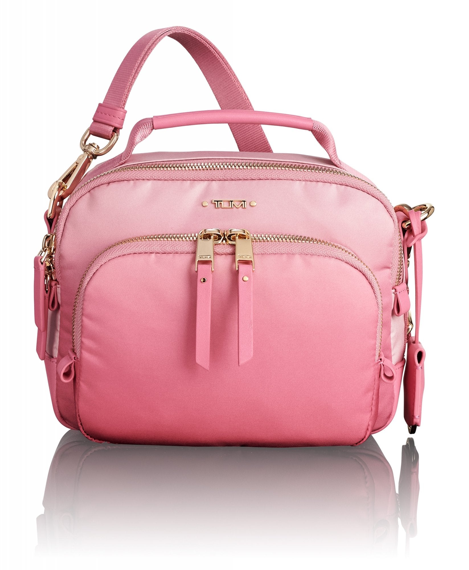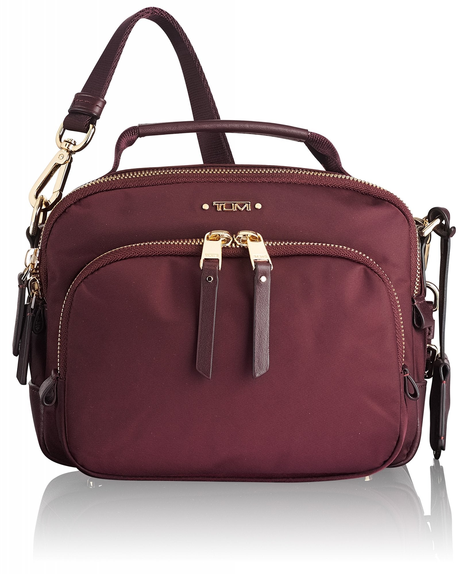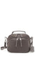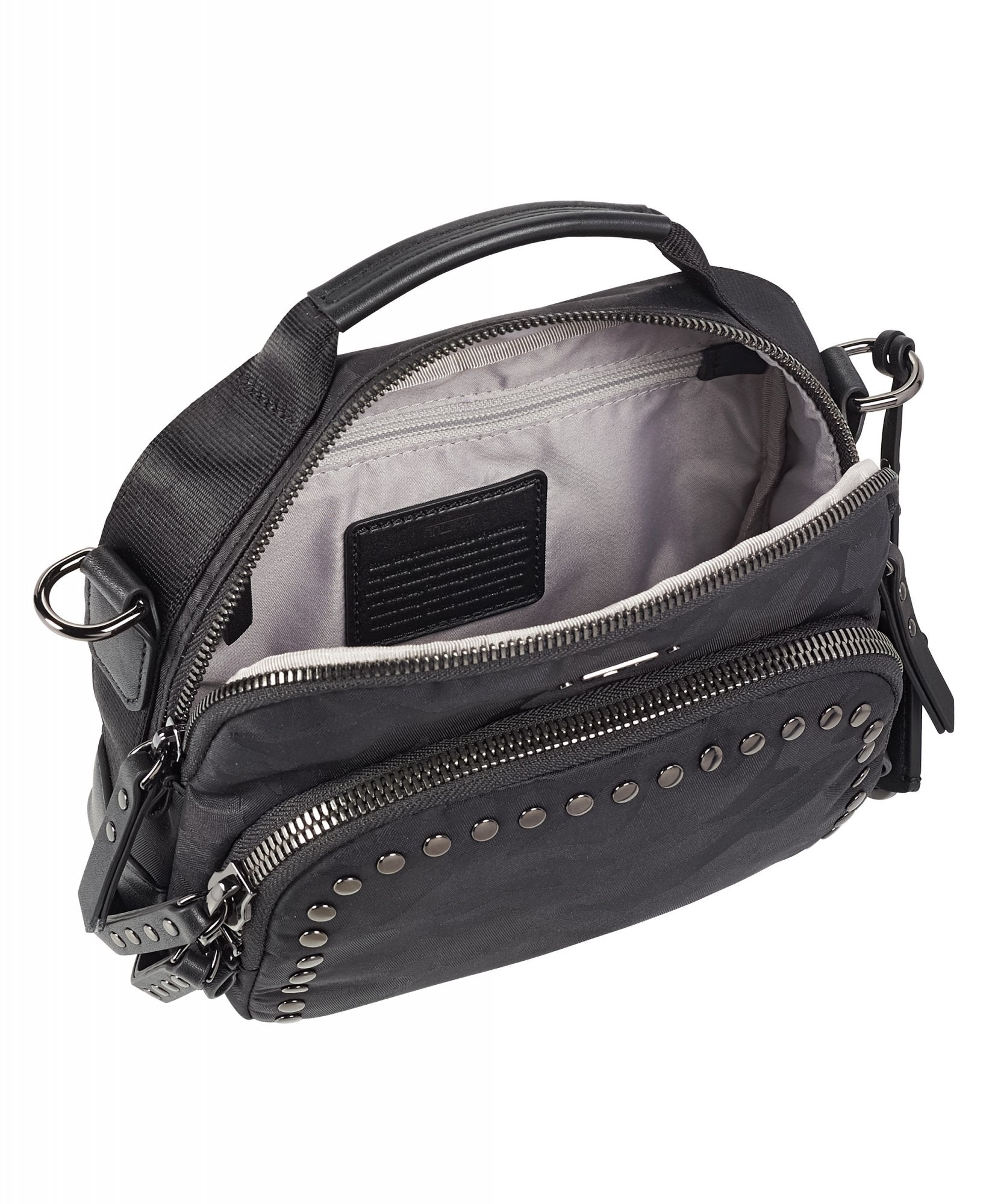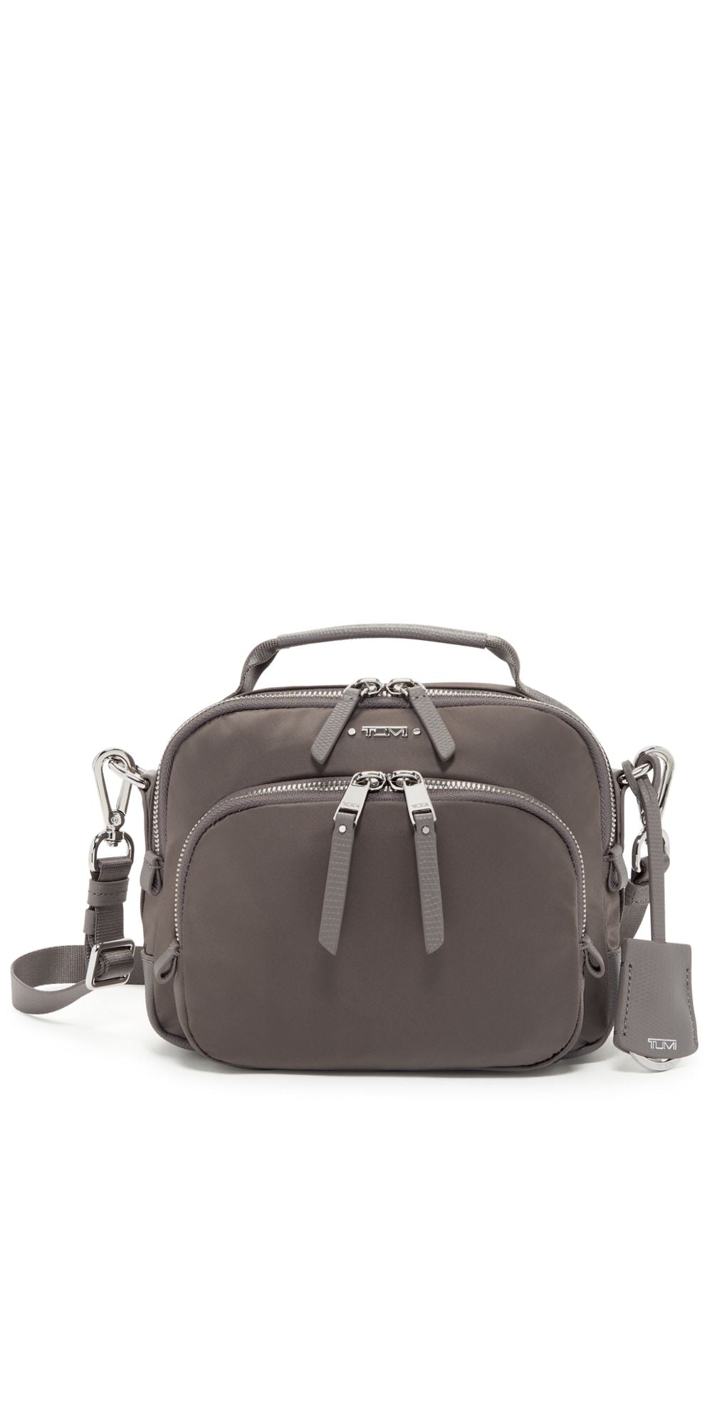 • Double-zip entry to main compartment, Double-zip entry to front U-zip pocket, Quick-access phone pocket with magnetic snap, Top handle, Removable adjustable crossbody strap, Monogrammable detachable leather dangler/key ring, Leather corners, 4 metal