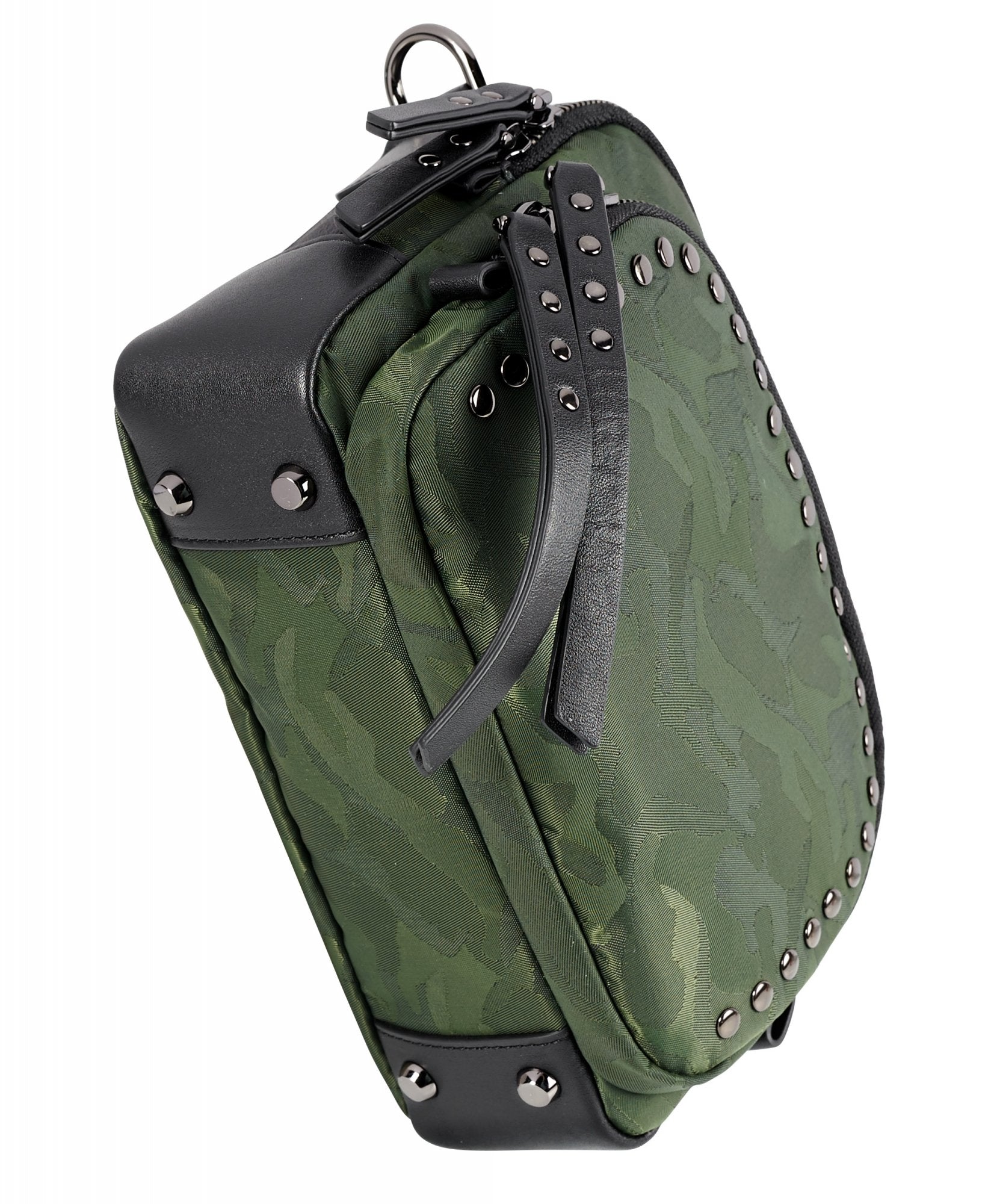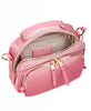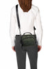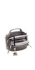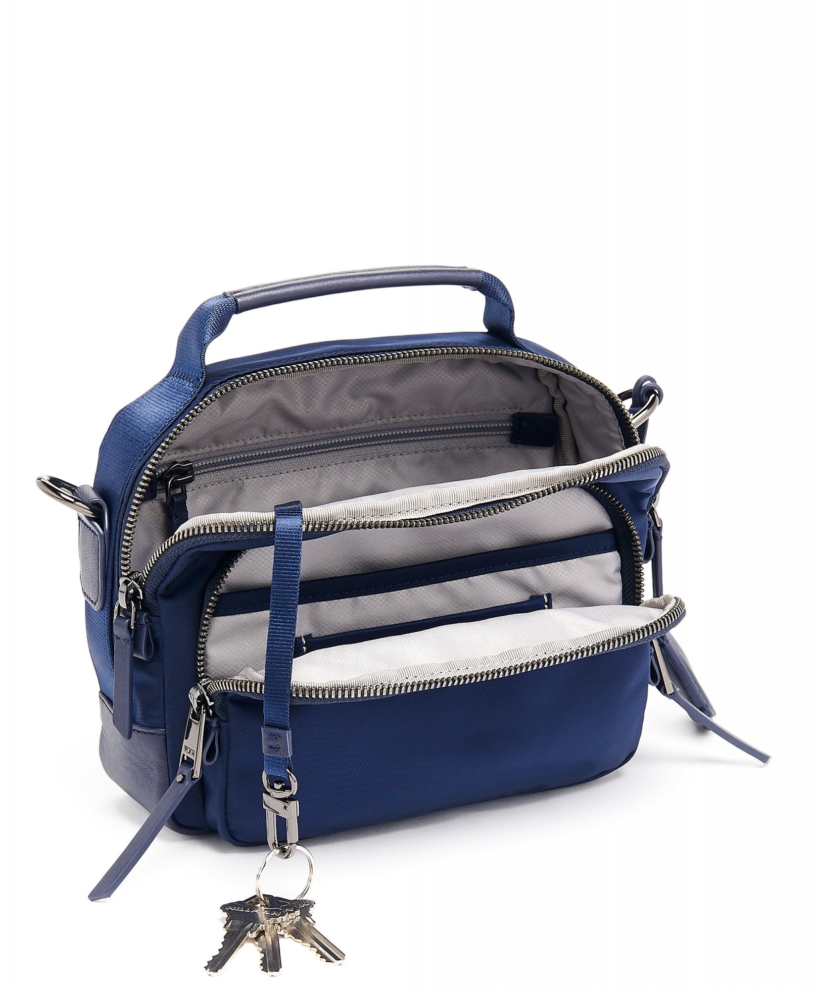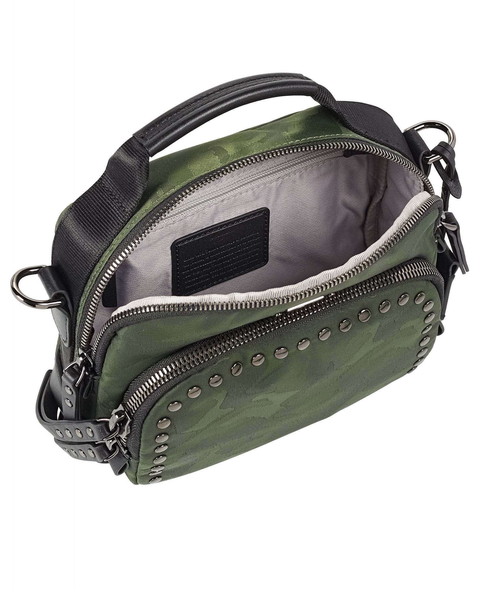 • Double-zip entry to main compartment, Double-zip entry to front U-zip pocket, Quick-access phone pocket with magnetic snap, Top handle, Removable adjustable crossbody strap, Monogrammable detachable leather dangler/key ring, Leather corners, 4 metal