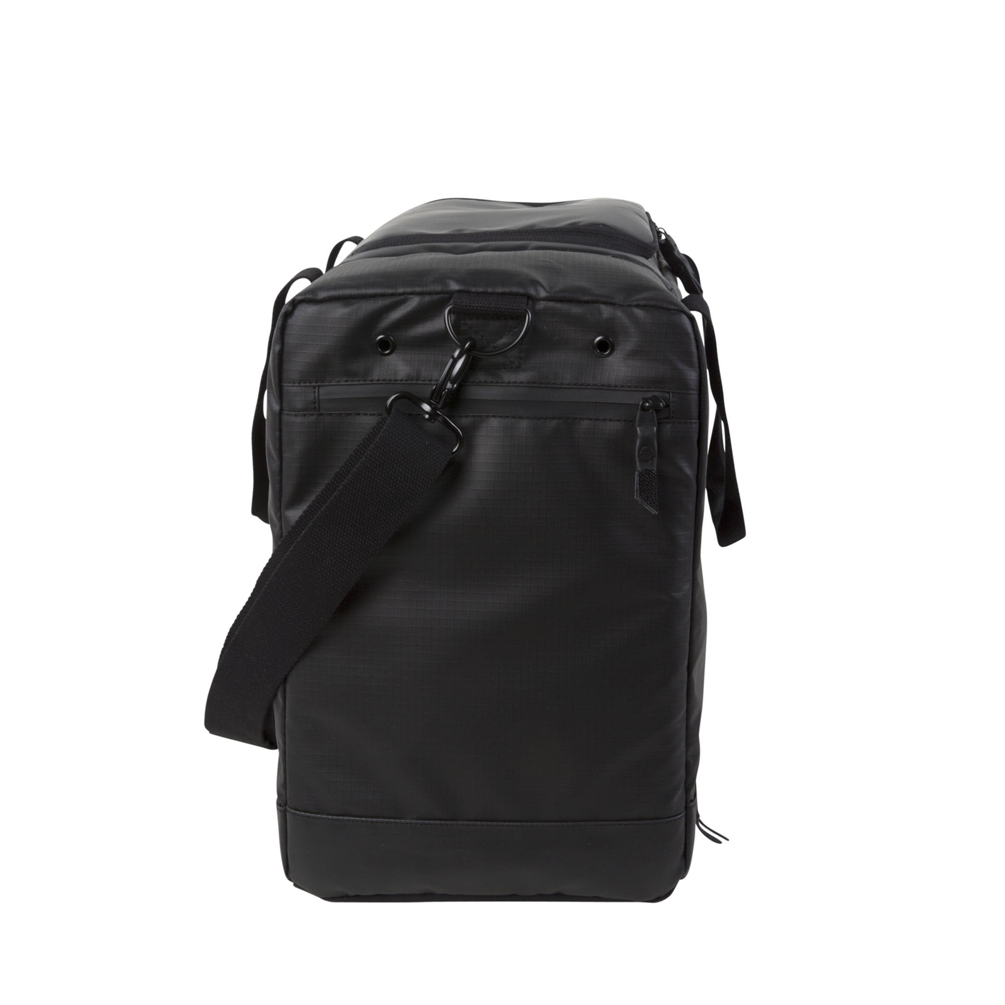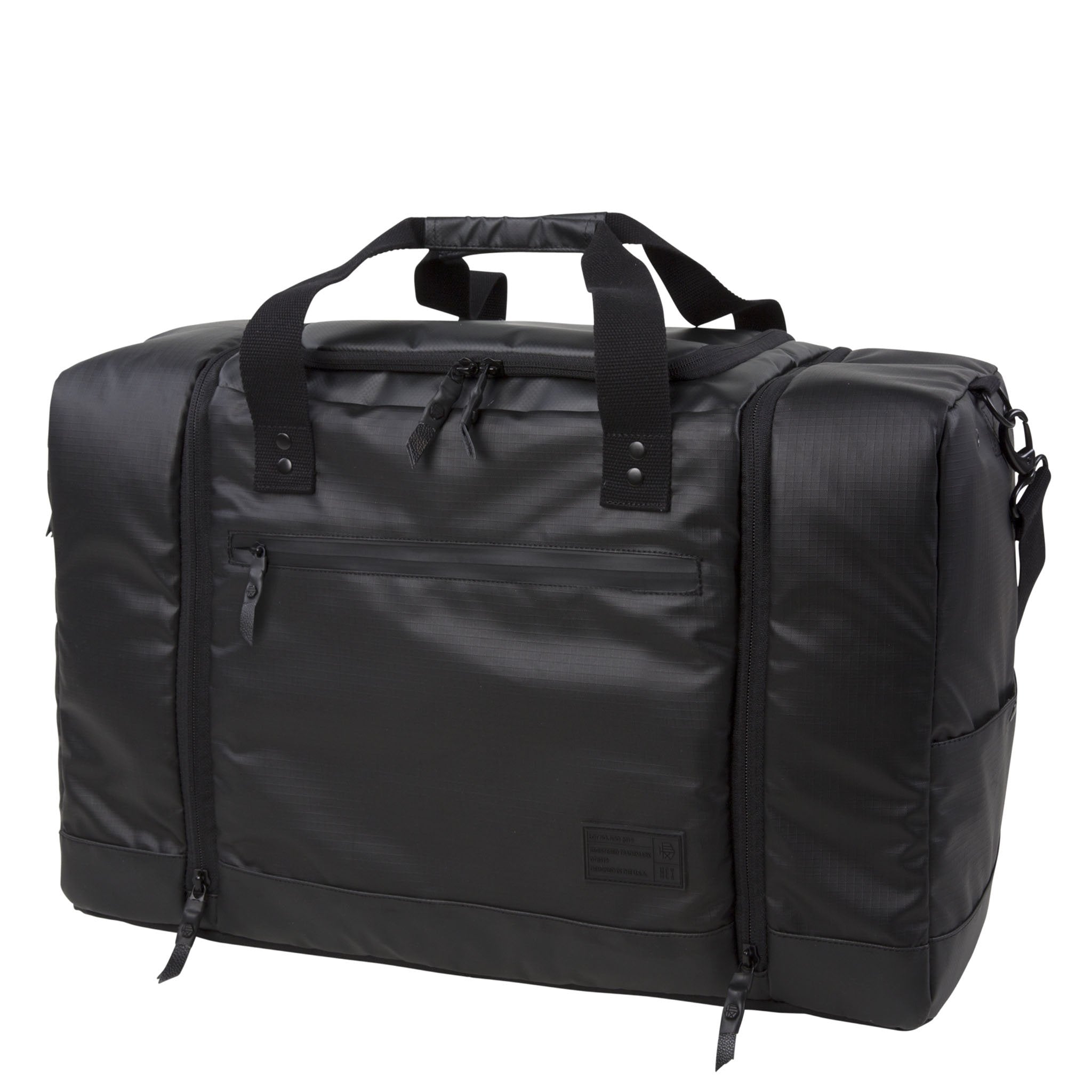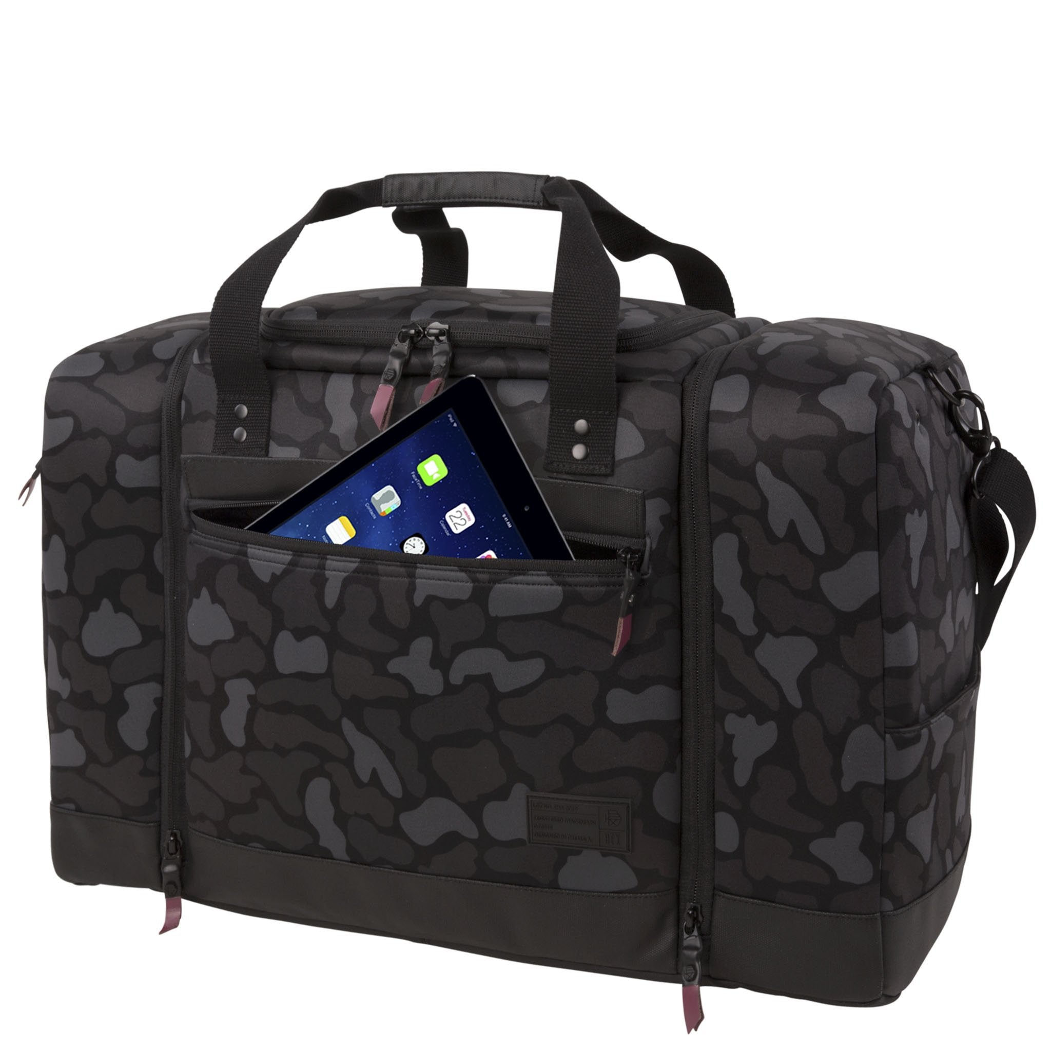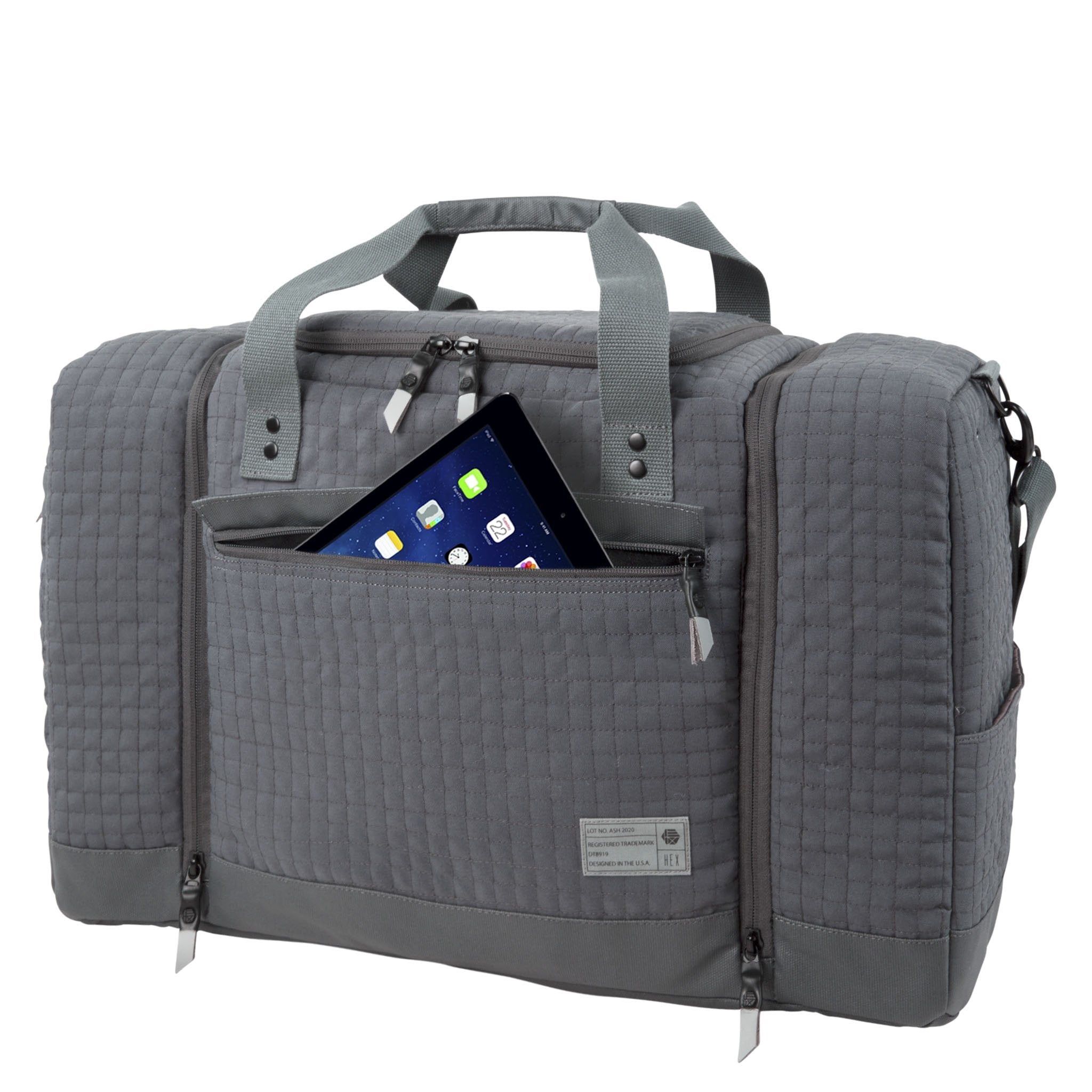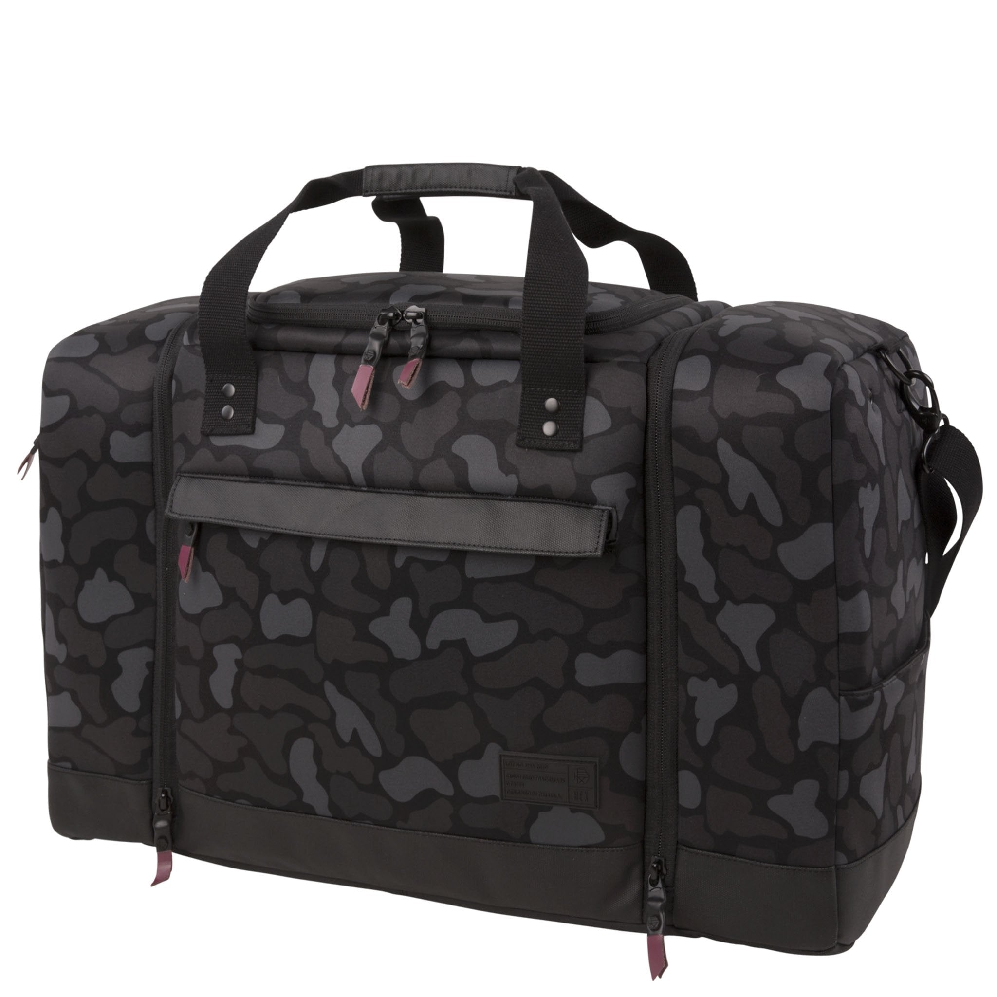 The Sneaker Duffel features a roomy center compartment for travel clothes and a padded and faux-fur-lined laptop pocket that will accommodate up to a 13" laptop. The front boasts a quick access, padded tablet or phone pocket. The two side ends of the bag house the innovative sneaker pockets. Each of these is separately lined and there is a polyurethane divider incorporated which reduces odor travel from the shoe pockets into the main clothing compartment. Mesh sock pockets are also designed into these sneaker compartments and ventilation is provided through eyelets as well. Like all HEX products, the sneaker duffel uses heavy, surplus grade web strapping for durability. The bag comes with a detachable shoulder strap as well as two additional zipper pockets, an ID pocket, genuine leather zipper pulls, and luggage-style feet, to keep the bag up off the pavement when sitting. Custom army green logo lining.