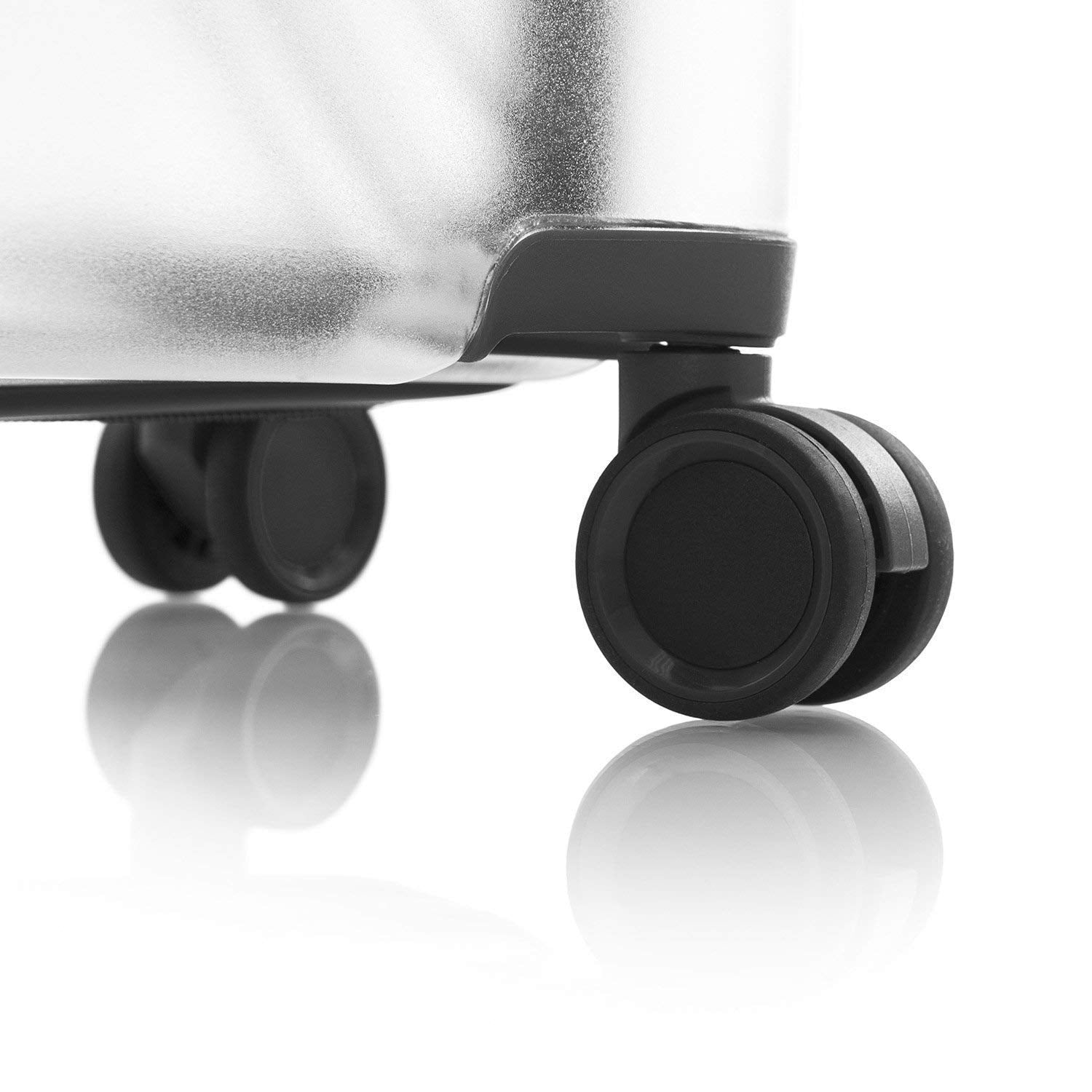 Clearly ahead of its time. the X-Ray will let you show off your personalstyle with its cool translucent design! Shell is made from lightweight, pure100% Polycarbonate with a unique translucent look Durable, colour-matchedinterior elastic compression straps with adjustable tension to keep all yourbelongings securely in place. Flush mounted built-in TSA combination lockProtective corner guards. Lightweight aluminum push-button telescopic handlesystem with multi-stage locking heights 360 dual spinner wheels allow foreffortless motion in different terrains WEIGHT 21" “ 5.8 lbs “ 2.6 kgDIMENSIONS (Including wheels) 21" x 15" x 9" - 53cm x 38cm x 22cm VOLUME 21" “39 L VOLUME/WEIGHT 21" “ 15 L/KG MATERIAL Translucent 100% PolycarbonateEXPANDABLE No TSA LOCK Yes, 21", 26" 30" WHEELS 360 Dual Spinner WheelsHANDLE Internal Handle System made from lightweight aluminum WARRANTY 5 YearPrestige Class Warranty