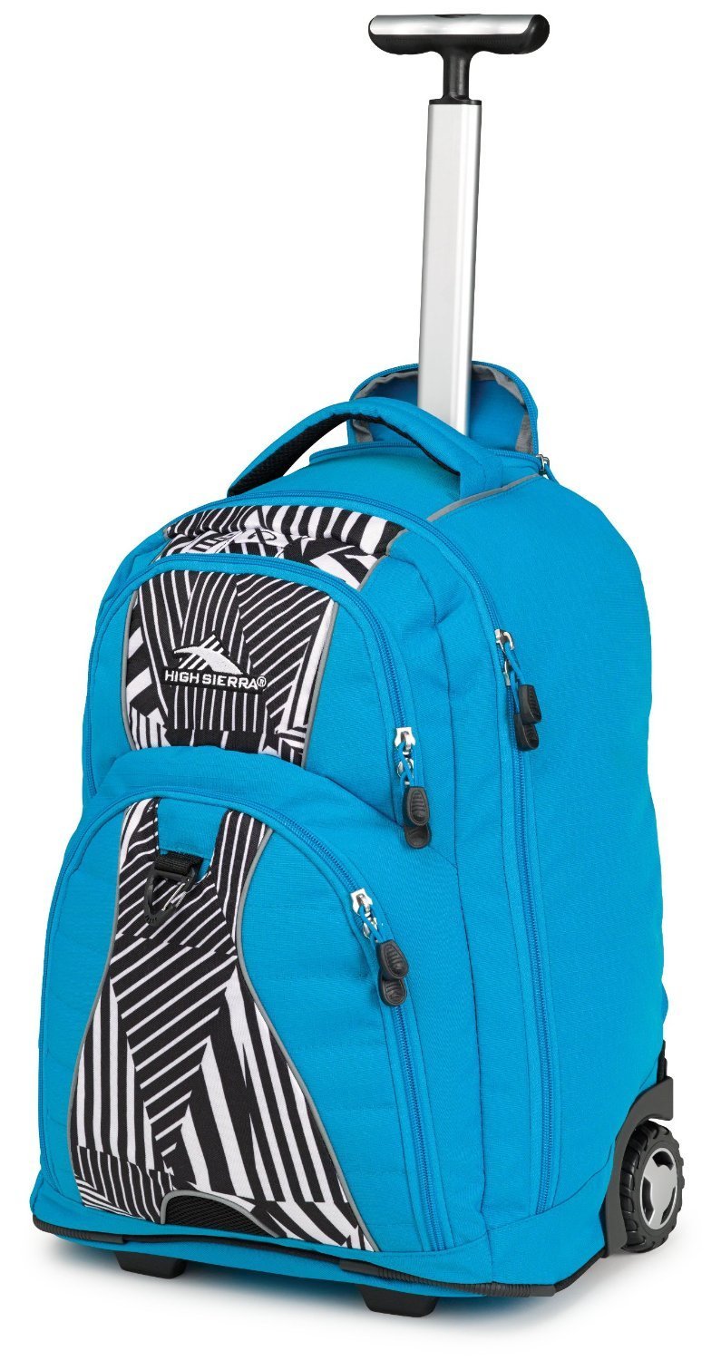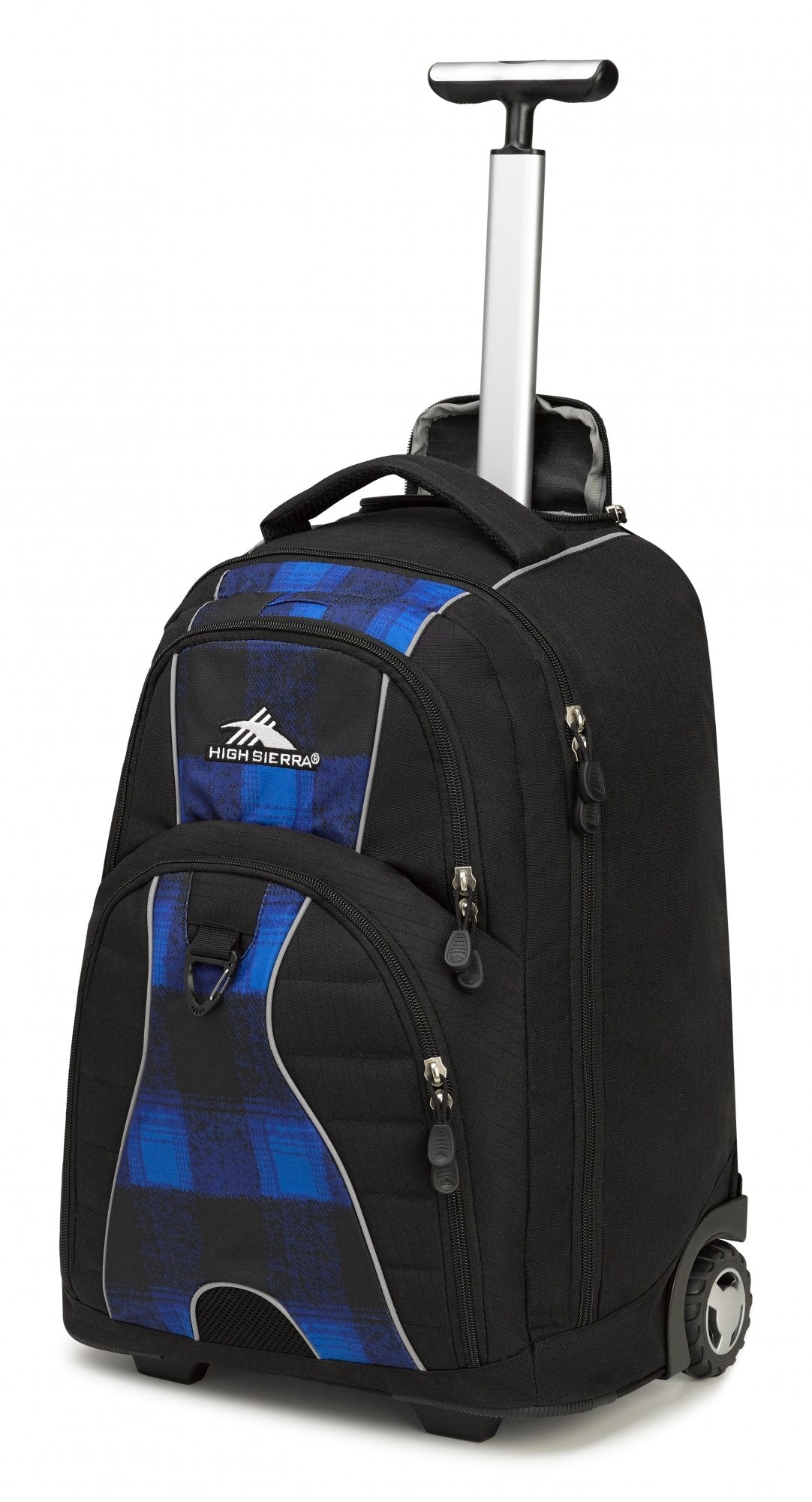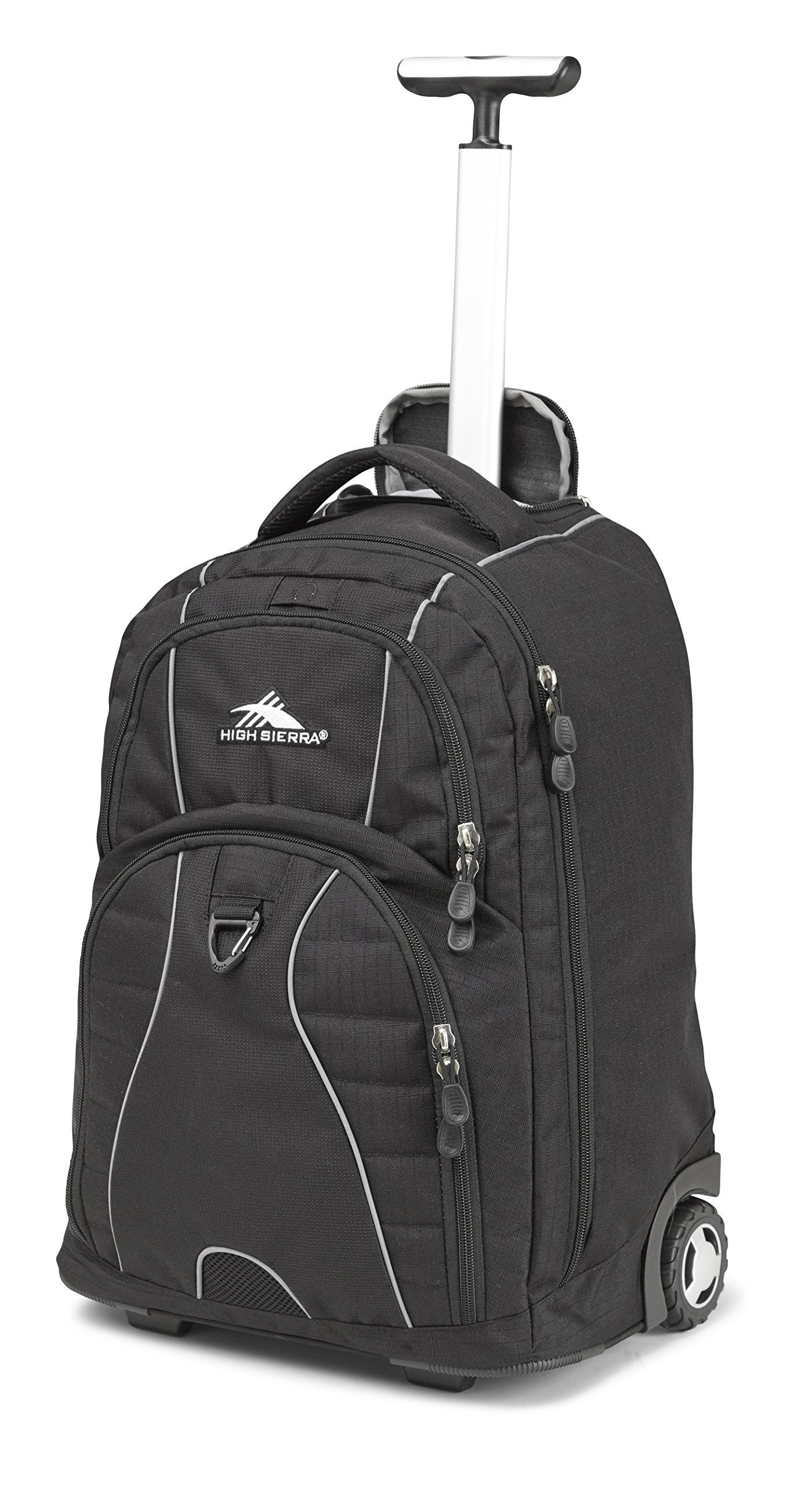 Have the freedom to take your backpack to school, work or travel with theFreewheel Wheeled Backpack from High Sierra. Laptop compartment accommodatesup to a 17" laptop Contoured, adjustable Vapel mesh padded shoulder strapstuck away inside the padded back panel when not in use. Single-tubetelescoping handle stows inside a protective zippered compartment and providesan effortless pull. Large, zippered front compartment features a media pocket,multiple open pockets, and key fob to keep your items neatly organized.Exterior also includes a zippered accessory compartment with headphone portand an open-top side pocket to hold bottled beverages or other gear. Zipperedmain compartment features a padded laptop sleeve and a roomy main interiorthat is fully lined. Smooth rolling, corner-mounted wheels with corner guardsand rub rails protect the bag from abrasion. Weight: 5.3 lbs. Dimensions:20.5" x 13.5" x 8". Measurements: Bottom Width: 13 in Depth: 8 12 in Height:18 12 in Strap Length: 37 in Strap Drop: 16 in Handle Length: 8 14 in HandleDrop: 1 14 in Weight: 5 lbs 5 oz This product may have a manufacturer'swarranty. Please visit the manufacturer's website or contact us at for full manufacturer warranty details.
