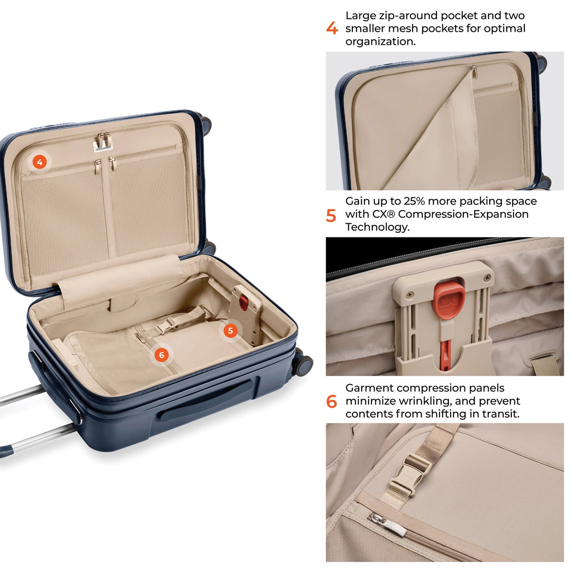 • World's only one-touch CX expansion increases packing capacity by 25% when you need more space. Simply press CX buttons and pull up sides to expand. Once ready, zip closed and push down to compress.