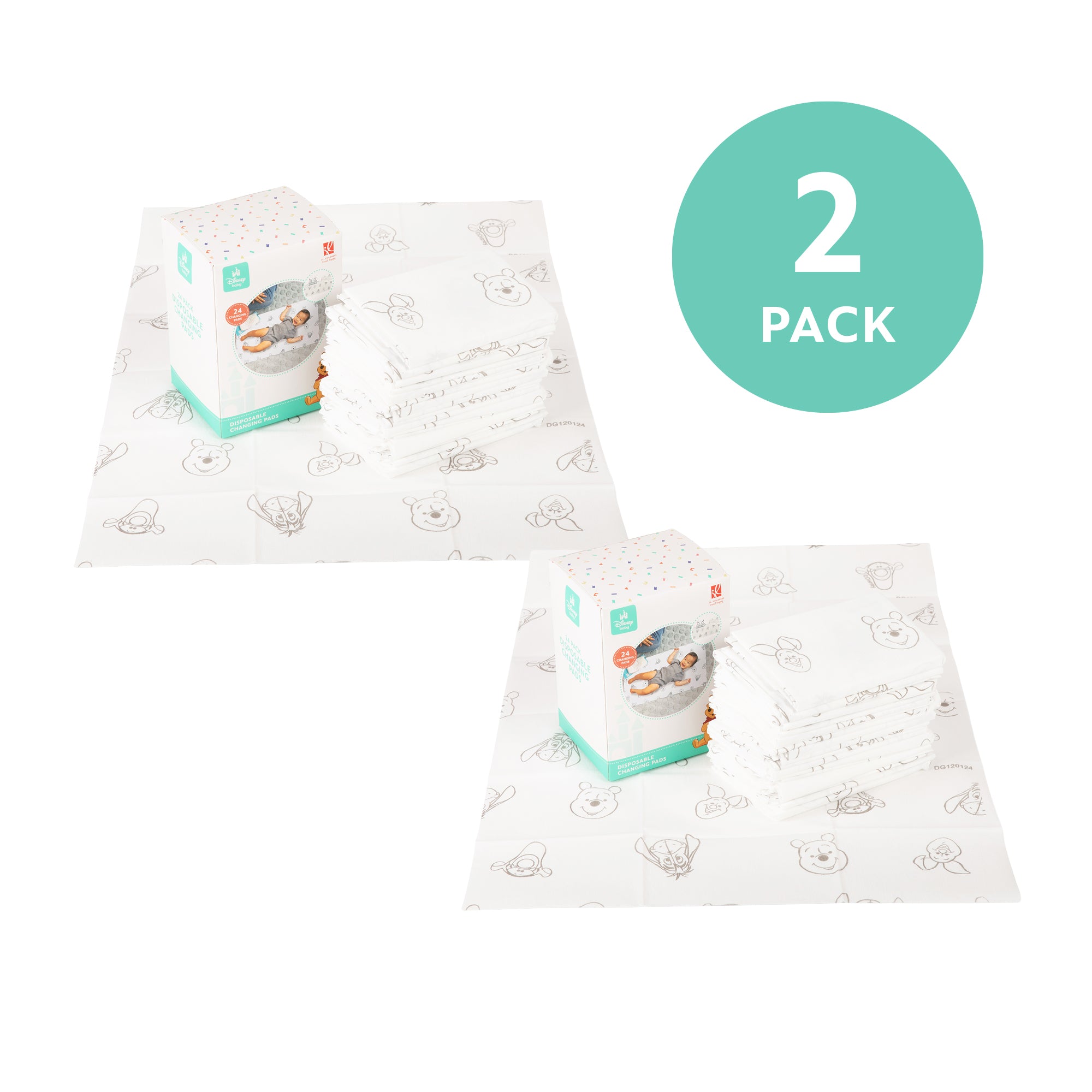 Disney Baby Disposable Changing Pads provide a clean and comfortable surface for diaper changes wherever you go! Pack includes 48 (2 boxes of 24) one-time-use changing pads in one adorable pattern of Winnie the Pooh and Friends. Two absorbent layers of each changing pad provide comfort for baby and a leak-resistant surface. Each changing pad measures 26 x 18 and is perfectly sized for both babies and toddlers. Discard after use we recommend recycling.