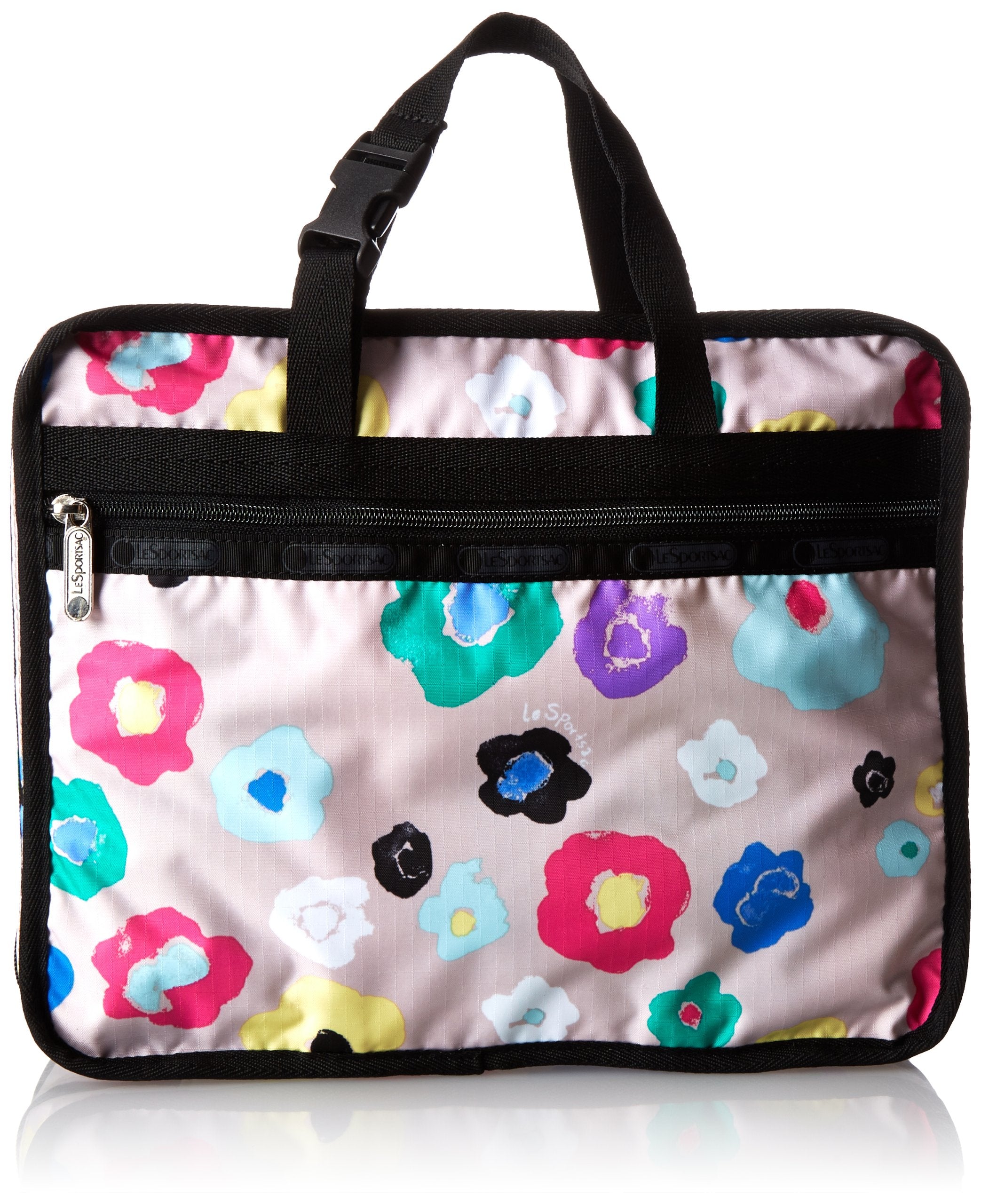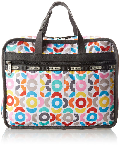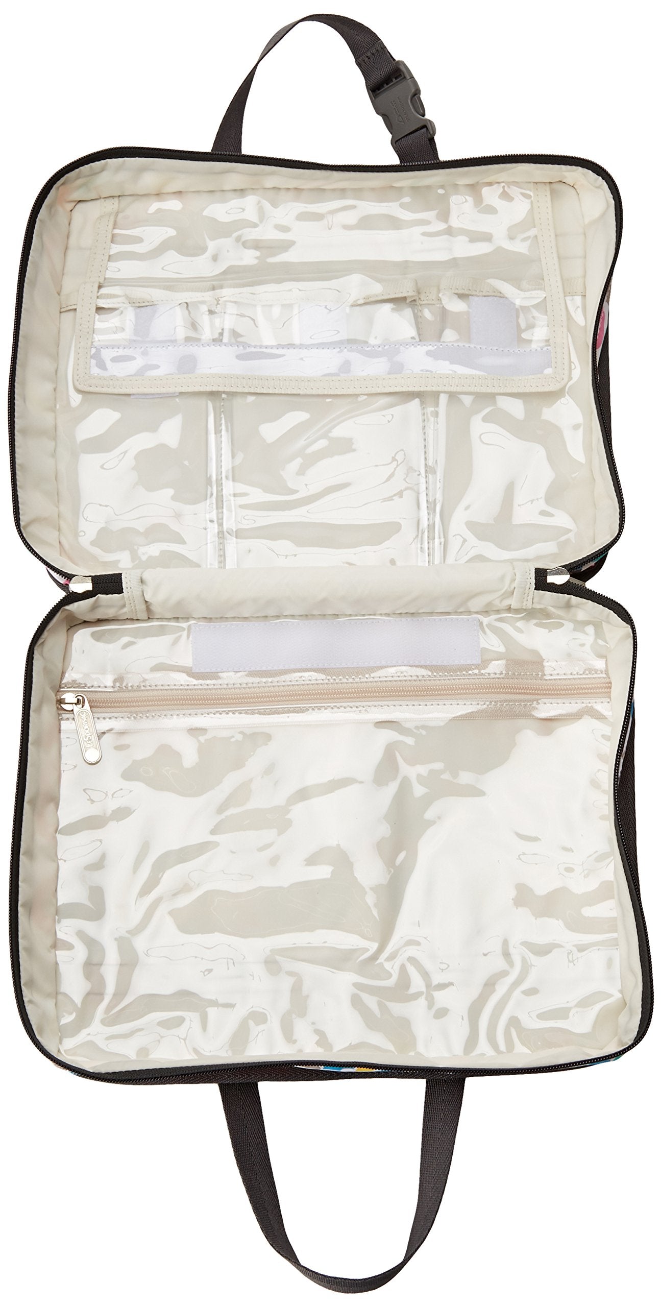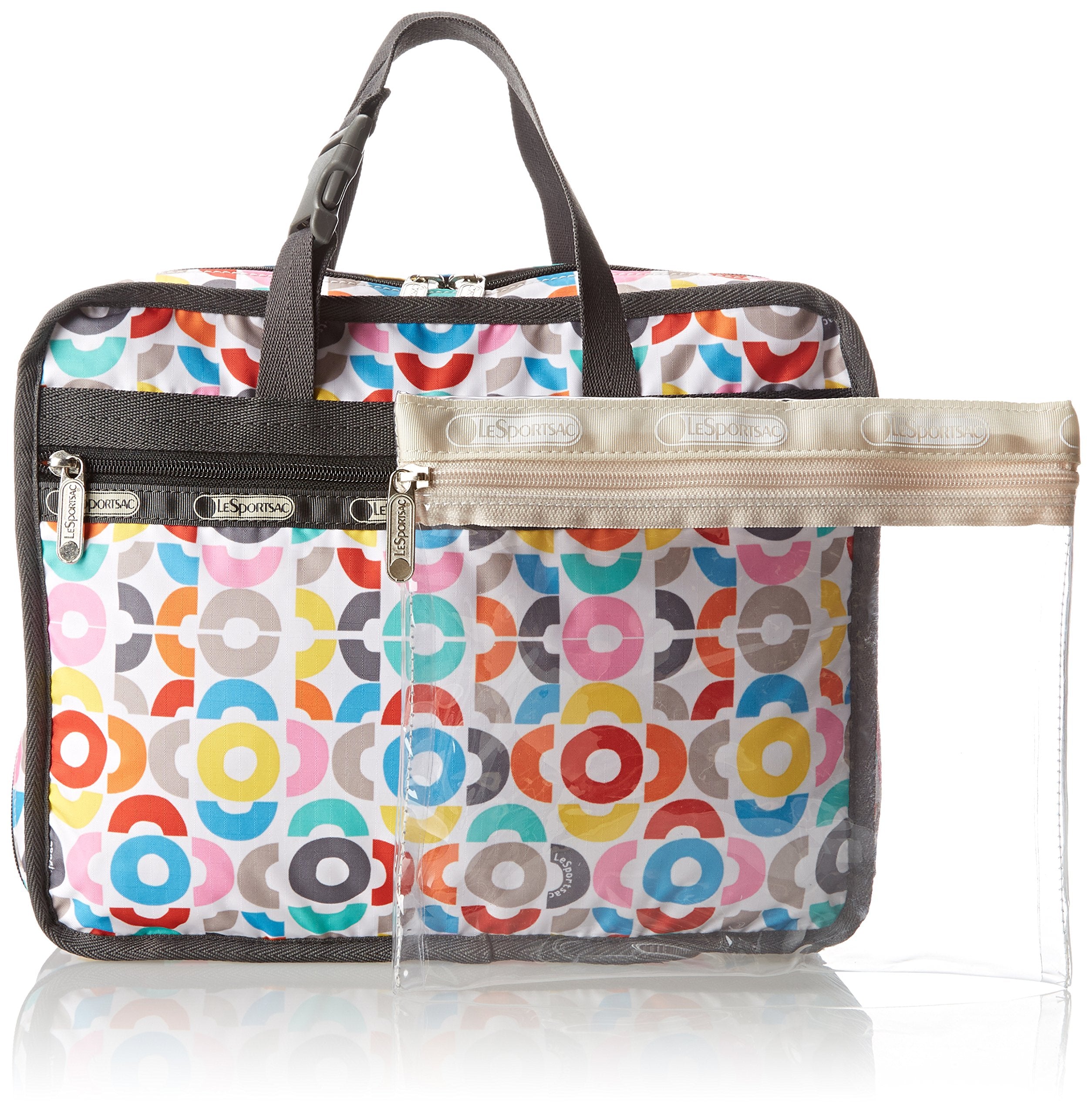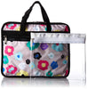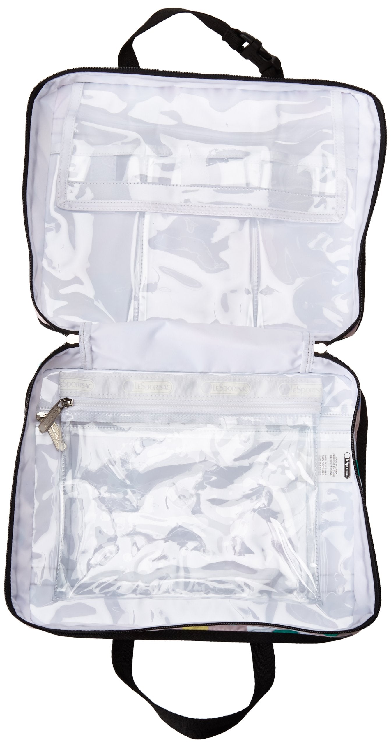 Zip around main closure with dual zipper pulls, Exterior front pocket with zip closure, Top handles with one quick release clip, Clear interior back pocket with zipper closure, Three clear interior front pockets with velcro flap closure, Detachable interior clear pouch with zip closure