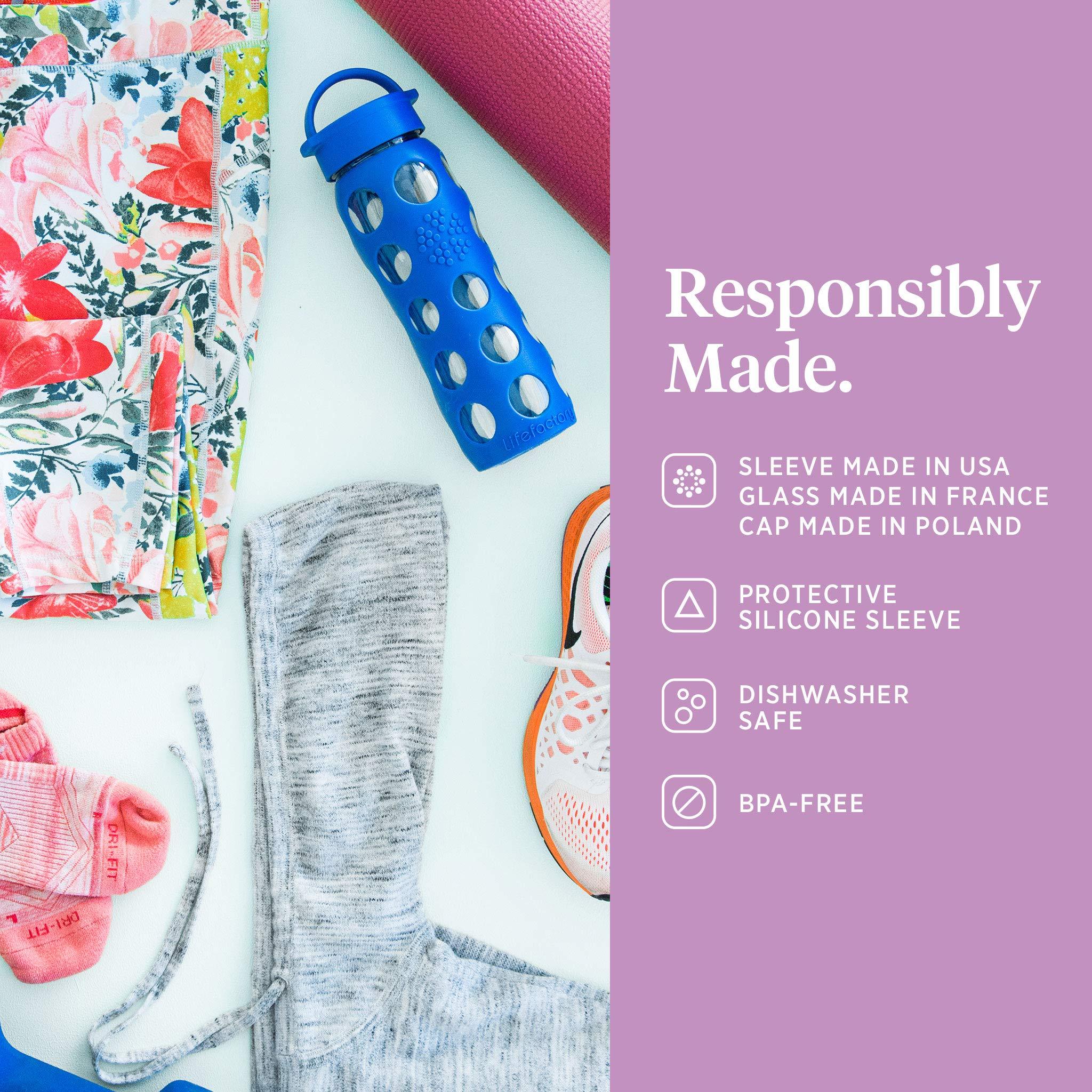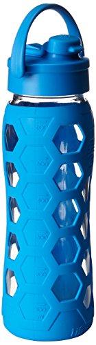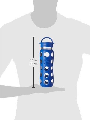 Lifefactory 22-ounce (650 ml) reusable glass water bottles offer a large capacity to quench a big thirst while providing an excellent alternative to disposable plastic bottles. These innovative bottles feature durable glass construction that offers pure taste. The bottle’s glass is surrounded in a patented silicone sleeve that both protects against breakage and provides a comfortable, non-slip surface. The bottle also features a wide-mouth opening making it easy to fill with ice cubes, pieces of fruit, or drink mixes and powders. Meanwhile, the bottle’s Flip Cap is perfect for use on the go. The medical grade, silicone flip top opens up and offers a controlled flow. The flip top seals when plugged but is not leakproof, so please keep this bottle upright! The Flip Cap has a handy pivoting handle that makes it easy to carry the bottle and that stows out of the way while drinking. For easy care, the silicone sleeve and bottle can be washed together. All components of the bottle are dishwasher safe. It is recommended to wash the cap on the top rack. The cap is constructed of BPA/BPS-free polypropylene (PP#5) with no phthalates, PVC, or polycarbonates. The flip top is made of durable BPA/BPS-free silicone. All Lifefactory components are made in the USA or Europe and all products are assembled in the USA.