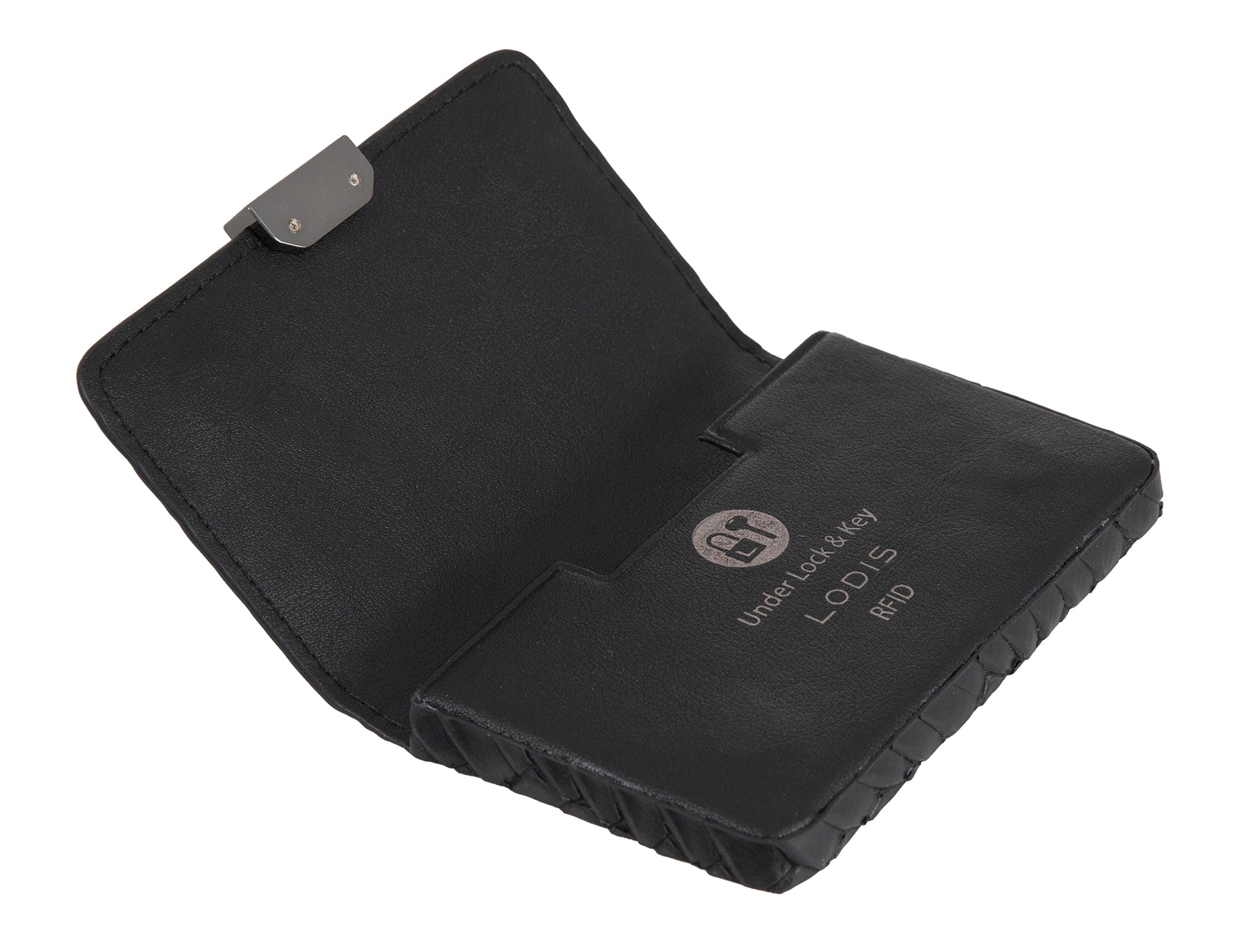 Textural and playful, the Nova collection by Lodis offers a fresh mix of classic tailoring and a not-so-classic woven embossed Italian rubberized leather. It features gunmetal jewelry-grade hardware, and Lodis Under Lock and Key (trademark pending) RFID protection. Chic business card case holds up to 30 business cards - for the businesswoman with the heart of a fashionista. Features: Magnetic closure, Holds up to 30 business cards or 12 credit cards One year warranty against manufacturing defects.