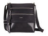 Top zip medium sized crossbody with three front zip pockets, adjustable crossbody strap, interior cell phone and zip pockets.