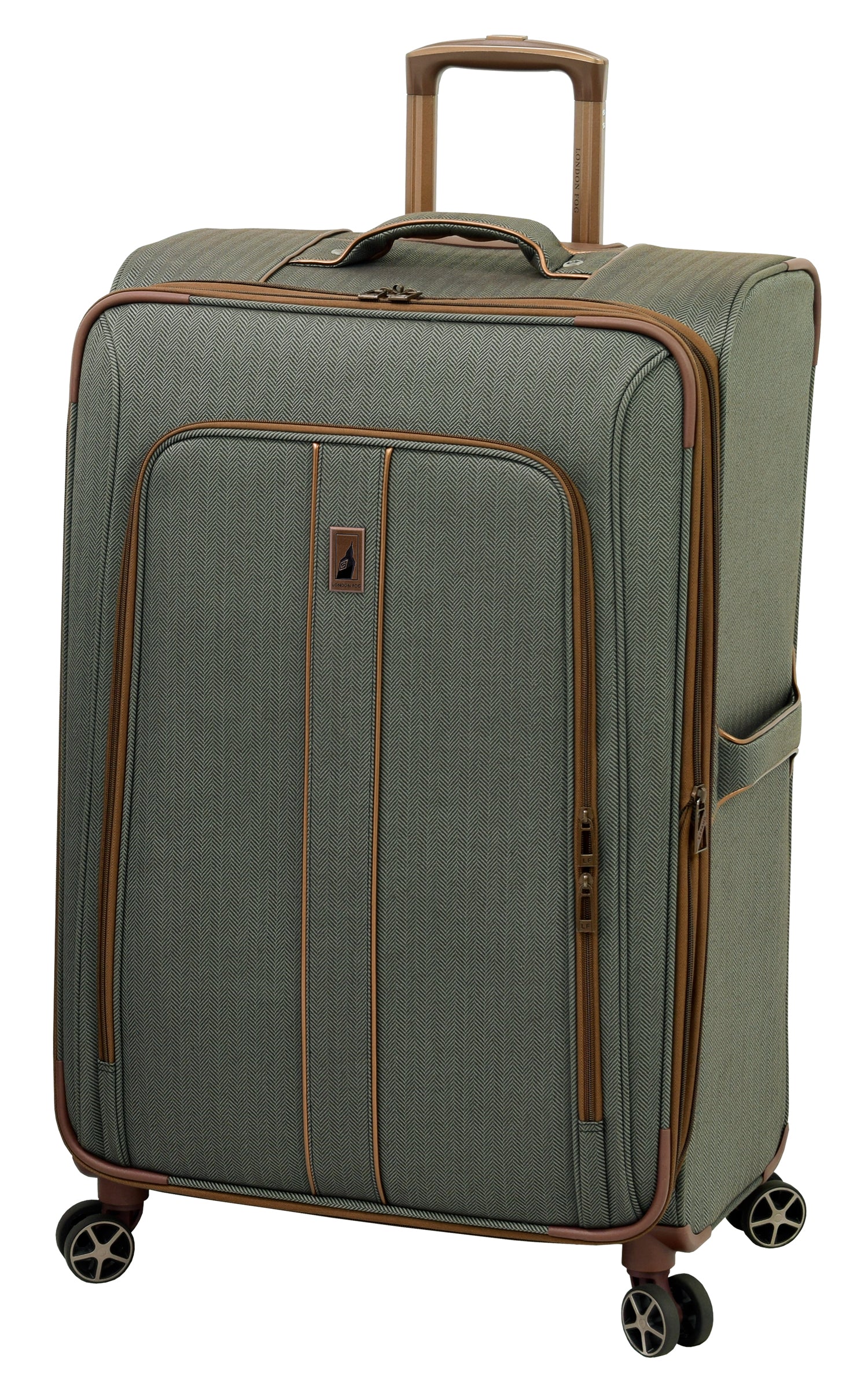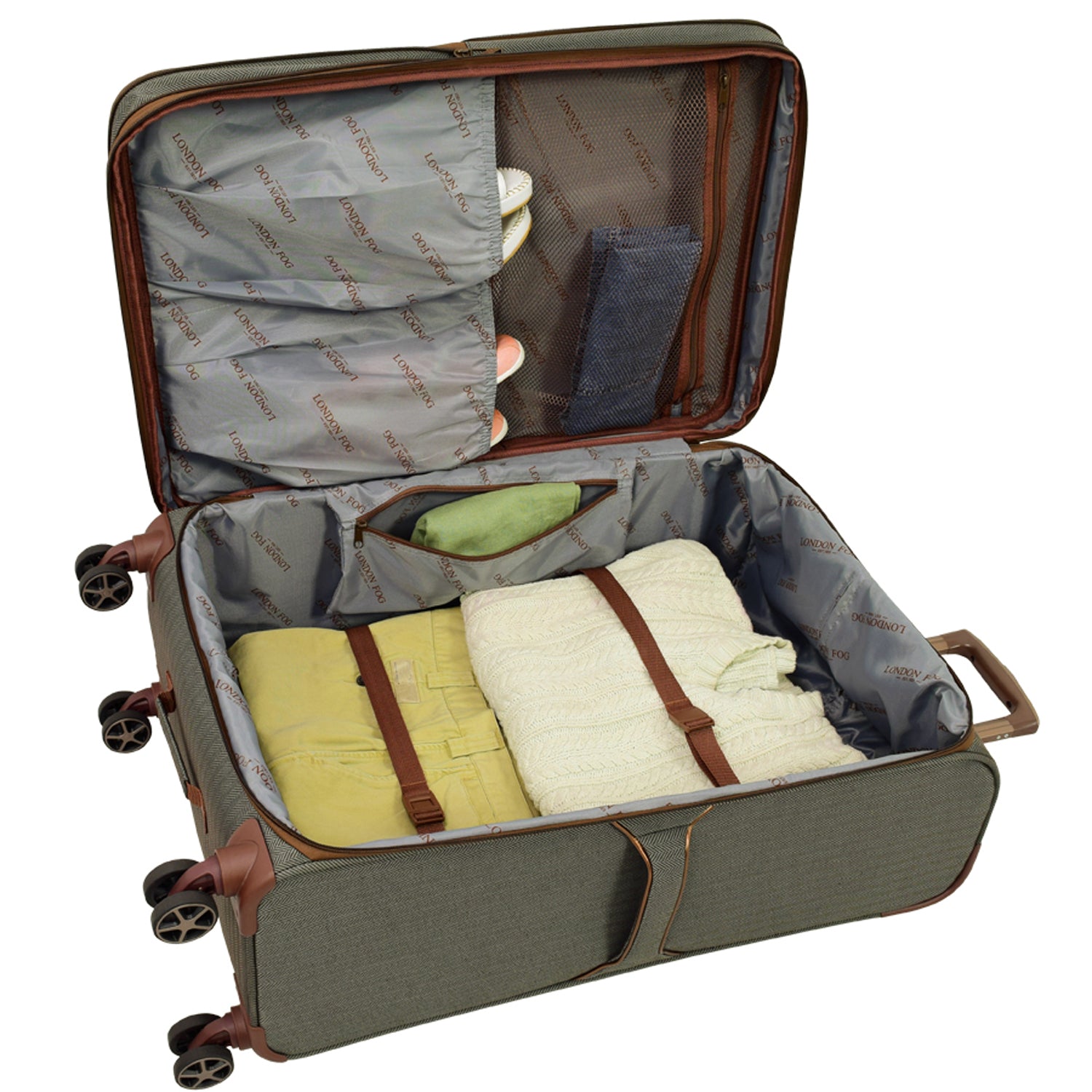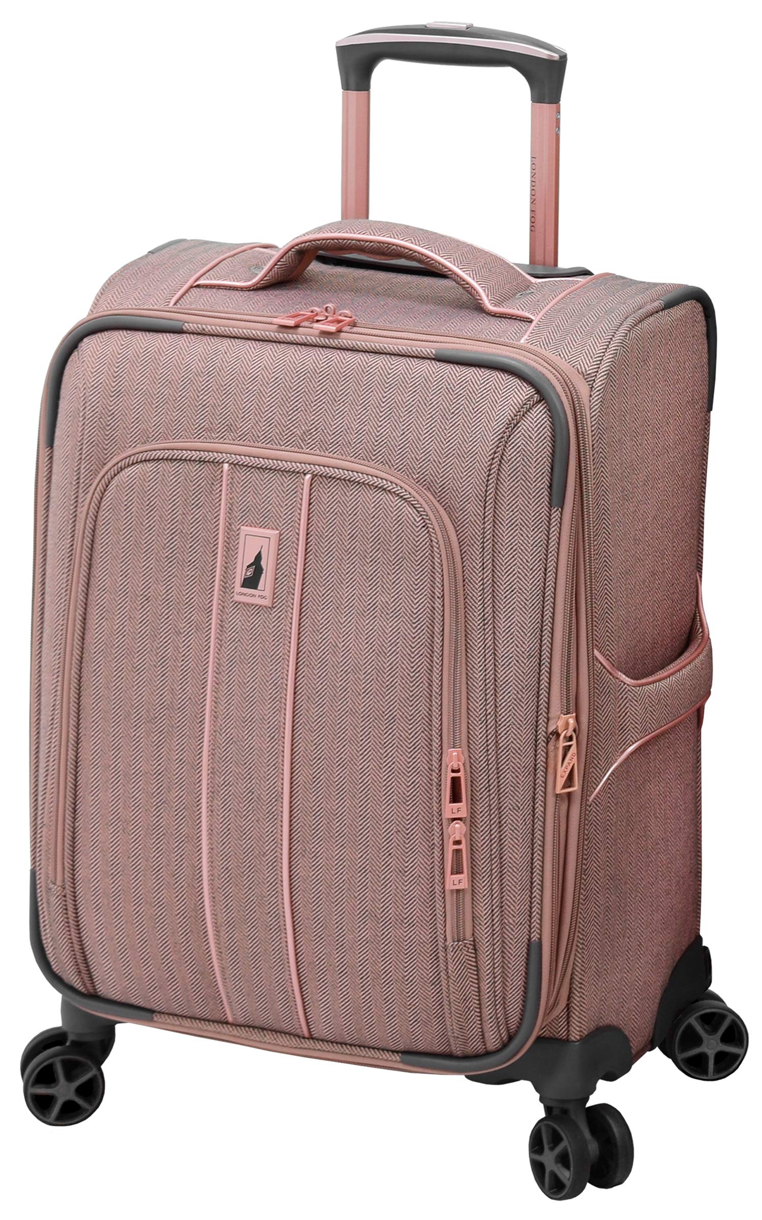 • Aluminum locking push button handle system with channels for added strength. 8-Low profile 360 multi-directional wheels. Full color contrasting London Fog signature lining.