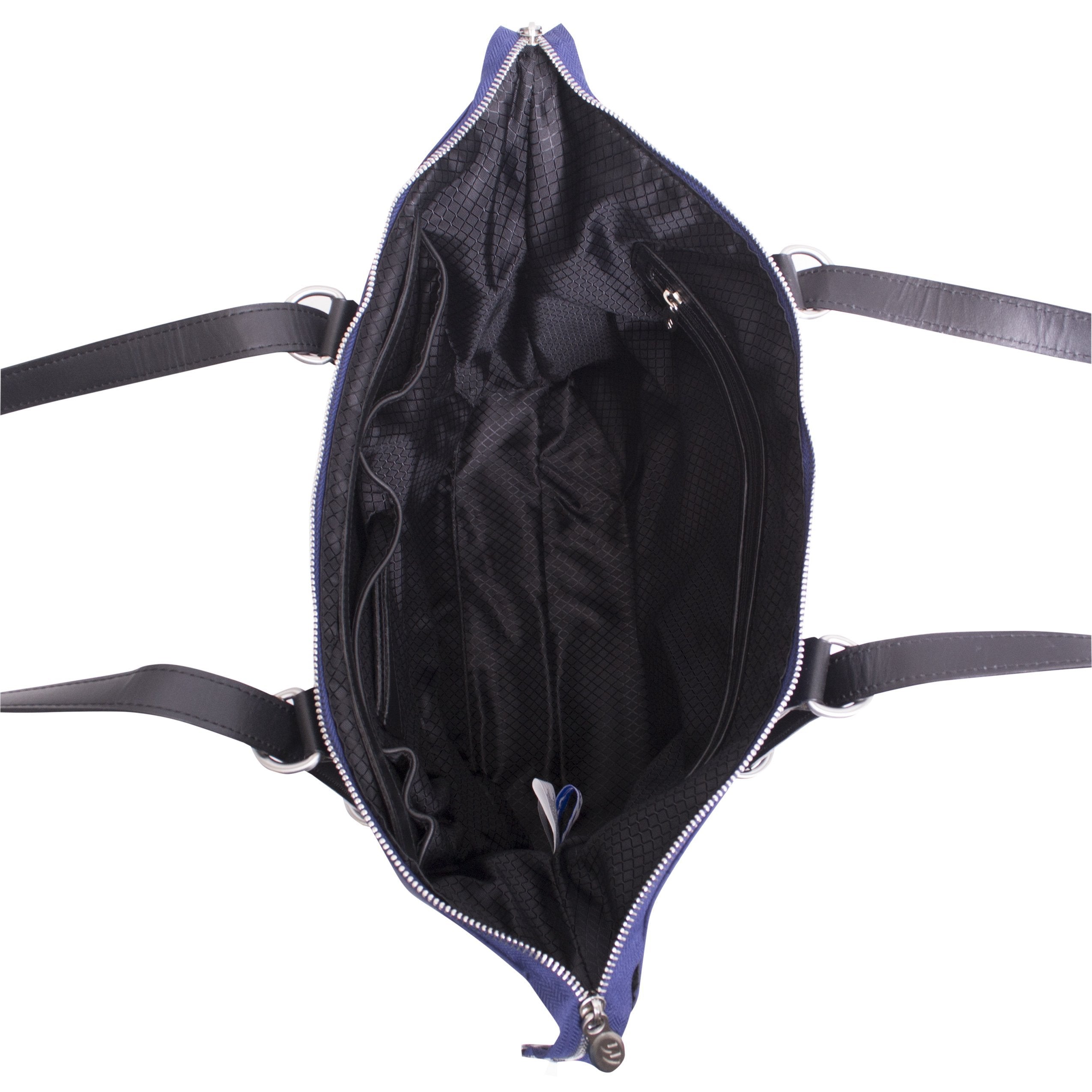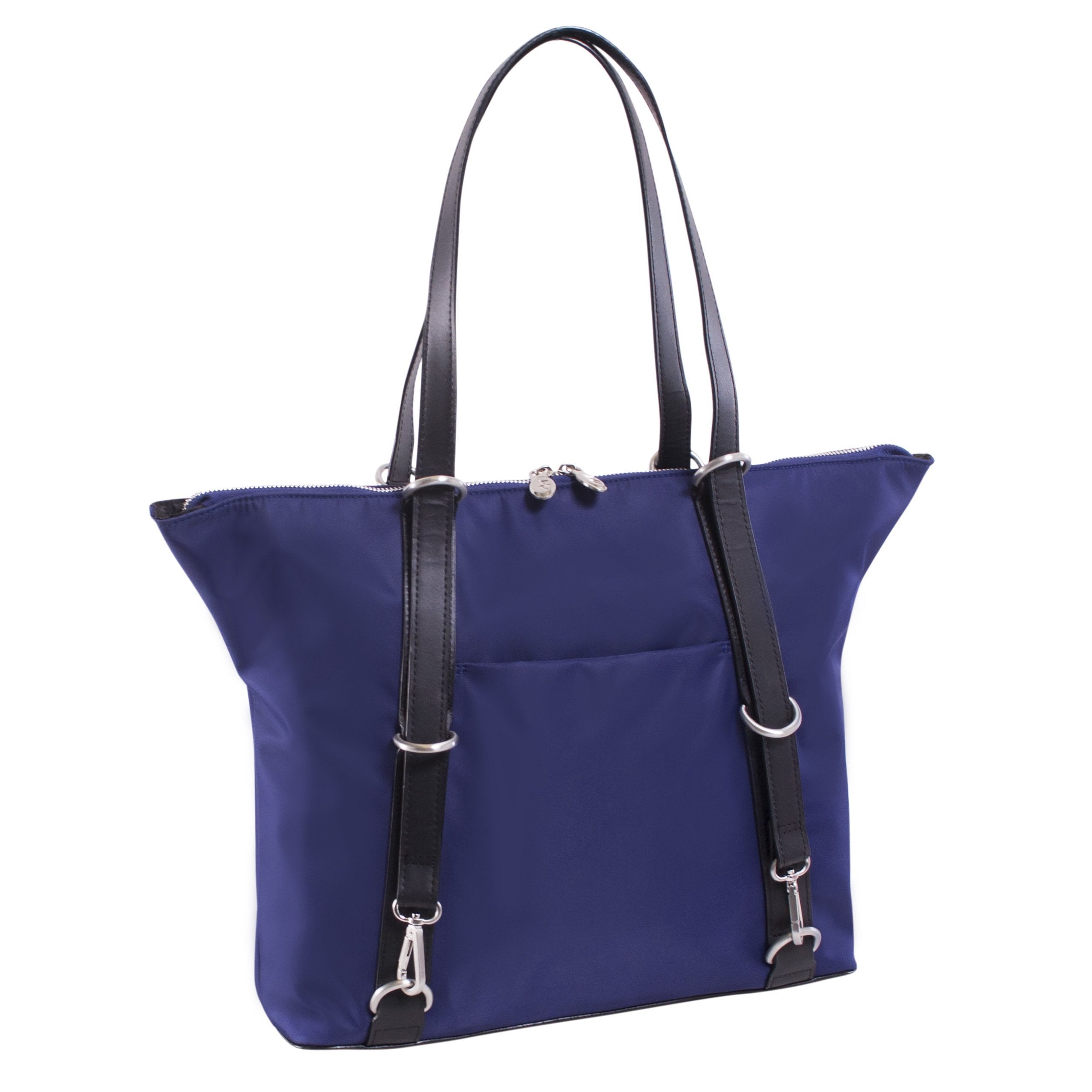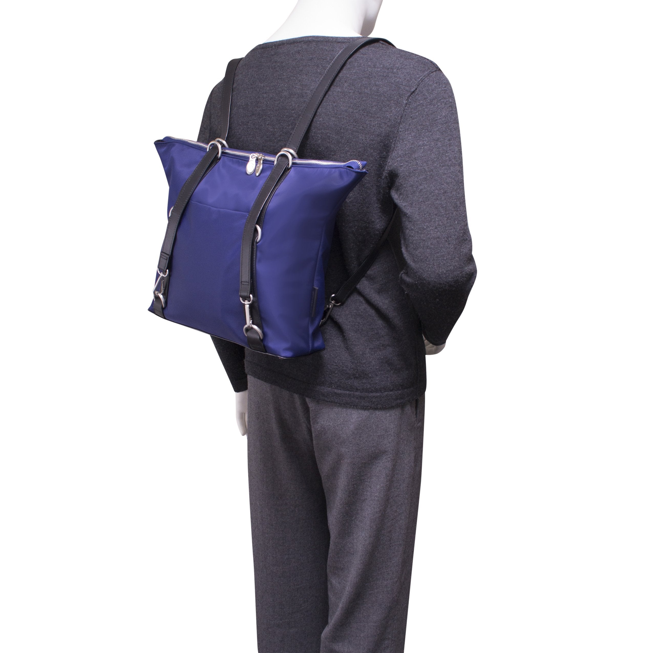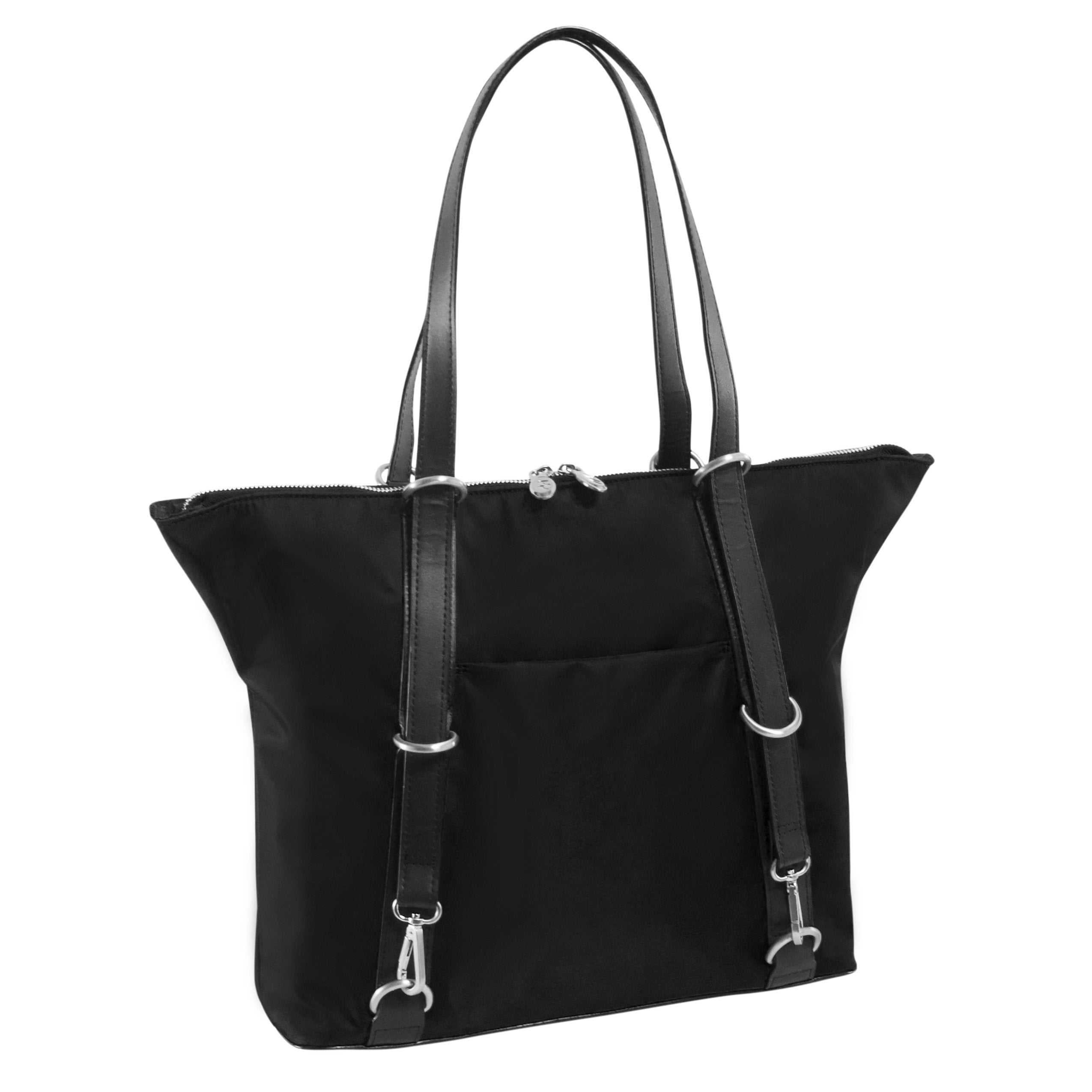 3-In-1 Convertible nylon backpack tote with leather accents. Fully-lined interior with leather accents with secure interior full-length zipper pocket. Easy access front slip pocket with magnetic closure. Main compartment features a padded tablet pocket with organizer for business cards, pens, and small accessories. Silver accent hardware and metal zippers. Protective metal feet on the base. Leather straps converts the bag into a tote, backpack, or crossbody.