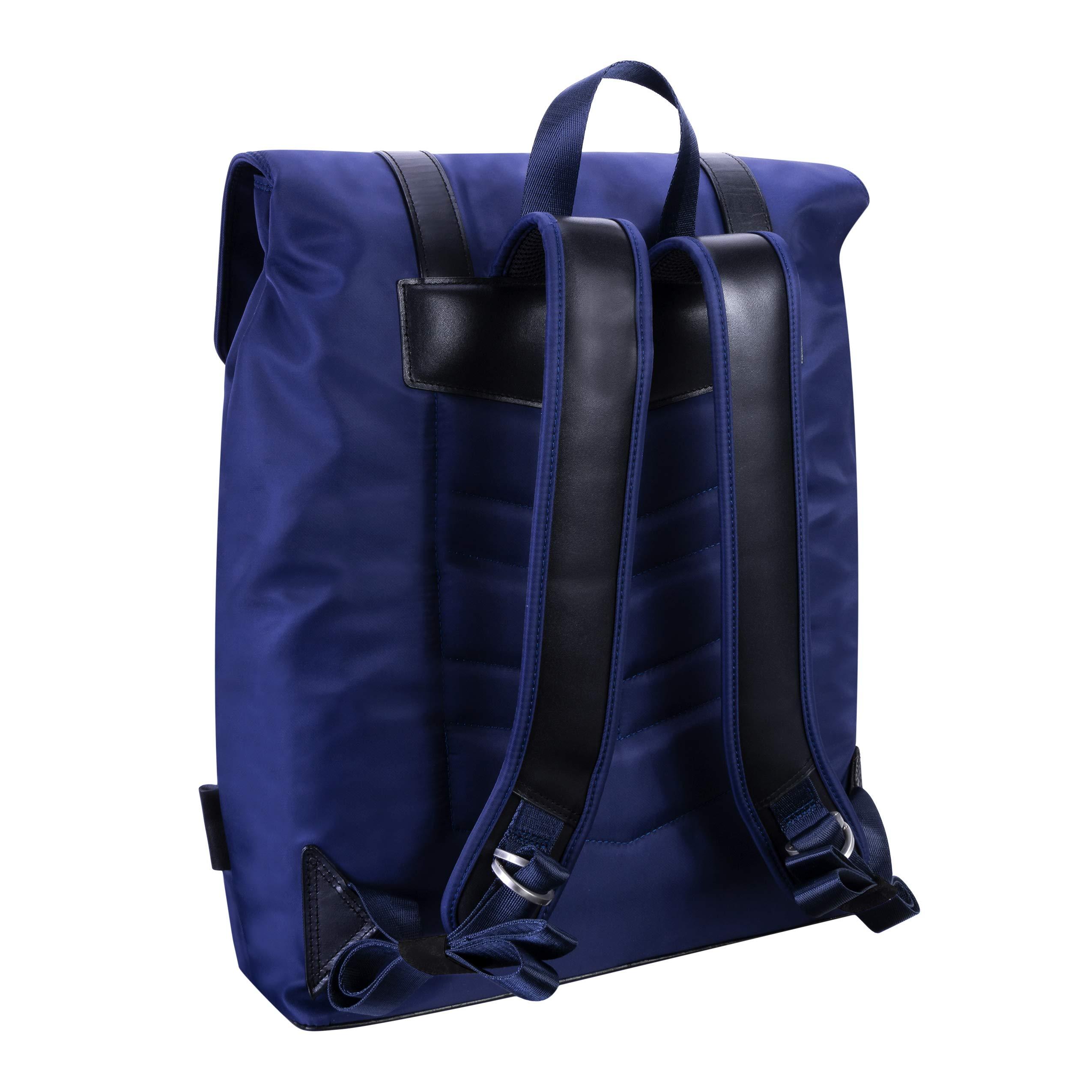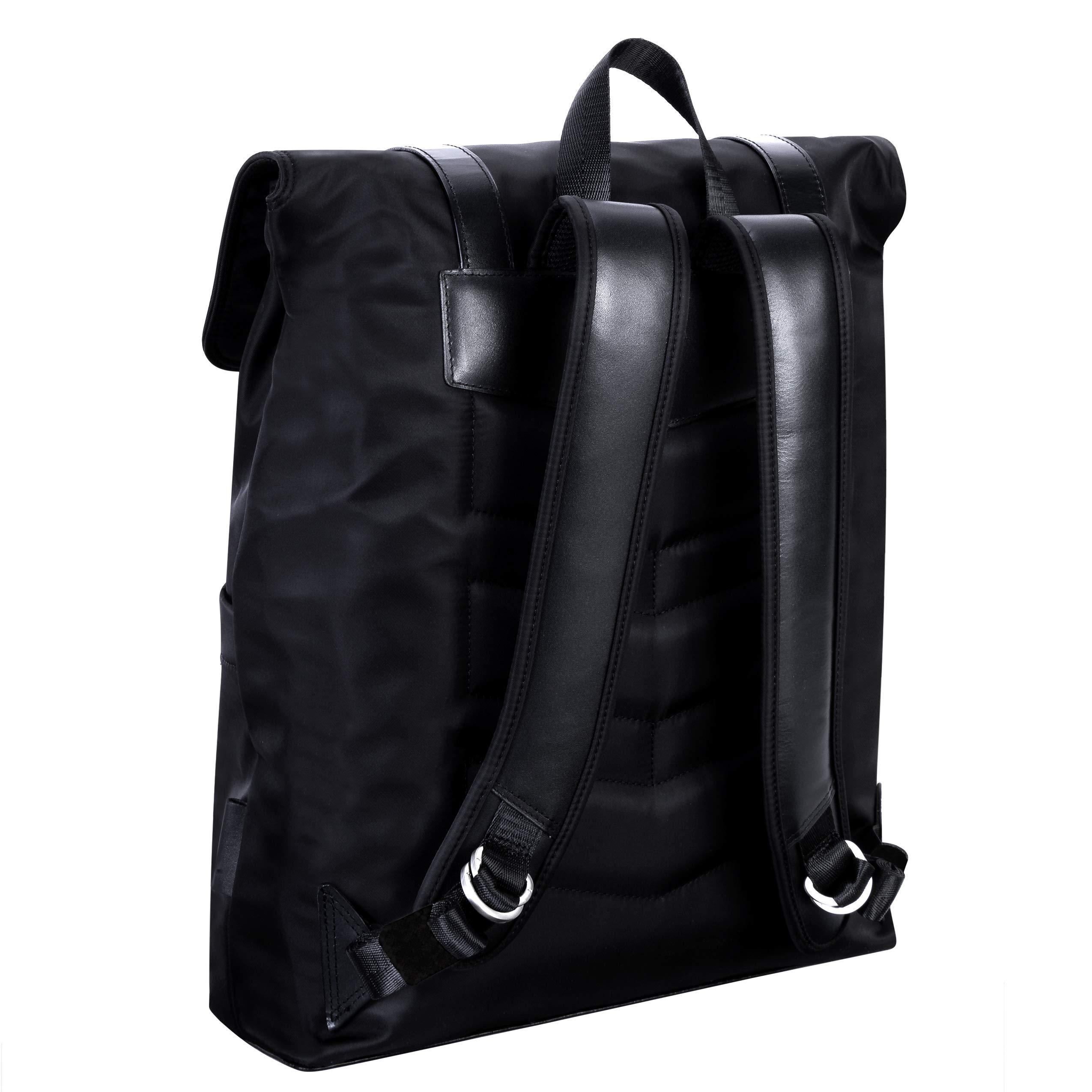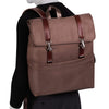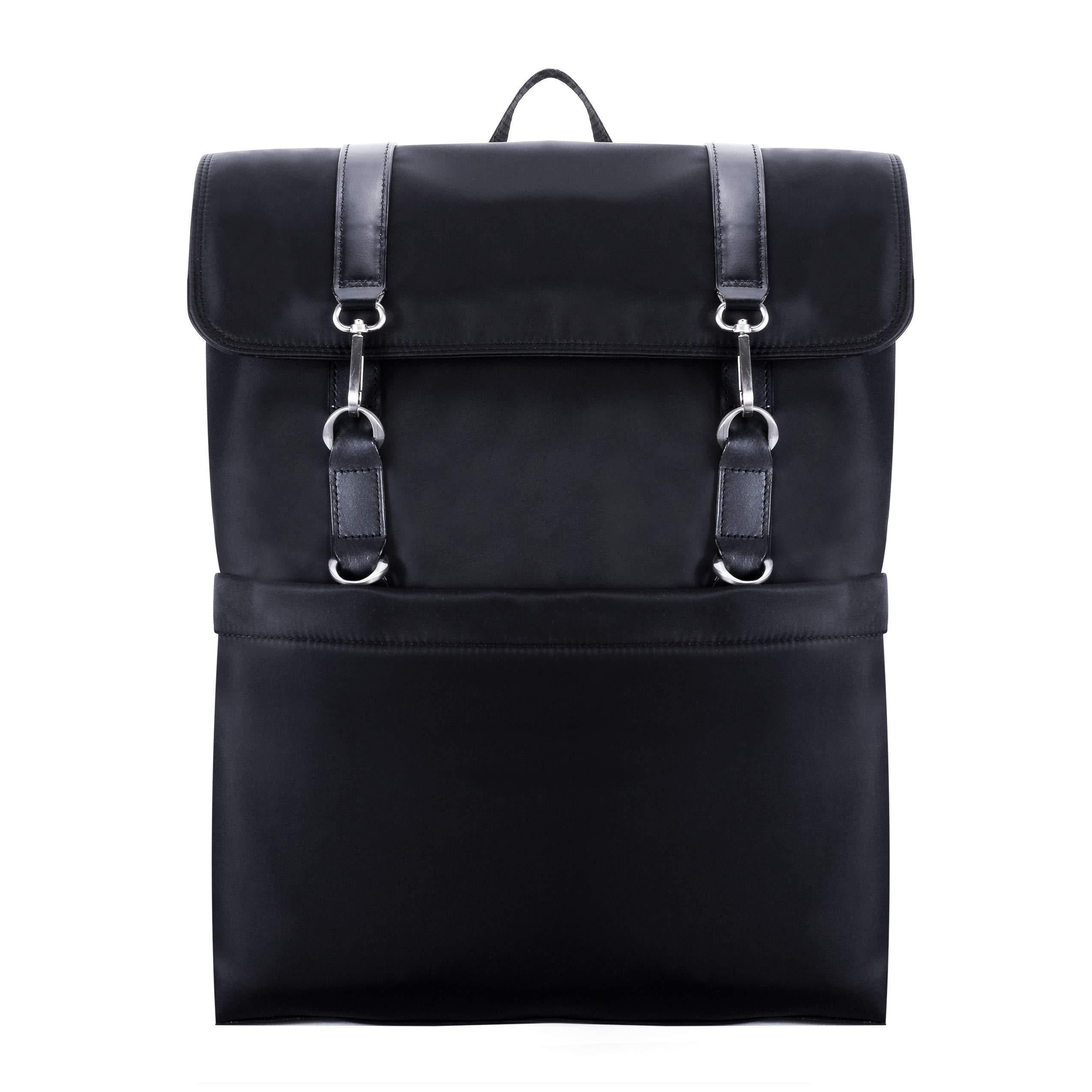 Adjustable dual clasp flap-over backpack. Fully-lined interior with leather accents with interior laptop compartment. Exterior front secure zipper pocket. Interior tablet pocket with organizer for business cards, pens, and accessories with interior secure zipper pocket. Silver accent hardware and metal zippers. Padded adjustable backpack straps with leather trim. Stylish comfort foam back padding to keep your back dry.