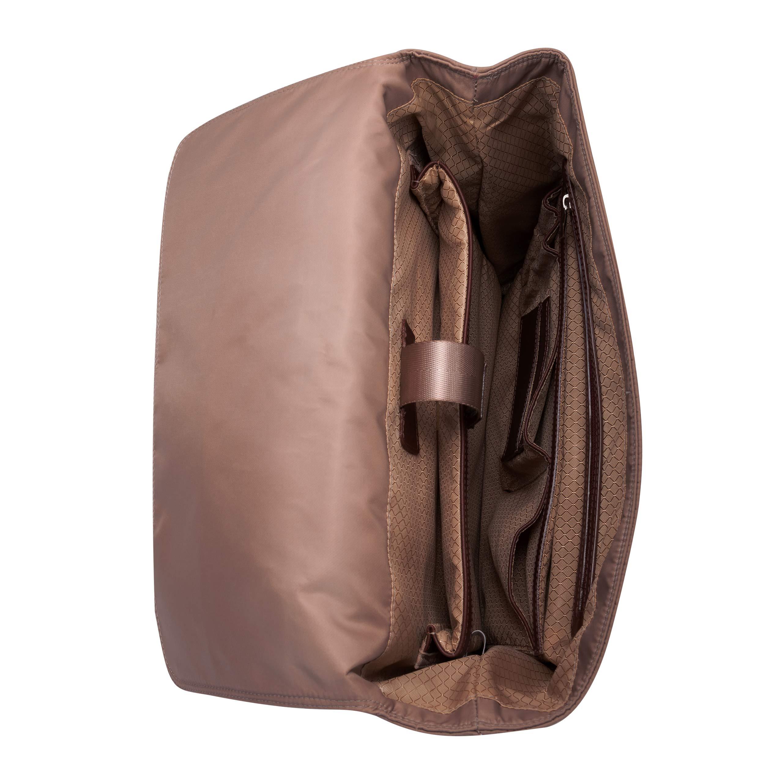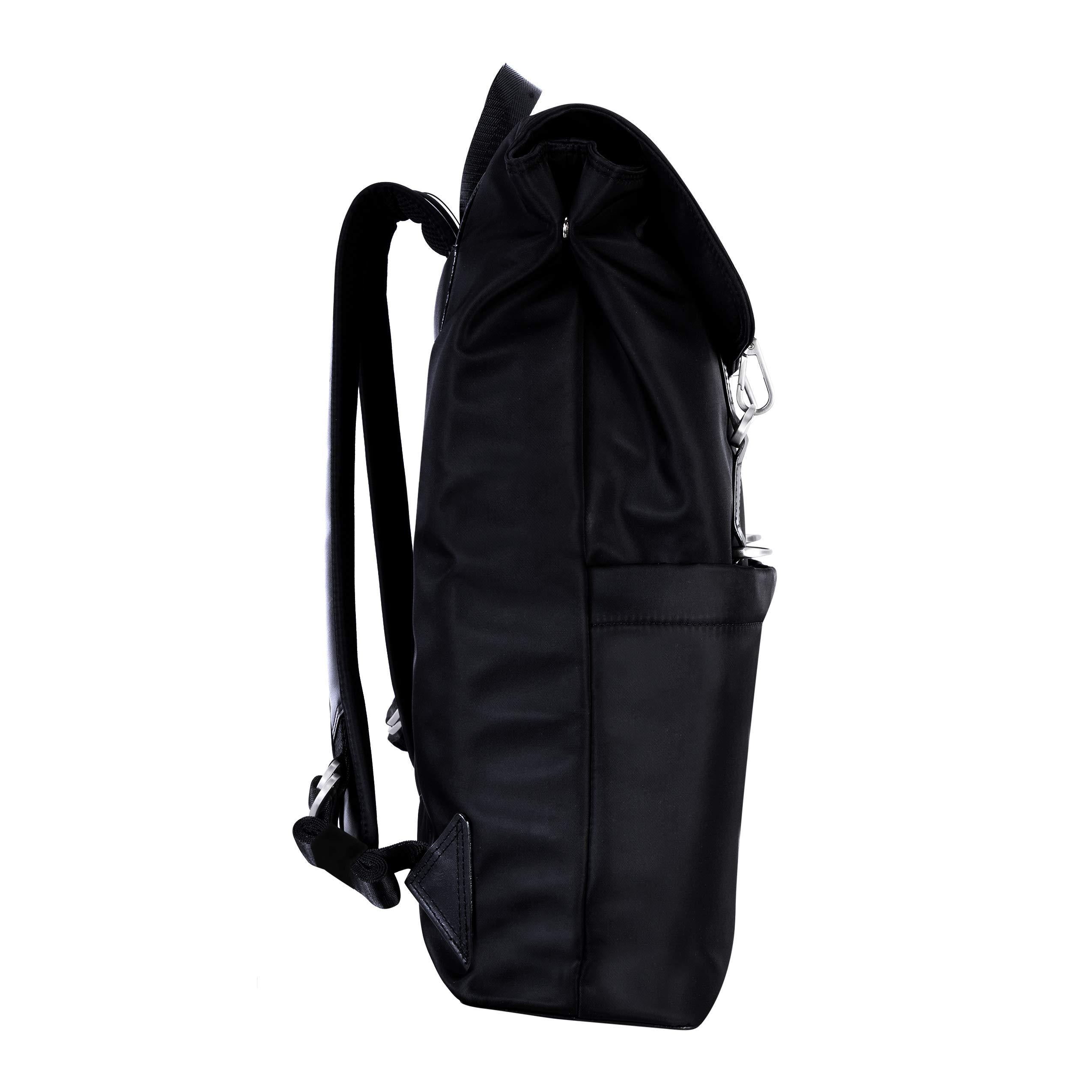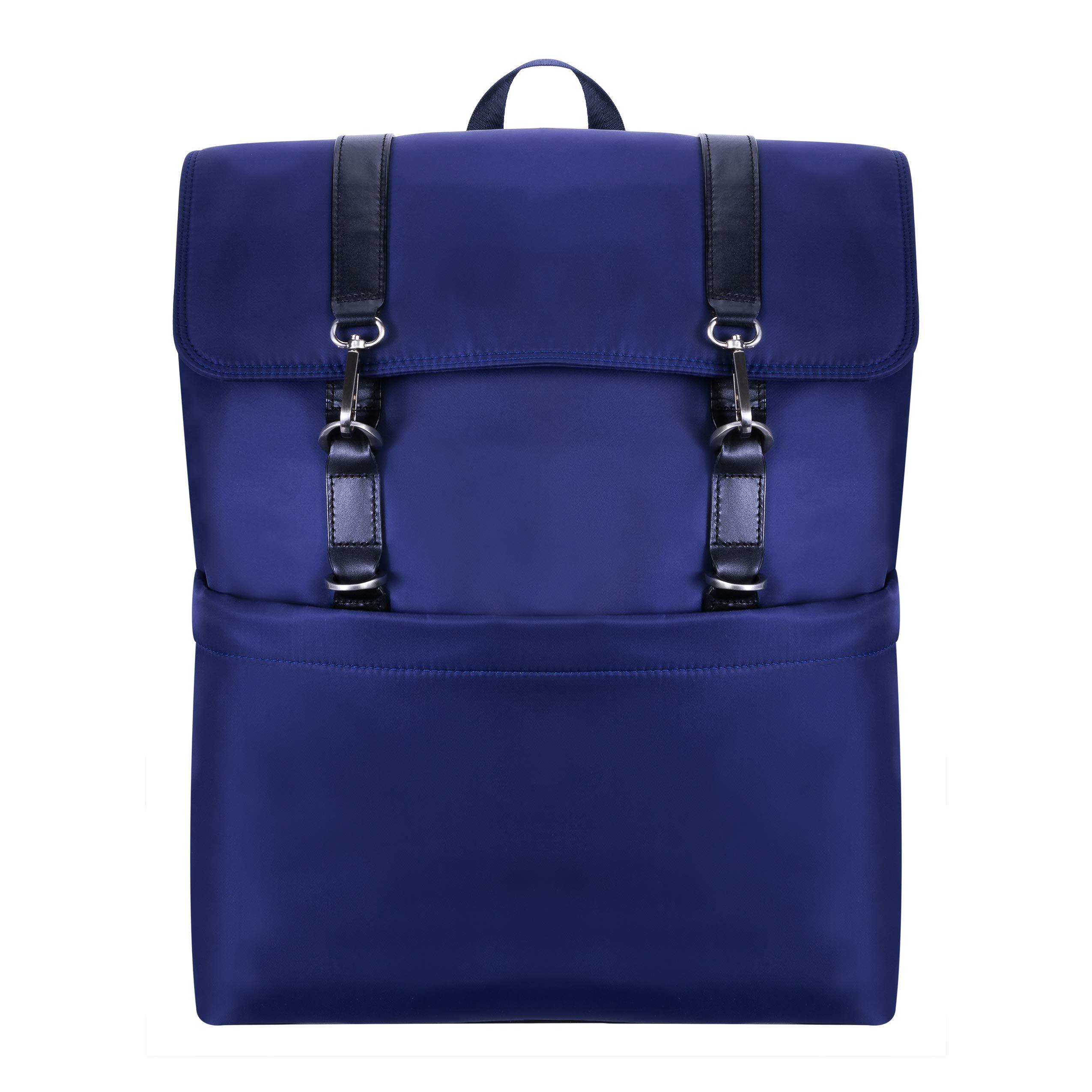Adjustable dual clasp flap-over backpack. Fully-lined interior with leather accents with interior laptop compartment. Exterior front secure zipper pocket. Interior tablet pocket with organizer for business cards, pens, and accessories with interior secure zipper pocket. Silver accent hardware and metal zippers. Padded adjustable backpack straps with leather trim. Stylish comfort foam back padding to keep your back dry.