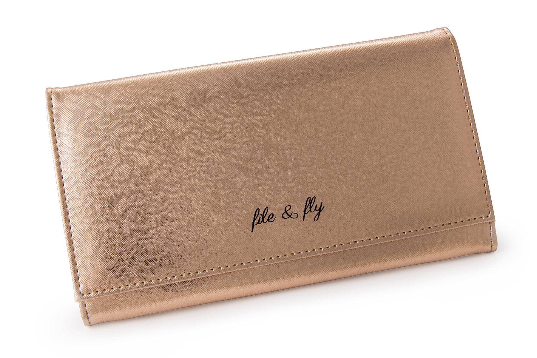 Your ID, boarding pass and credit cards will stay safe and organized on your next adventure with this fashionable gold file organizer.