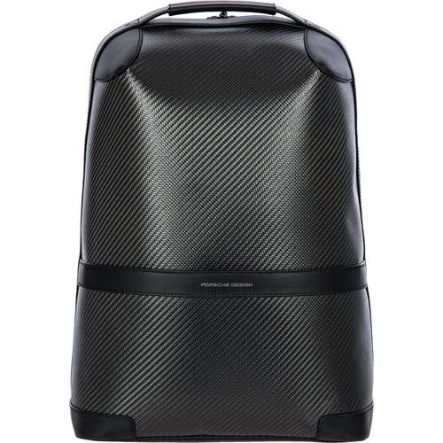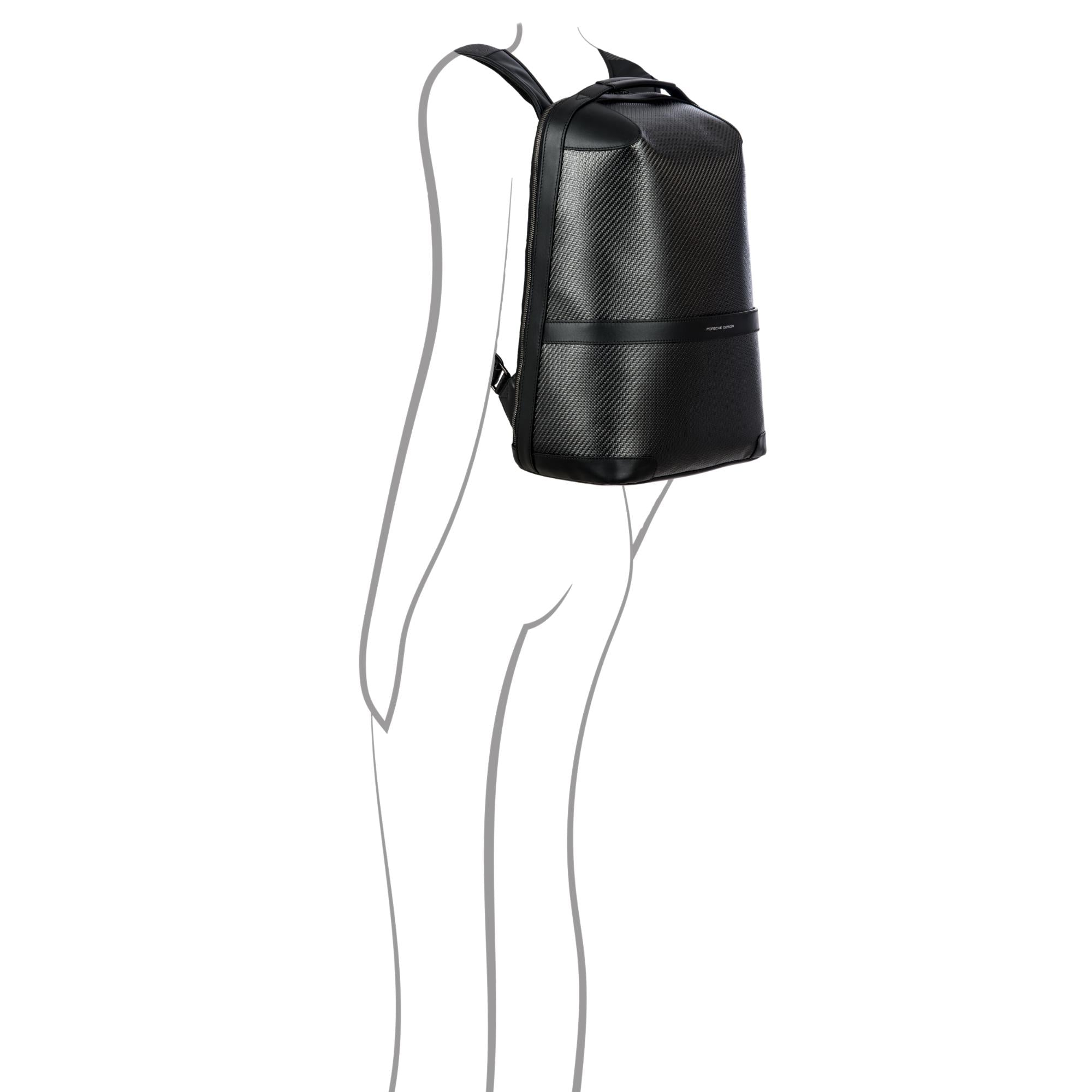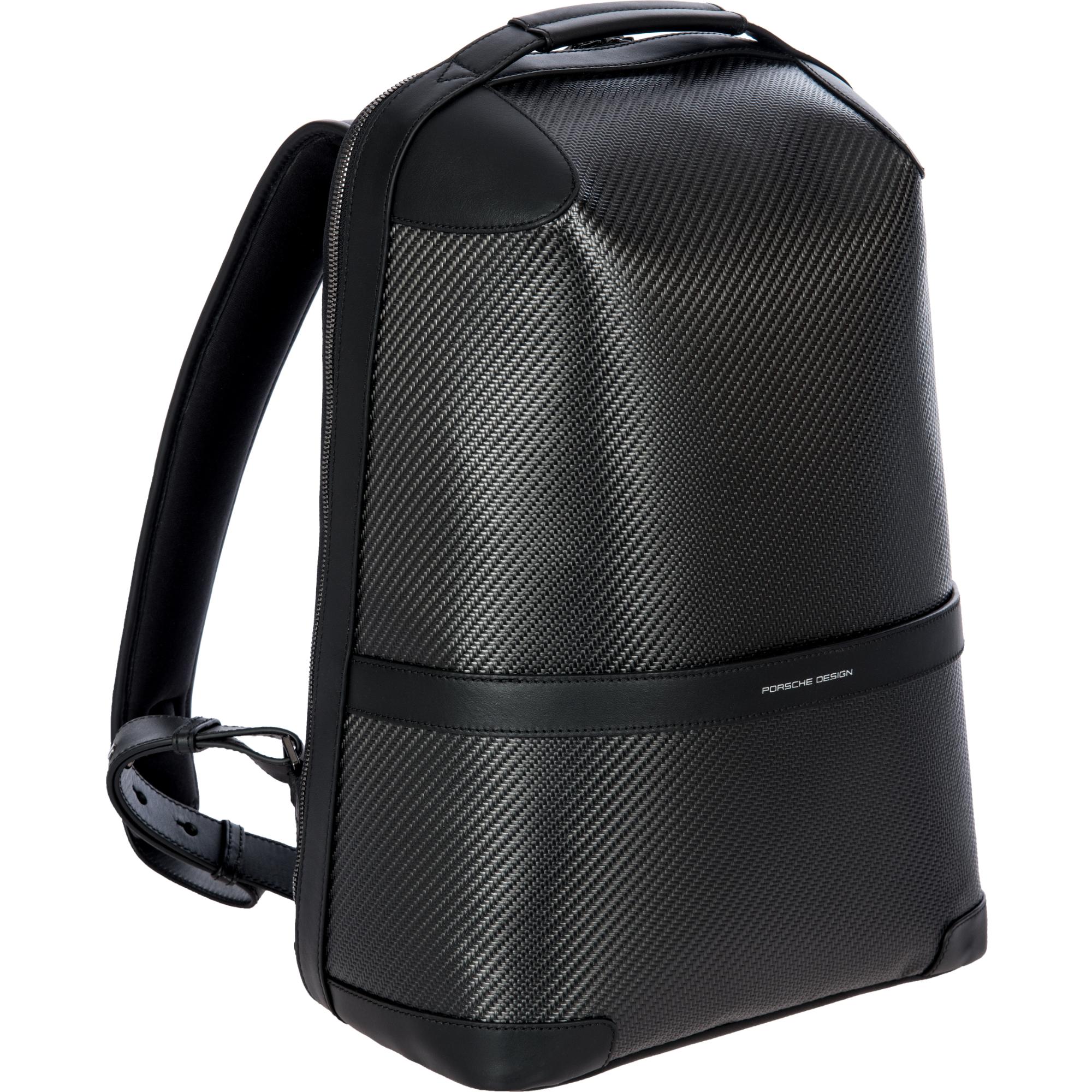 Fascination Carbon. The high-tech material from motorsport gives the Porsche Design Carbon Backpack - like all models in the Porsche Design Carbon Collection - its unmistakable design DNA. Lightweight, textured carbon fiber fabric and the finest box calf leather, combined in an iconic, minimalist design, make this backpack an exclusive, timelessly stylish companion. The new model variant is characterized by optimum comfort and functionality. The improved design with backward offset zipper makes access to the large main compartment with 15'' notebook compartment even easier. The integrated business organizer with key fob and compartments for mobile devices, card holder and cables provides perfect structure and quick accessibility. Also, the slide-in compartment on the front is now even more convenient to use, thanks to a magnetic closure. Comfortable, padded, adjustable shoulder straps, a padded back panel and a trolley link ensure that the high-tech backpack not only looks unique on trips and during leisure time, but is also just as comfortable to wear.