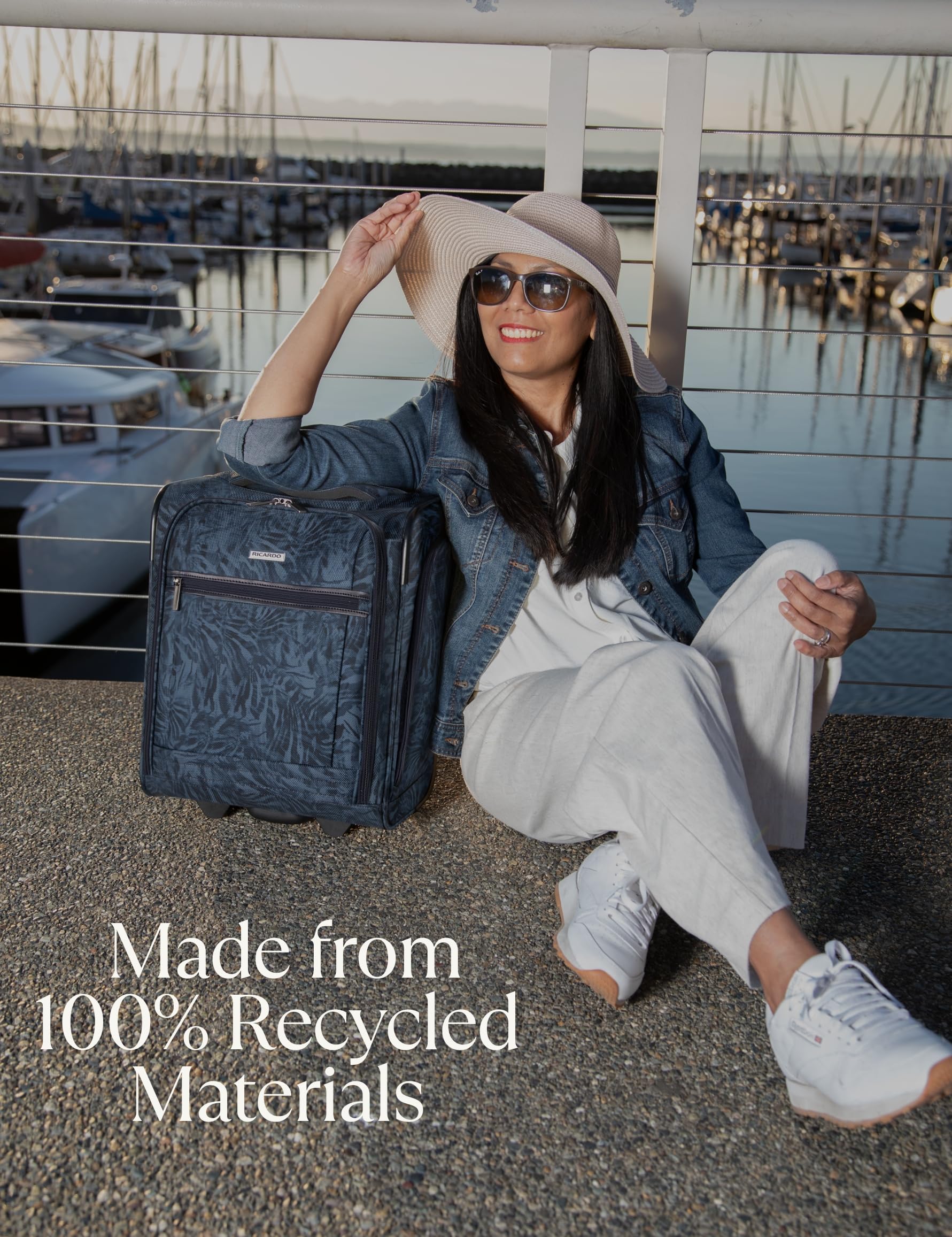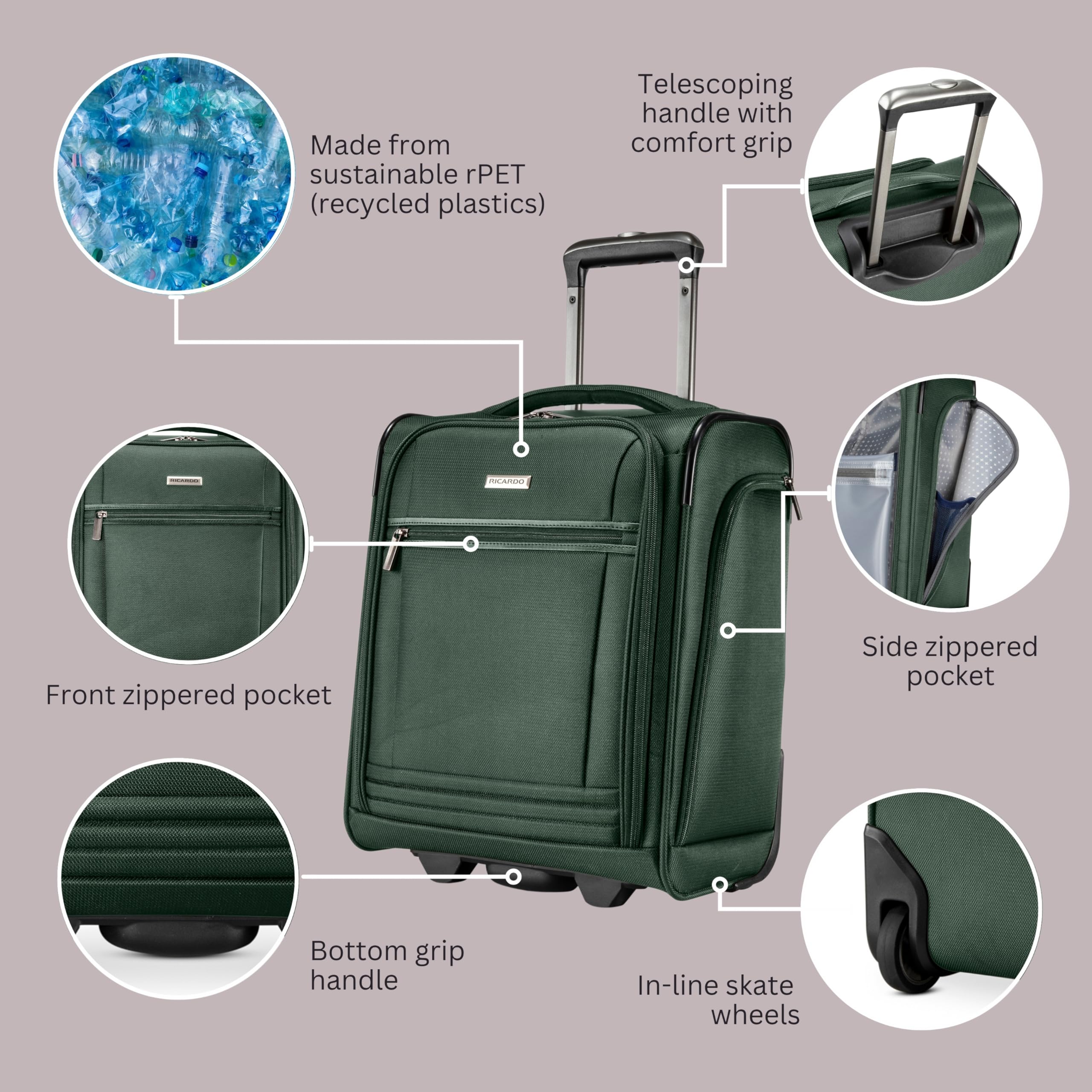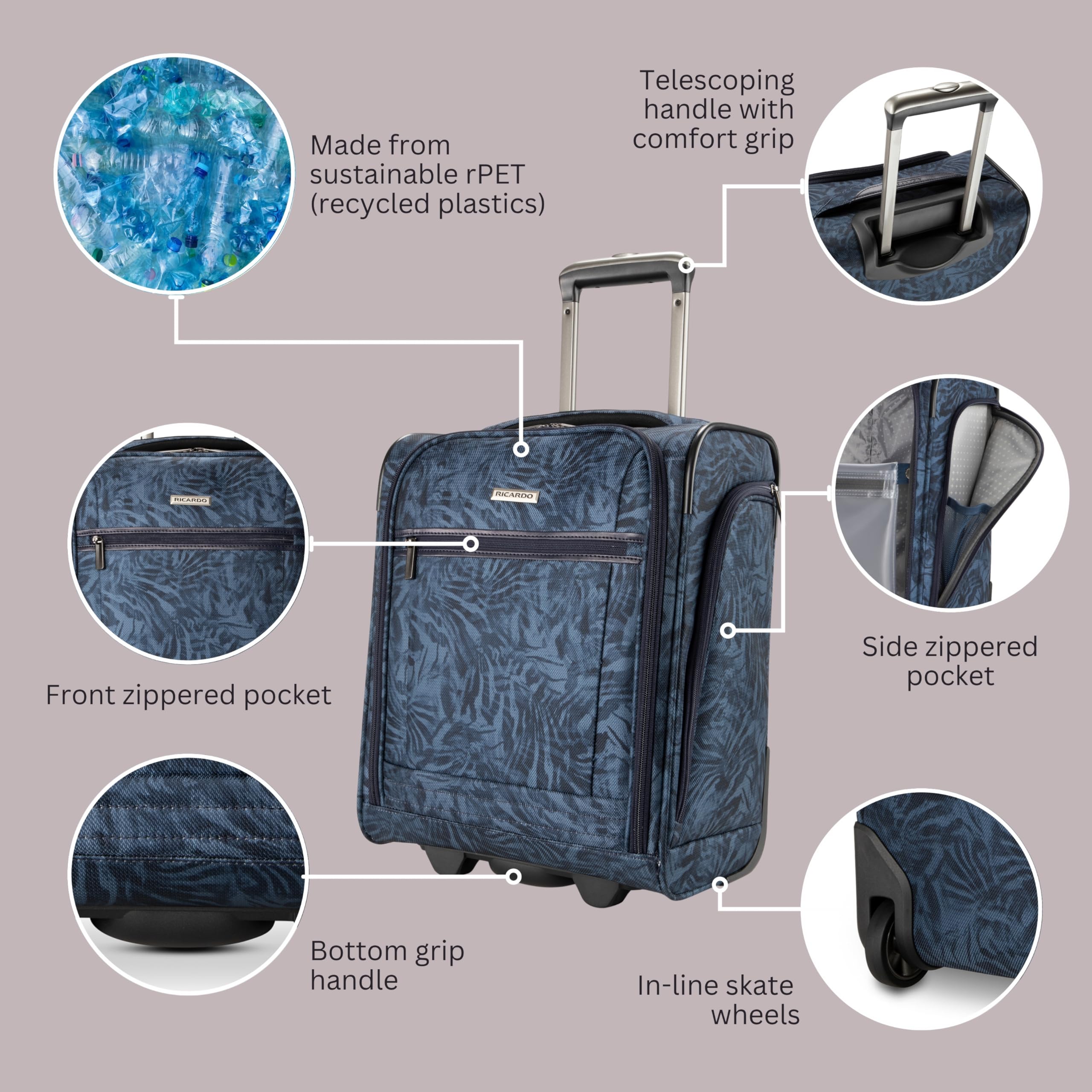 Pack light, travel right. The Ricardo Avalon USB Small Carry-On is your go-to for short trips and sustainable escapes. Made from eco-friendly rPET, this compact carry on luggage fits under most airline seats while offering big featureslike in-line skate wheels, a telescoping handle, and reinforced corner protectors for smooth, durable travel. Thoughtful touches include interior zippered pockets, a removable 3-1-1 wet pouch for travel size travel products, and quick-access compartments for all your travel essentials. Smart. Stylish. Ready when you are.