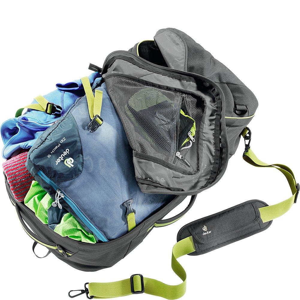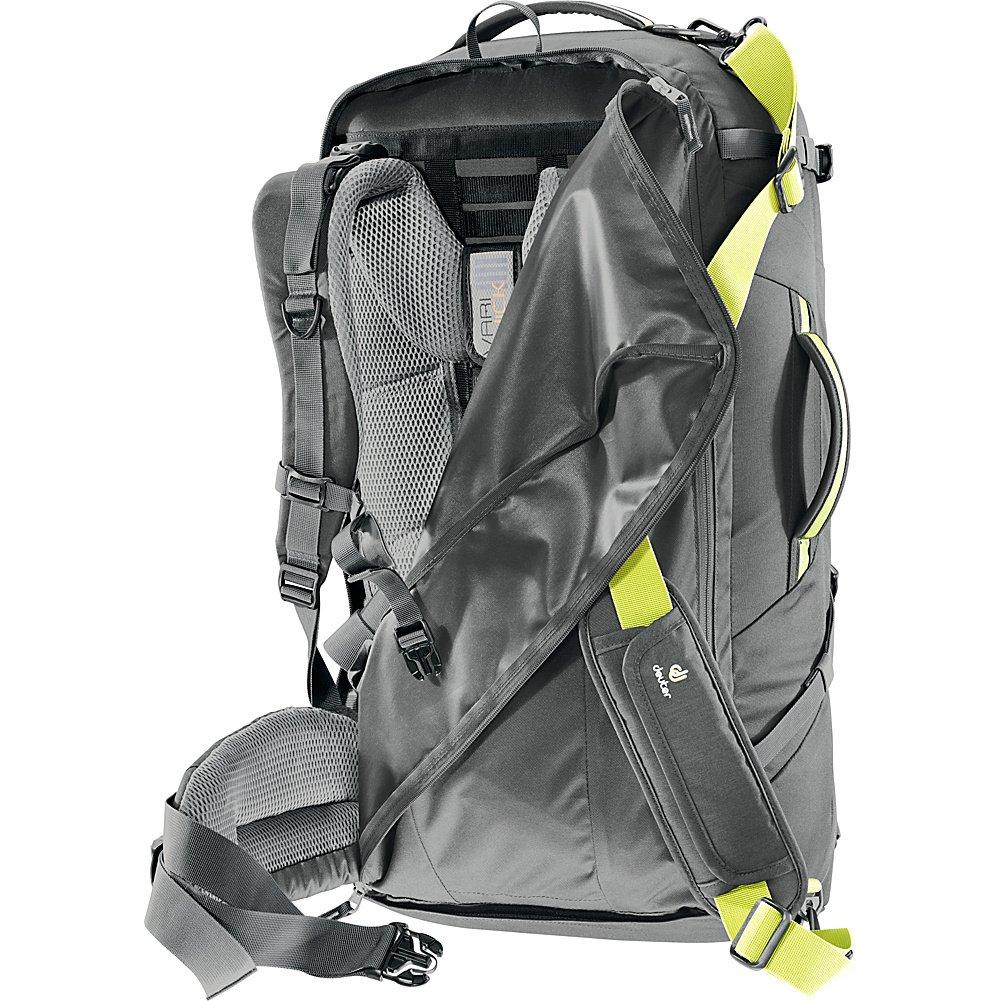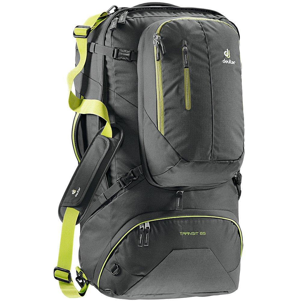 The Deuter Transit 65 travel pack is an innovative two-in-one luggage set.With a compact, detachable daypack, a U-shape easy-access zip, and a storagecompartment for shoes or a sleeping bag, this backpack-duffel hybrid has youcovered no matter your itinerary. Lightweight and comfortable, this bag easilytransitions from the airport to the subway and from the streets to the trail.